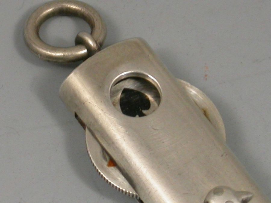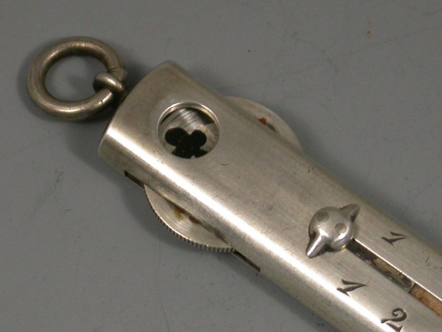 An early 20th century sterling silver slide action Carpenters' style Pencil, the case engraved with two scales 1 - 5 and 1 - 10, the top of the pencil set with a rotating wheel displaying enamelled trumps symbols, hearts, spades, diamonds and clubs, with attached suspension ring.