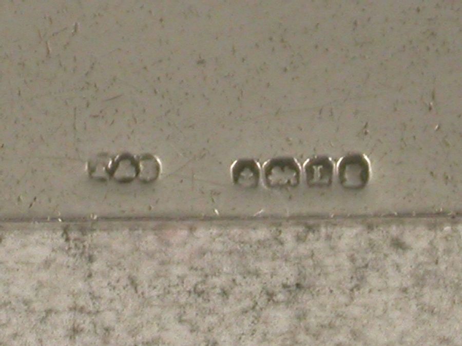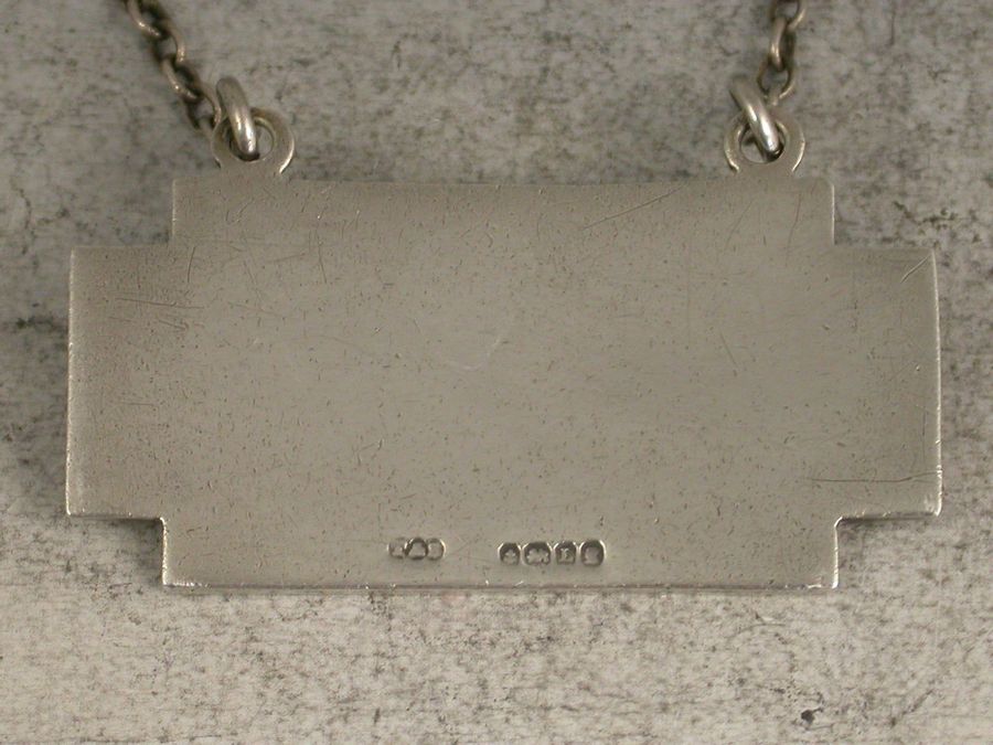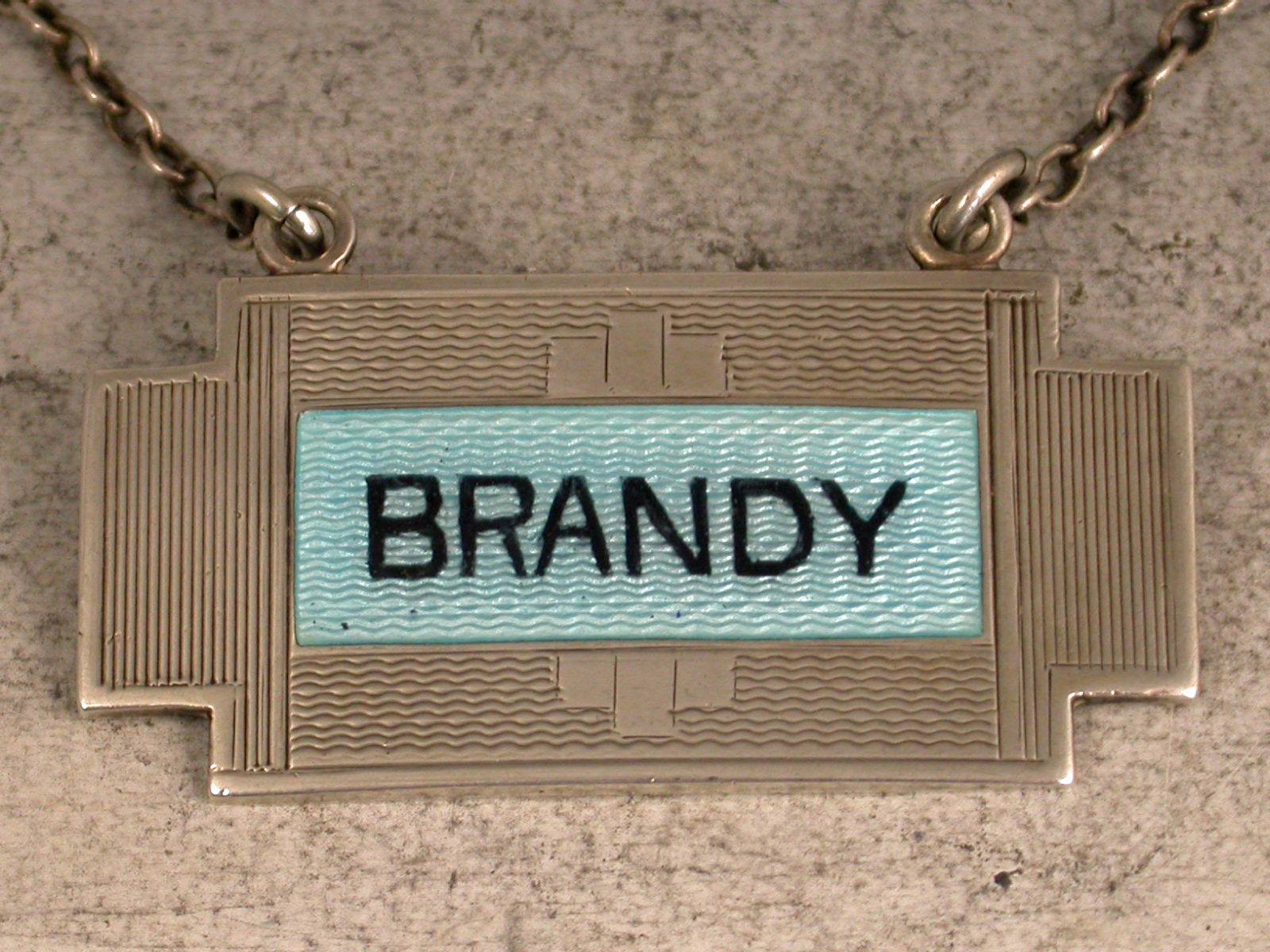 A fine early 20th century silver and enamel Wine Label from the Art Deco period, of rectangular form with raised eyelets and right angled cut-corners, engine turned bacground with engraved cubes above and below the name plate enamelled in black for Brandy on a sky blue guilloche enamel panel. (A virtual pair to the Sherry of 1933 that I also have in stock EBPP100912B).