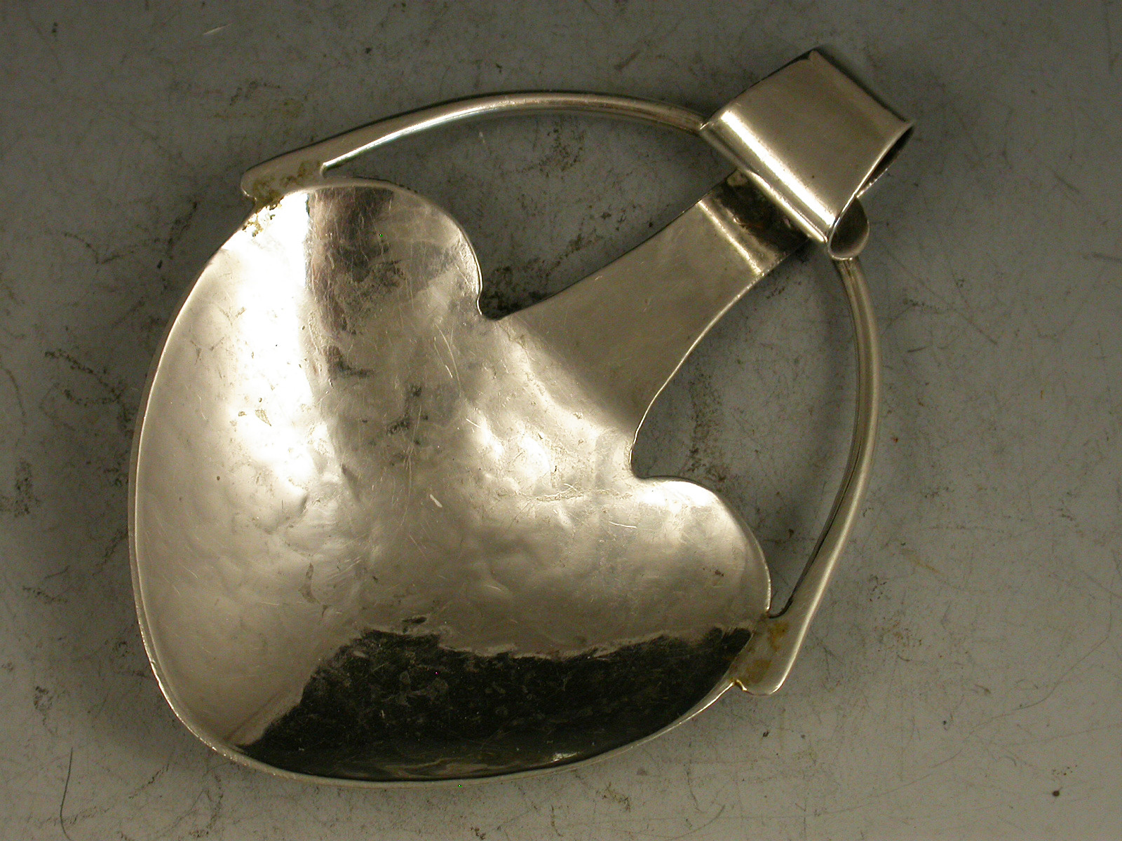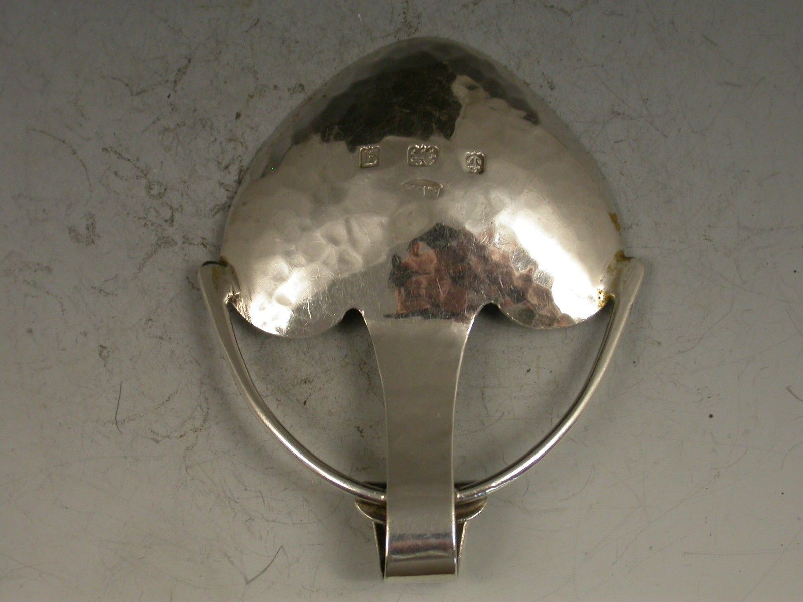 A good quality early 20th century hammered silver Caddy Spoon, made in the Arts & Crafts style with heart shape bowl and curled over handle with two wire supports.