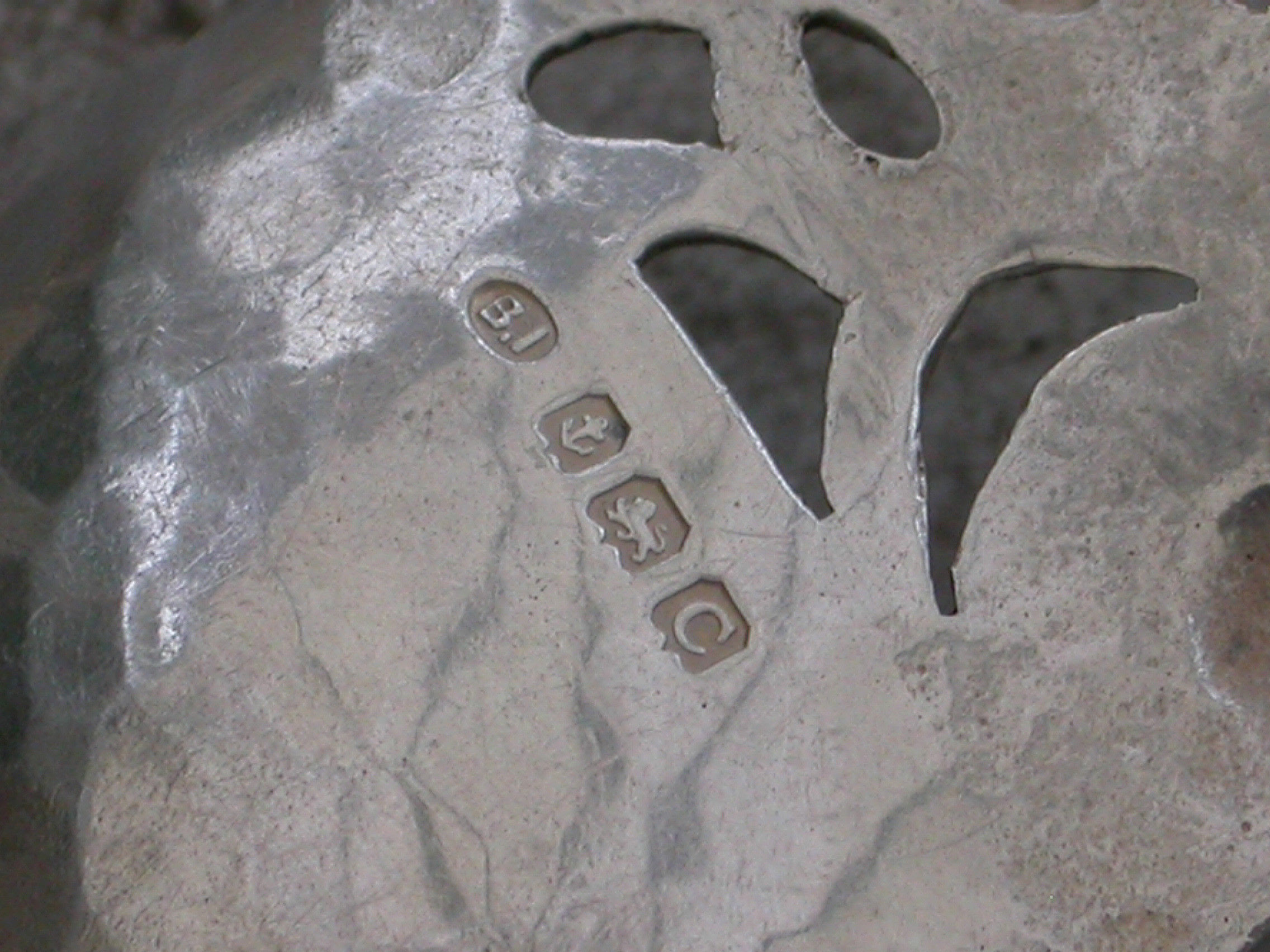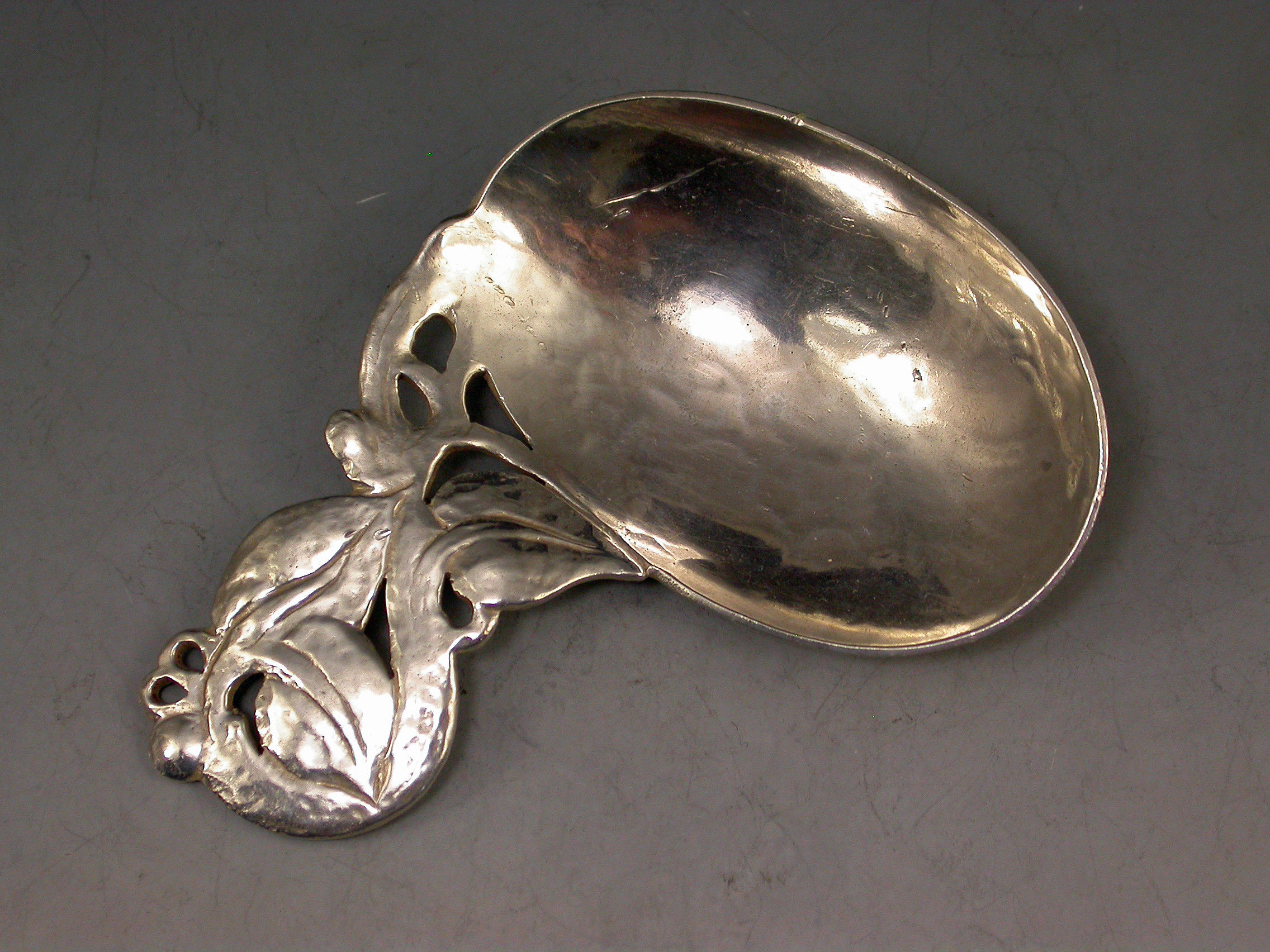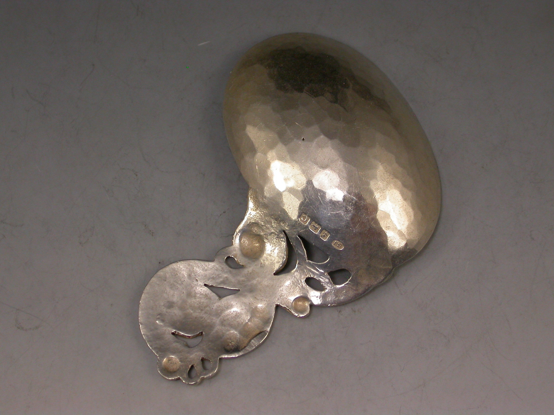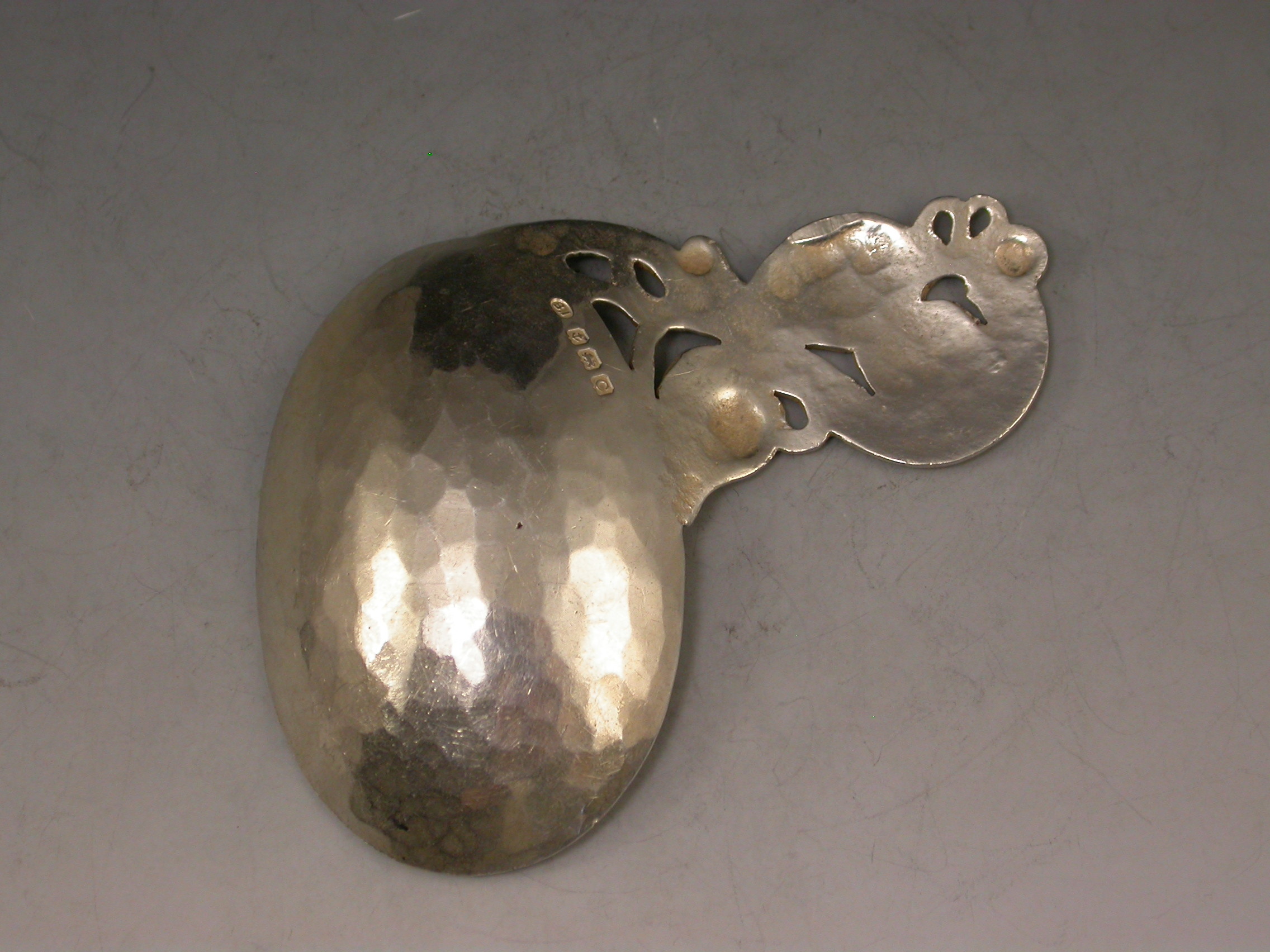 A good quality early 20th century hammered silver Caddy Spoon made in the Arts & Crafts style, with oval bowl and pierced entwined leaf and berry handle.