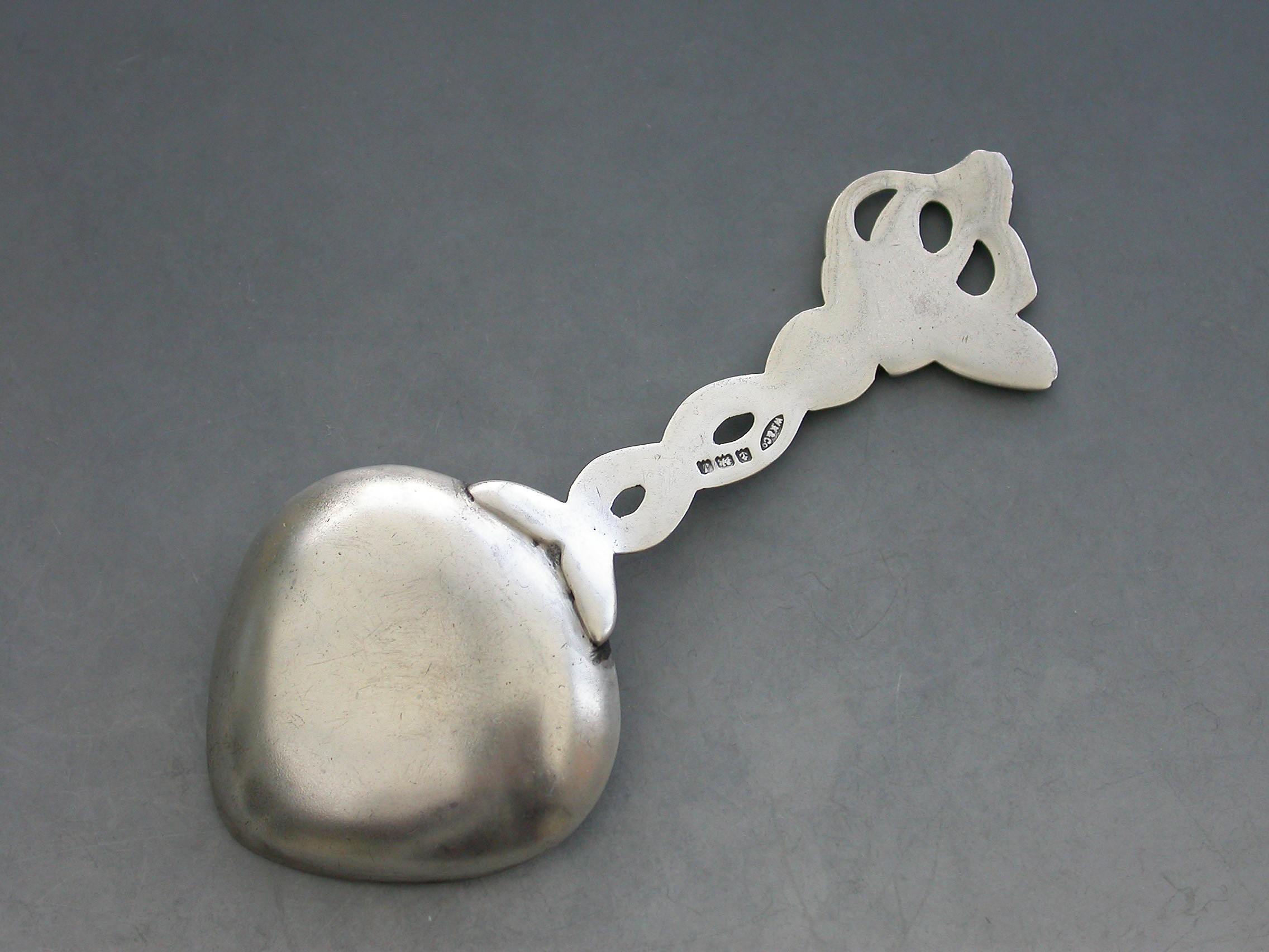 An early 20th century cast silver Caddy Spoon made in the Arts & Crafts style with hammered pear shaped bowl, pierced twisted handle with fish terminal.