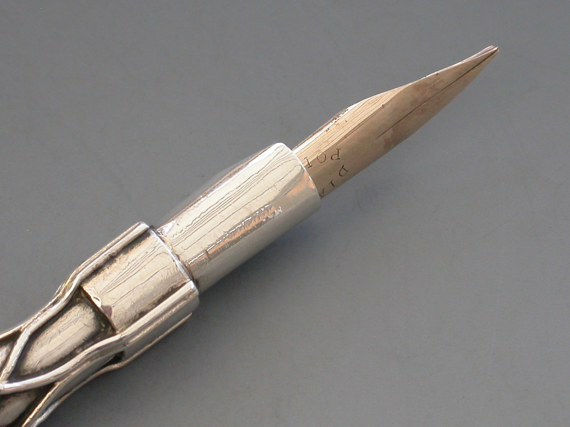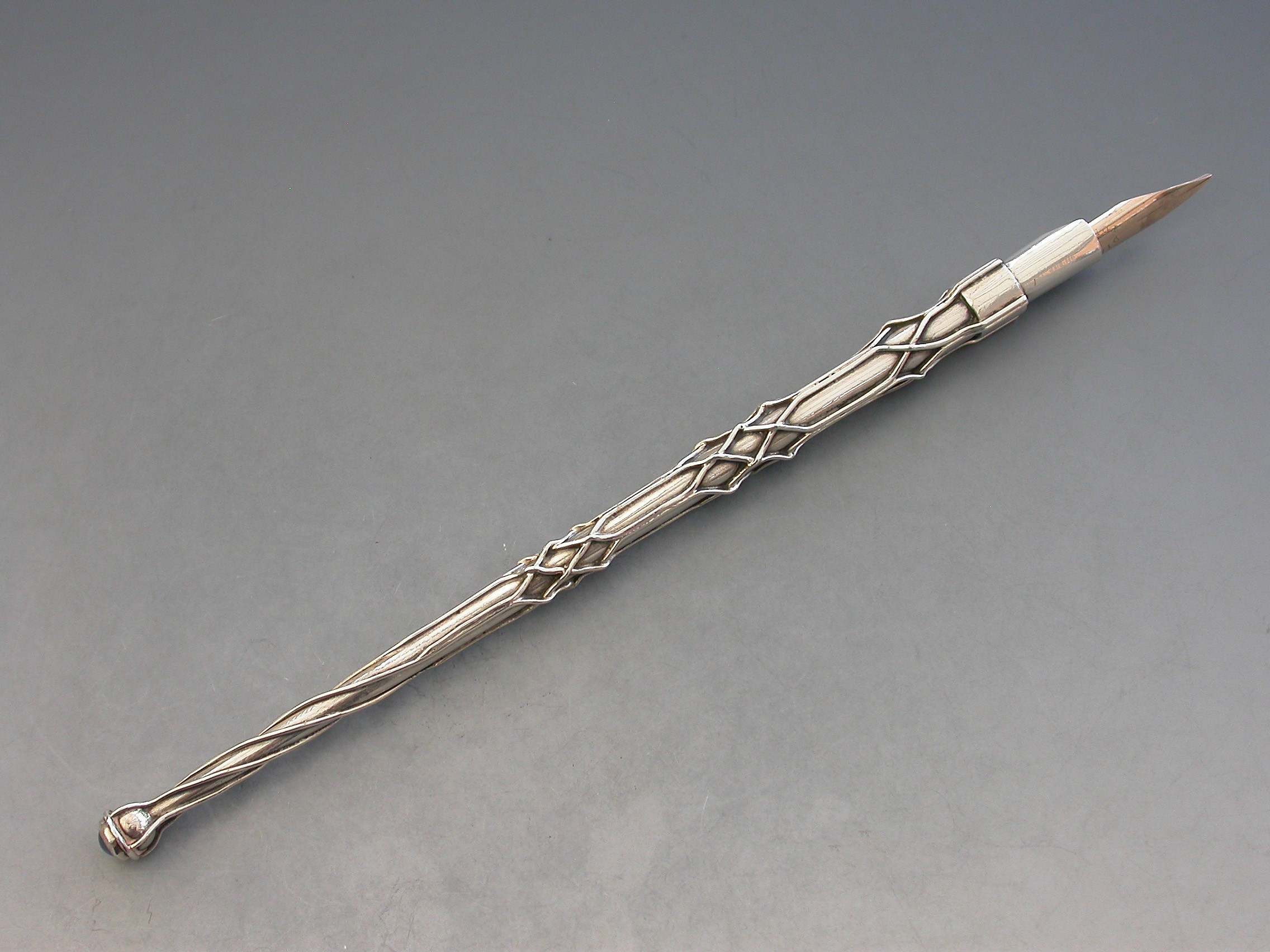 A rare early 20th century silver Dip Pen made in the Arts & Crafts style, the tapering stem applied with twisted wire cagework decoration, the terminal set with moonstone. Complete with a gold nib.