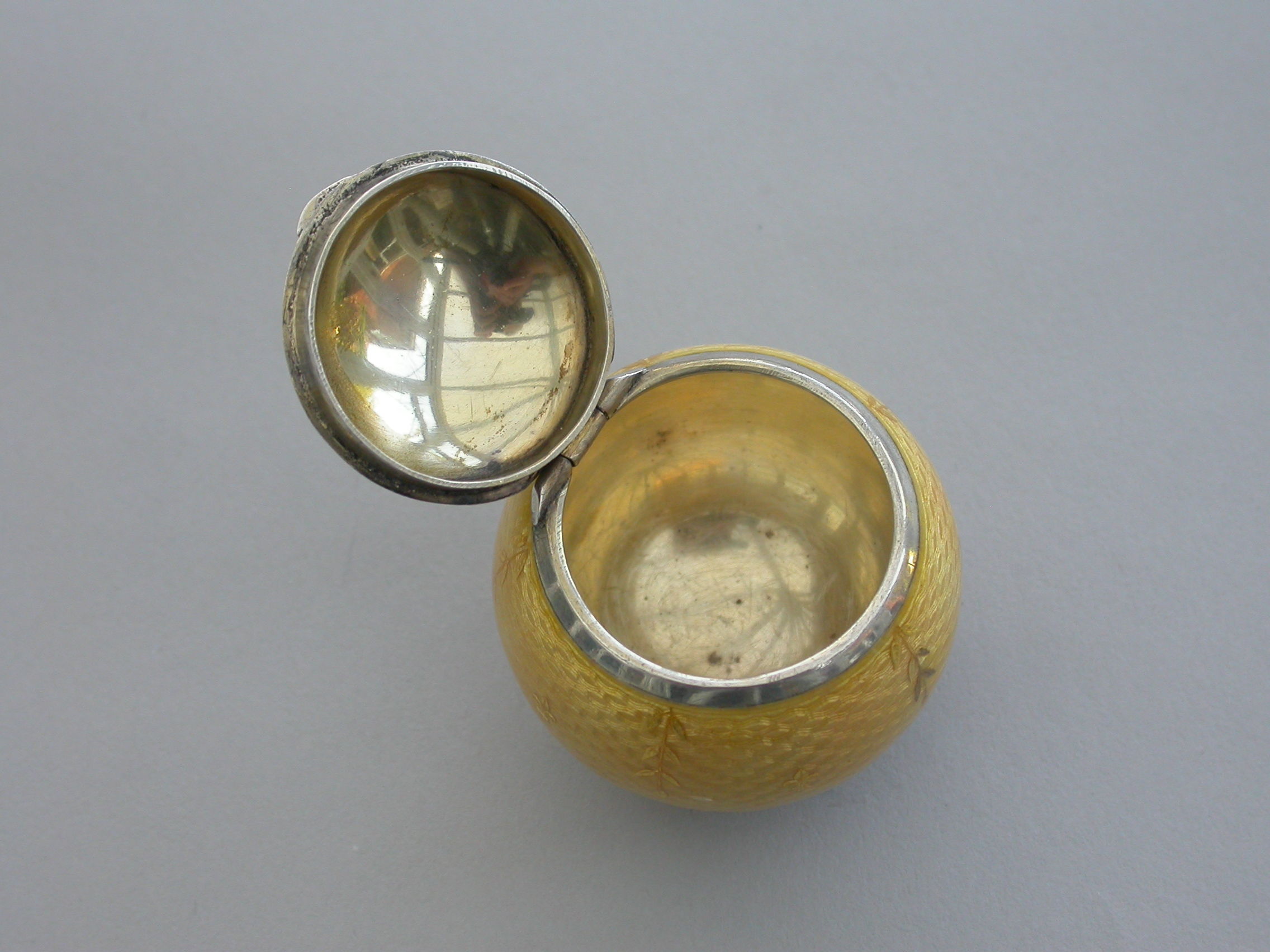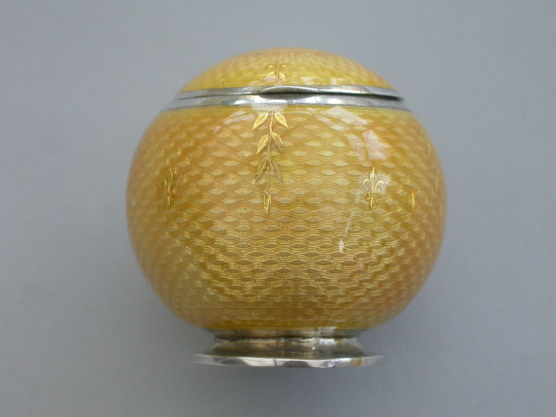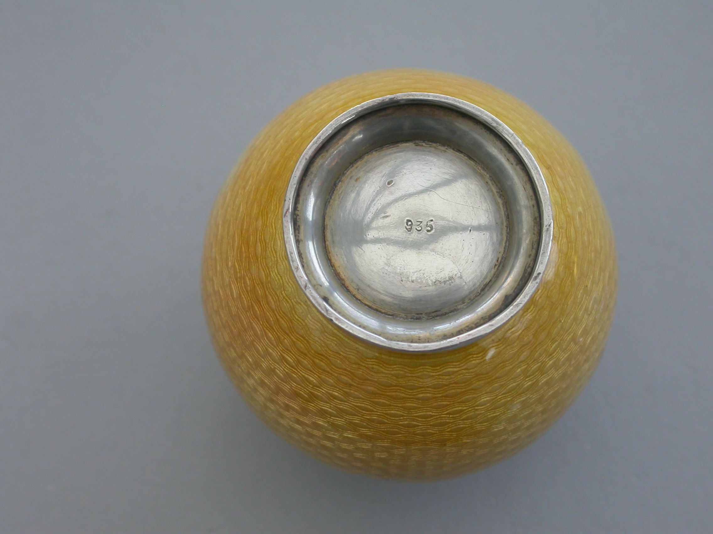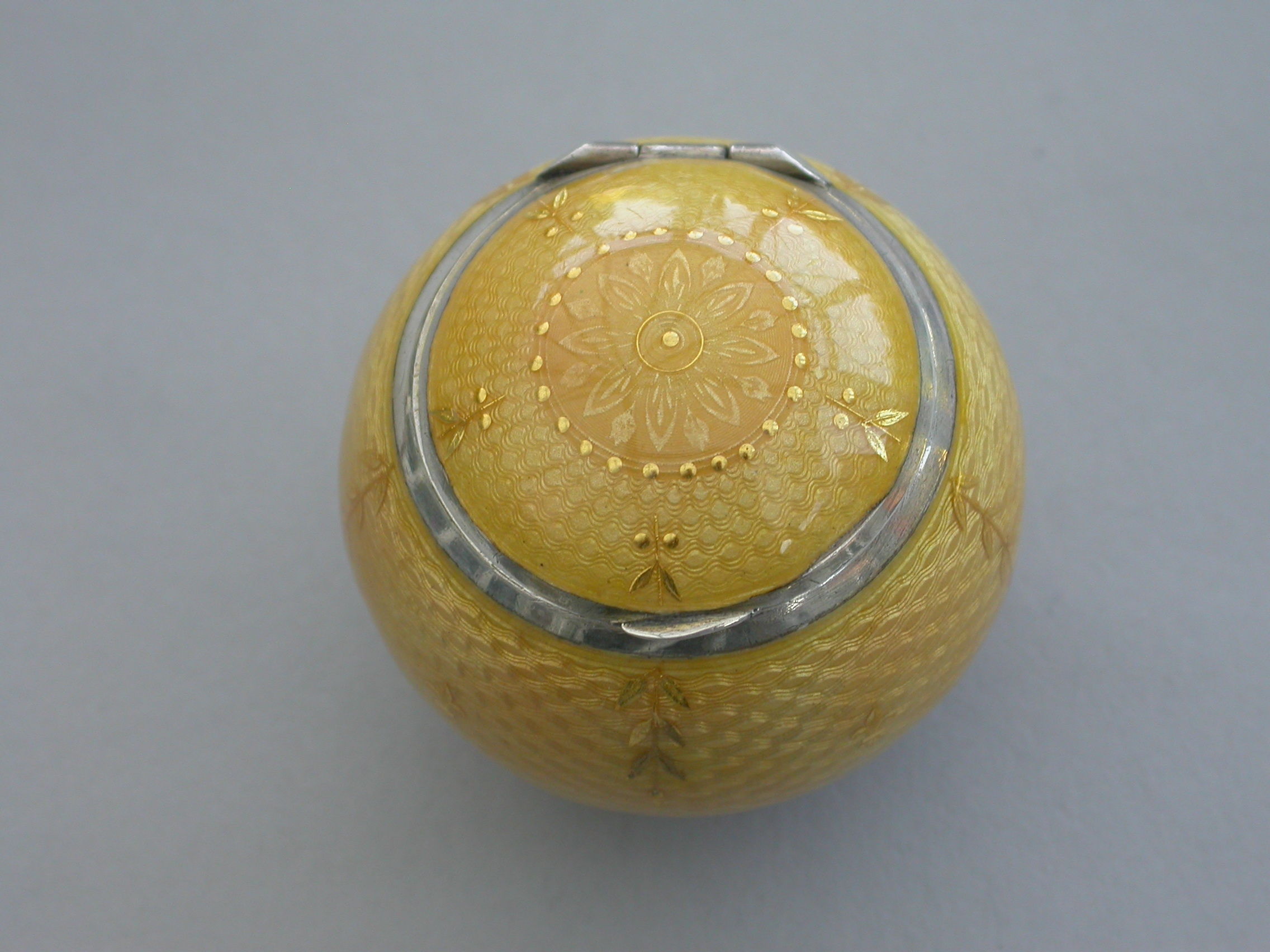 An early 20th century Austrian .935 standard silver and yellow guilloche enamel Pill Box of spherical form, with hinged lid and silver gilt interior.