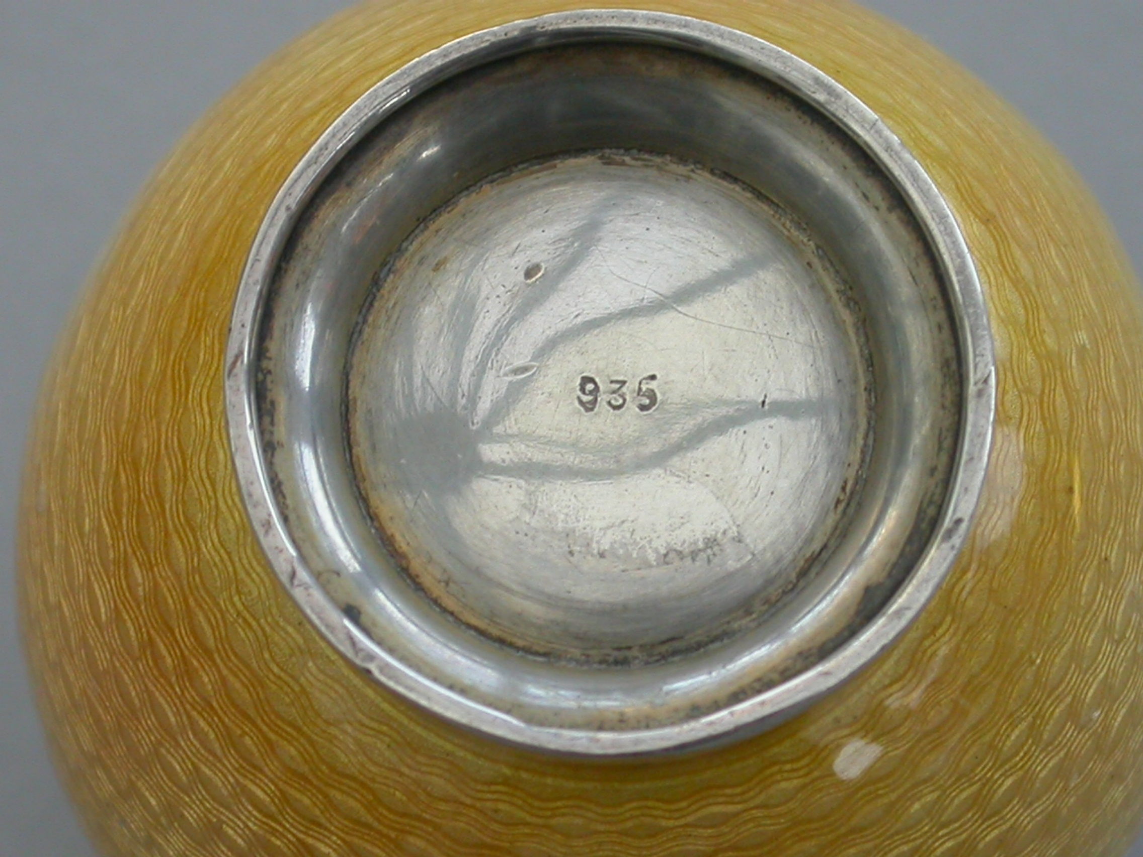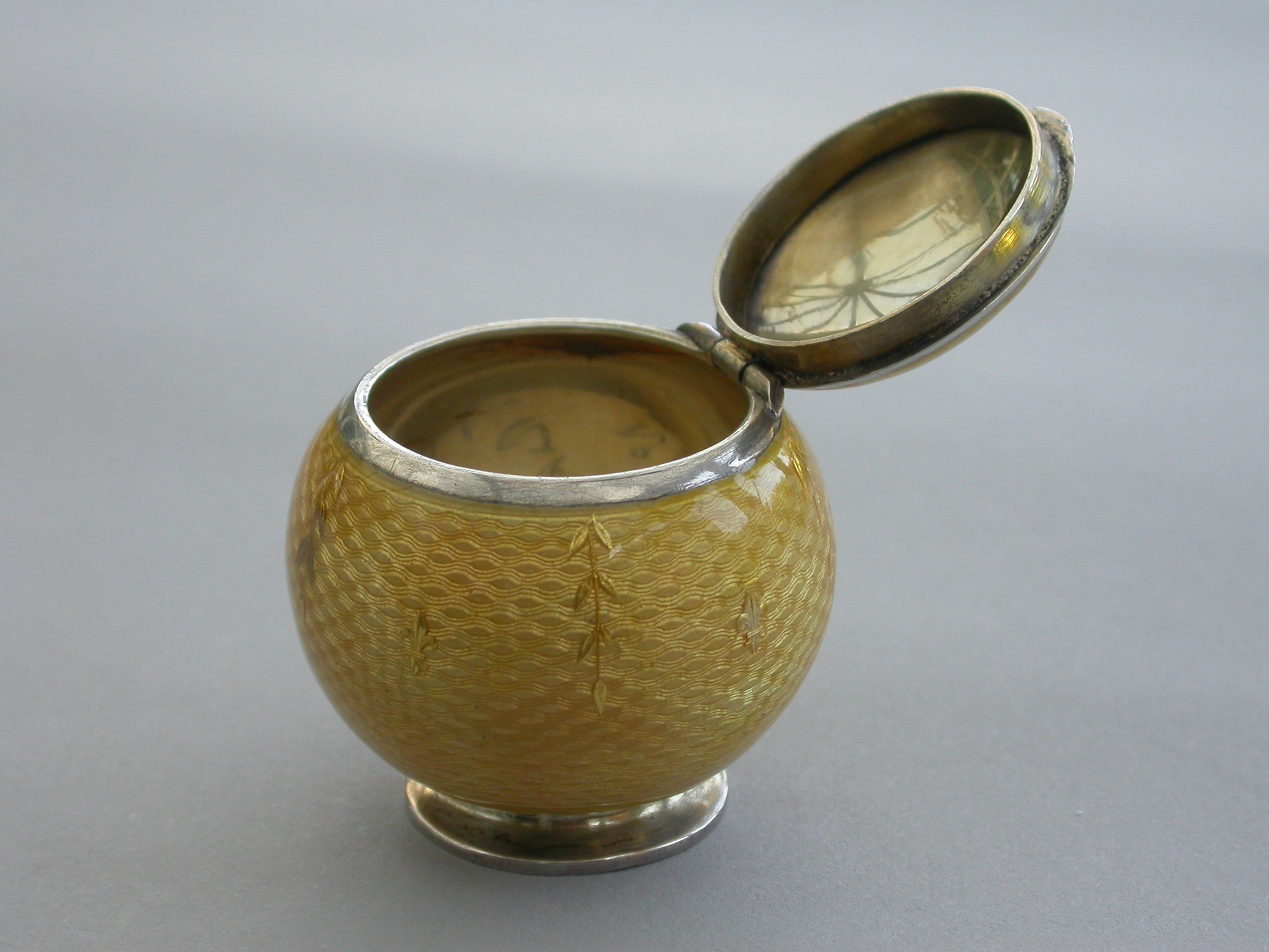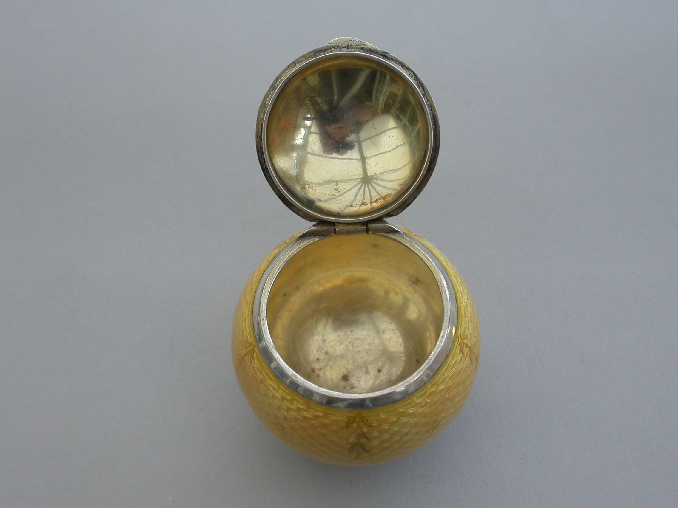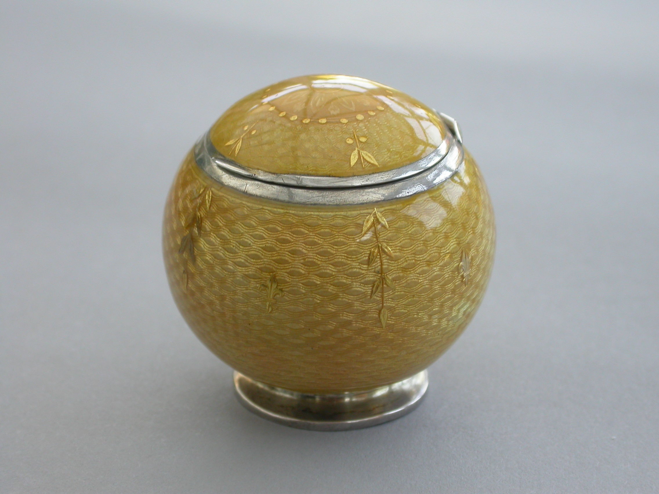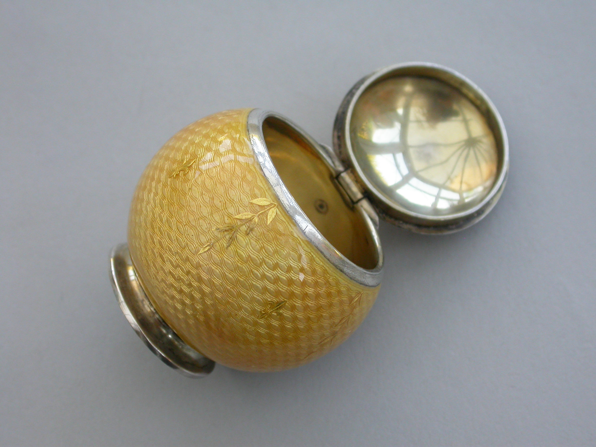 An early 20th century Austrian .935 standard silver and yellow guilloche enamel Pill Box of spherical form, with hinged lid and silver gilt interior.