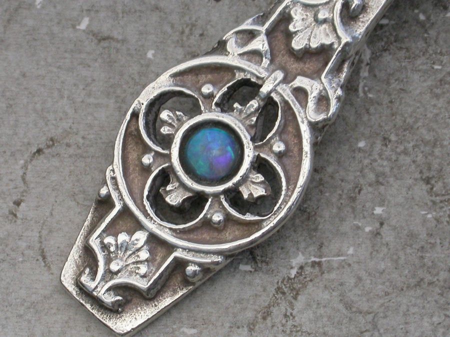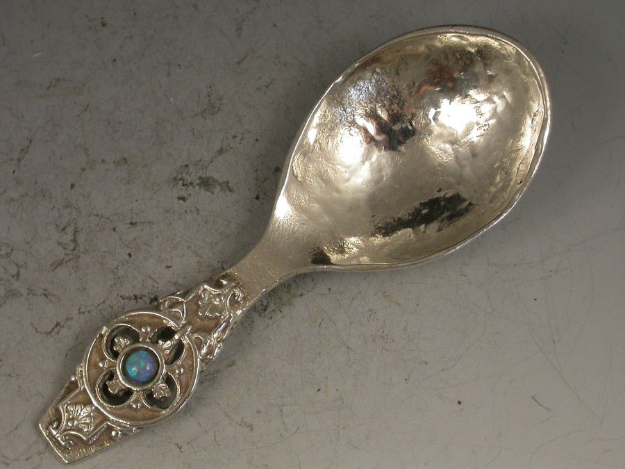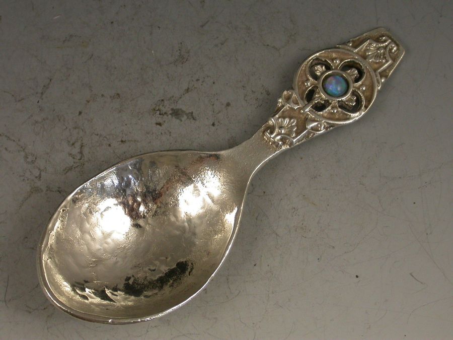 A good quality early 20th century cast hammered silver Caddy Spoon with plain oval hammered bowl, the pierced Celtic design handle set with an opal.