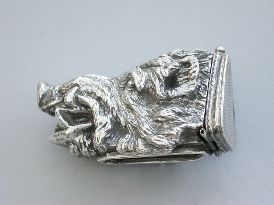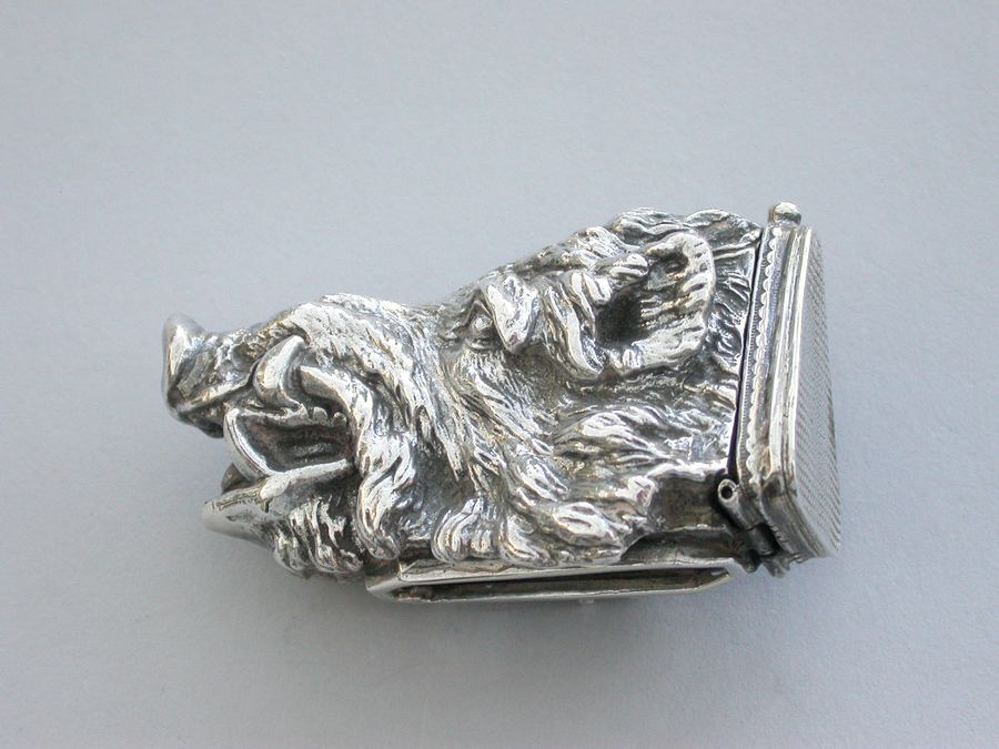 A rare and unusual early 20th century heavy cast silver Vesta Case made in the form of a wild boars head, the hinged lid engraved as the striker.