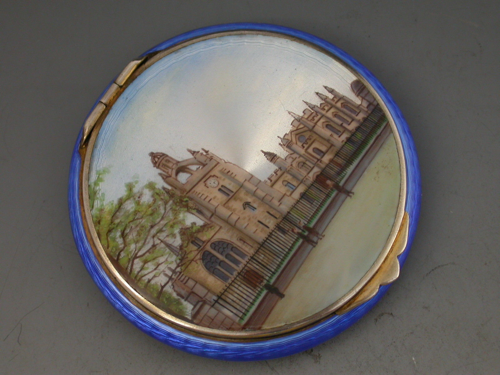 A rare and unusual early 20th century silver gilt and guilloche enamel Compact of circular form, the base with striking blue guilloche design, the lid decorated with a view of Kings College University in Aberdeen, Scotland. The silver gilt interior with powder compartment with revolving cover and a mirror to the interior lid.