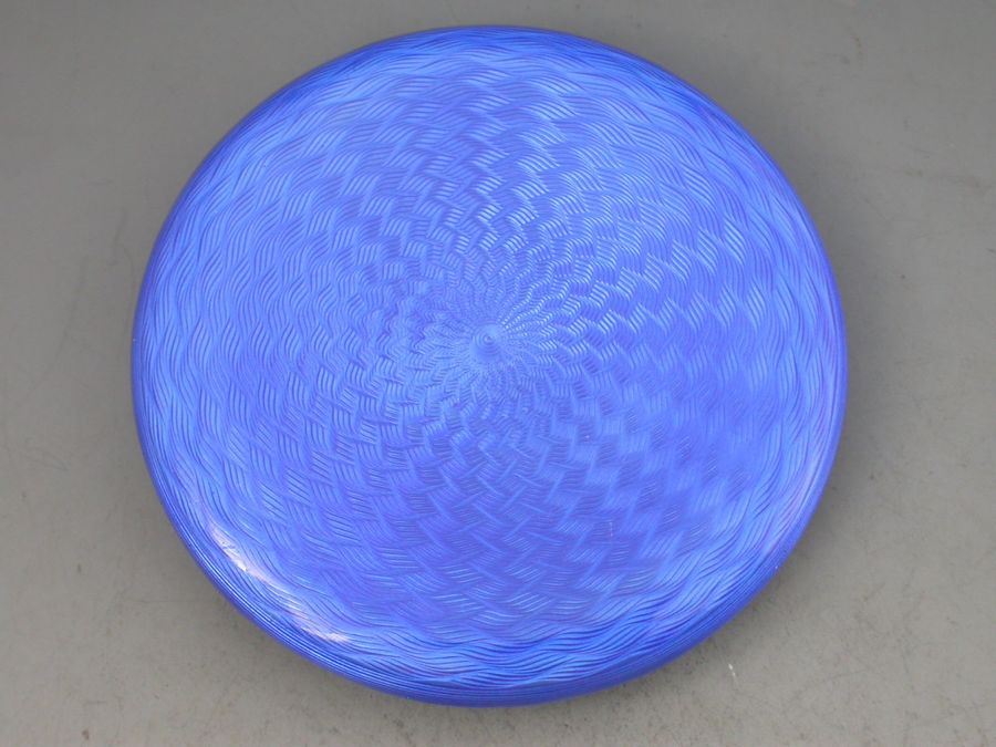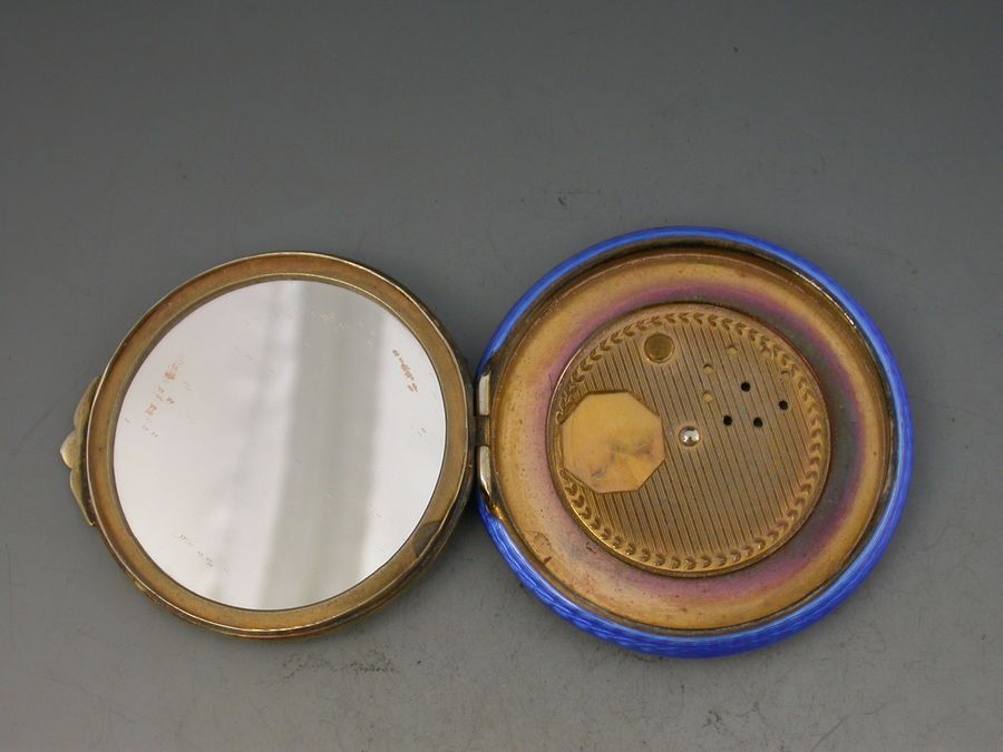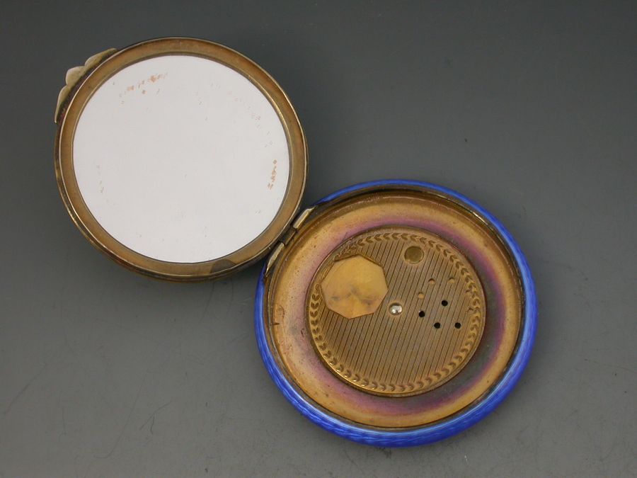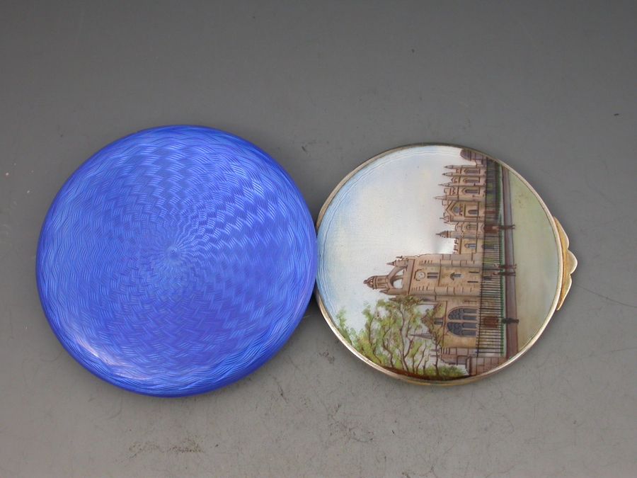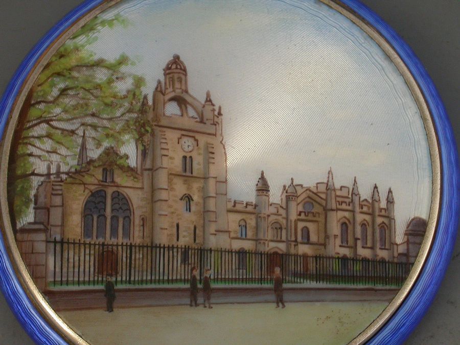 A rare and unusual early 20th century silver gilt and guilloche enamel Compact of circular form, the base with striking blue guilloche design, the lid decorated with a view of Kings College University in Aberdeen, Scotland. The silver gilt interior with powder compartment with revolving cover and a mirror to the interior lid.