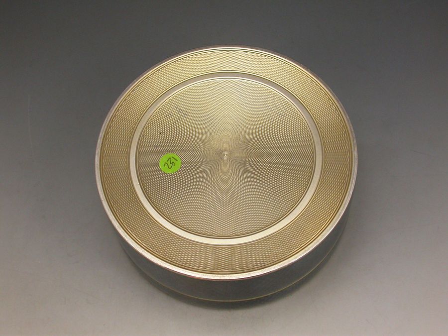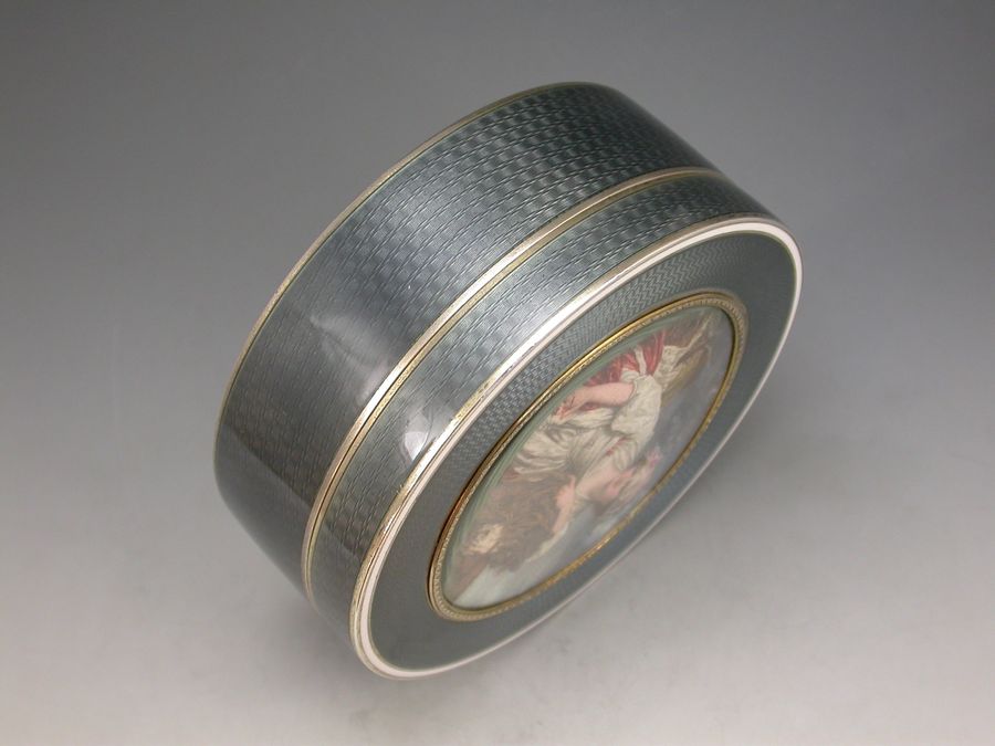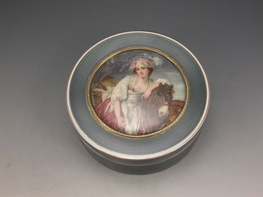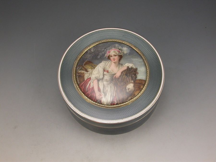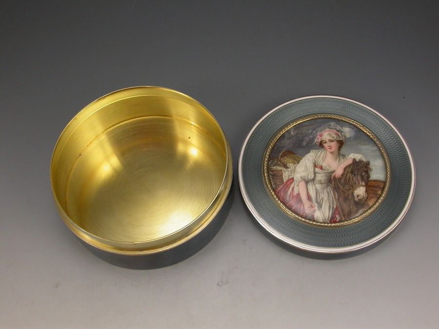 A nice quality early 20th century silver and gun metal grey guilloche enamel circular box, the cover inset with a painting depicting a young girl with a donkey, silver gilt interior.