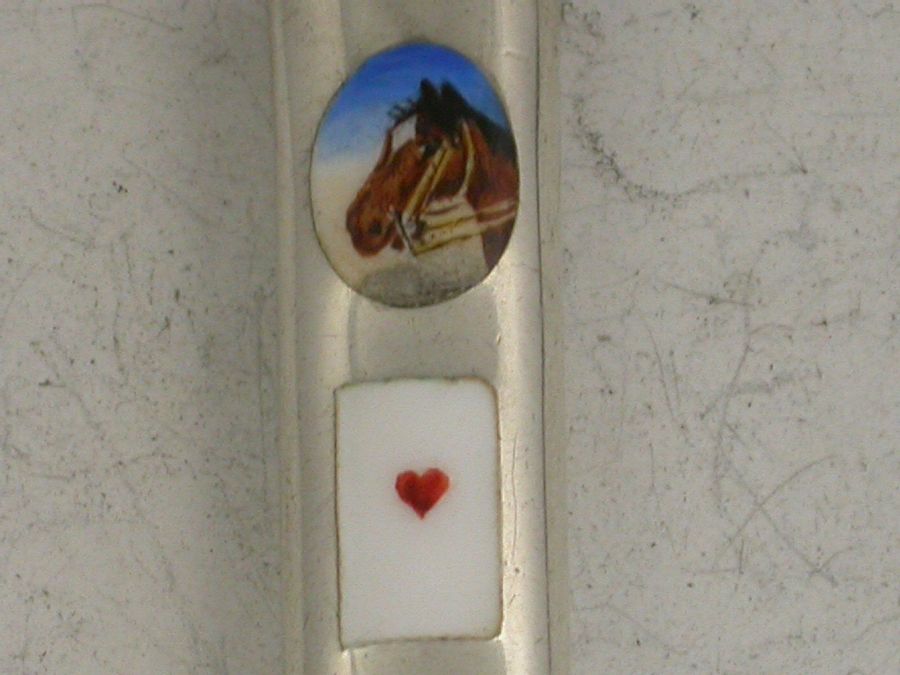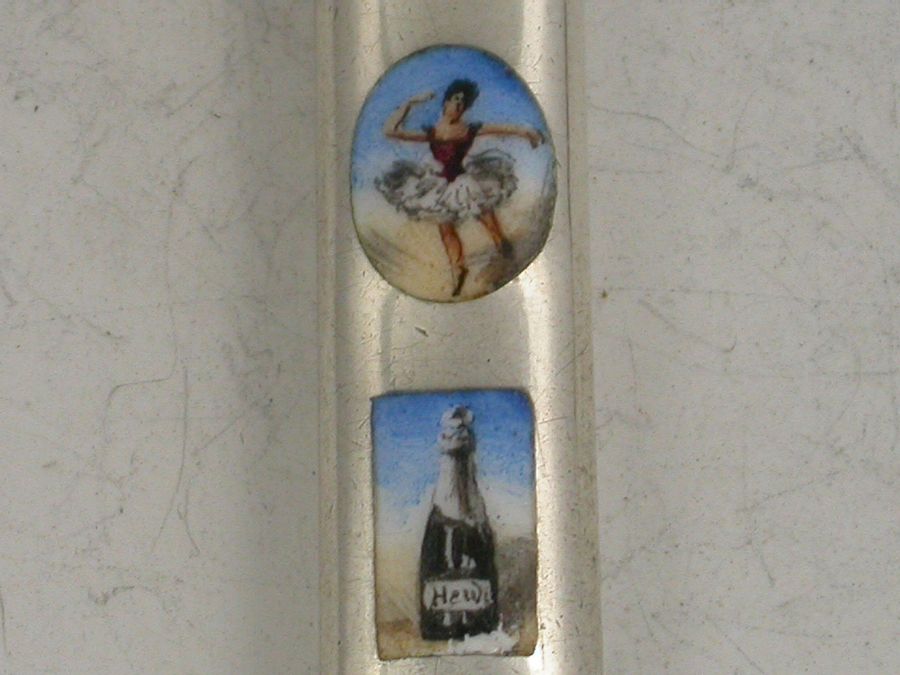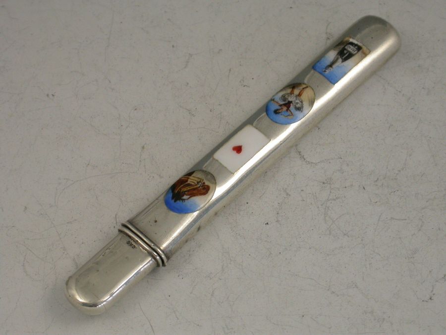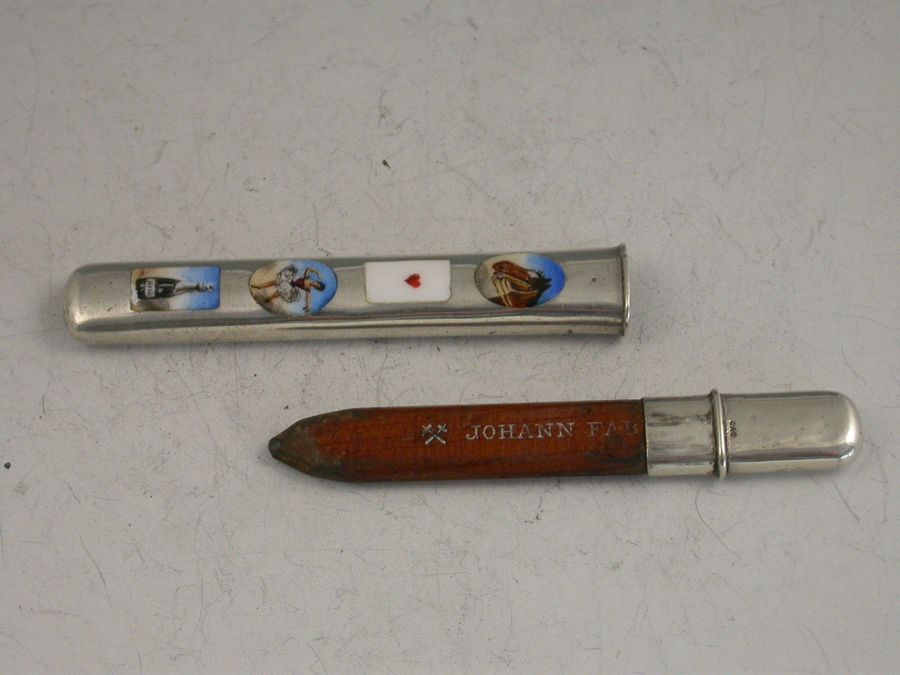 A fine early 20th century French silver cased cedarwood Carpenters Pencil, the case inset with four enamel panels depicting a horses head, playing card, a dancer and a bottle of Champagne to represent the 'four vices'.