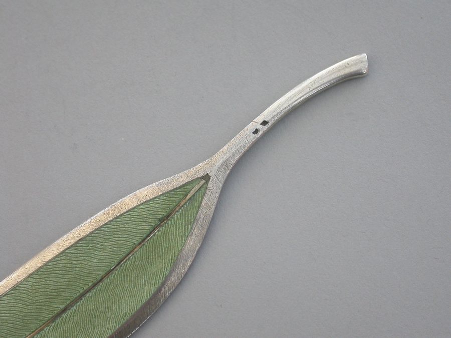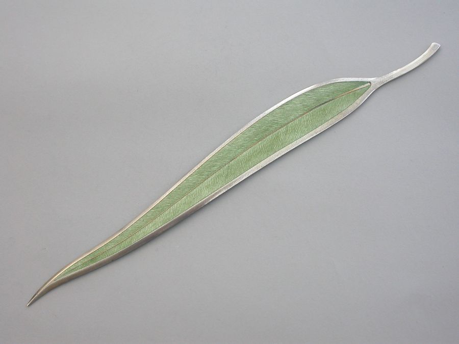 A good quality early 20th century French silver and green guilloche enamel Letter Opener, made in the form of a feather.