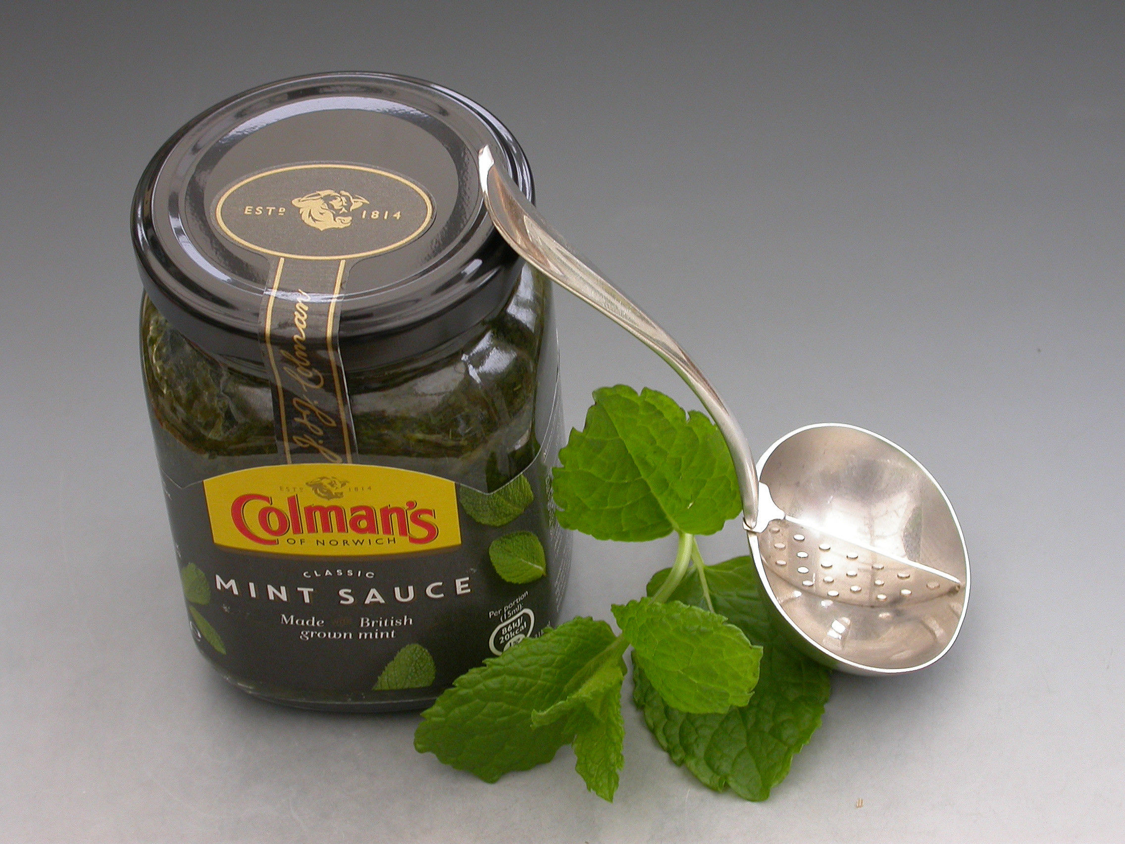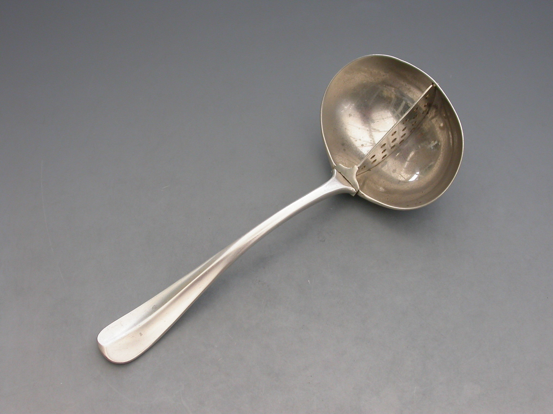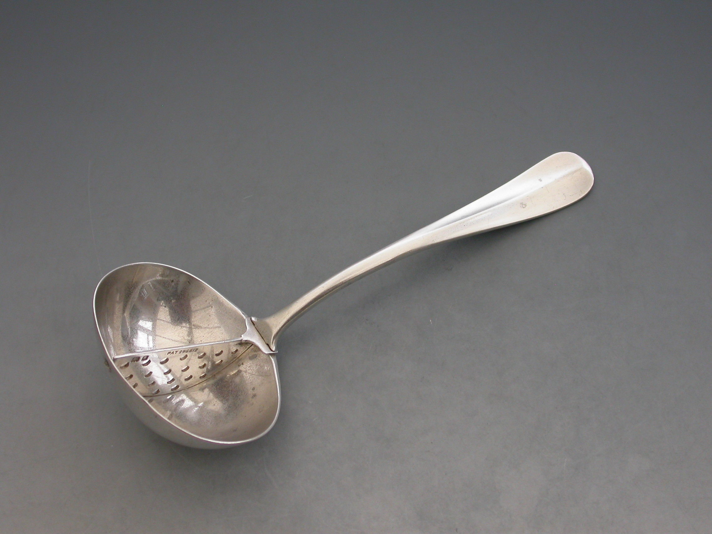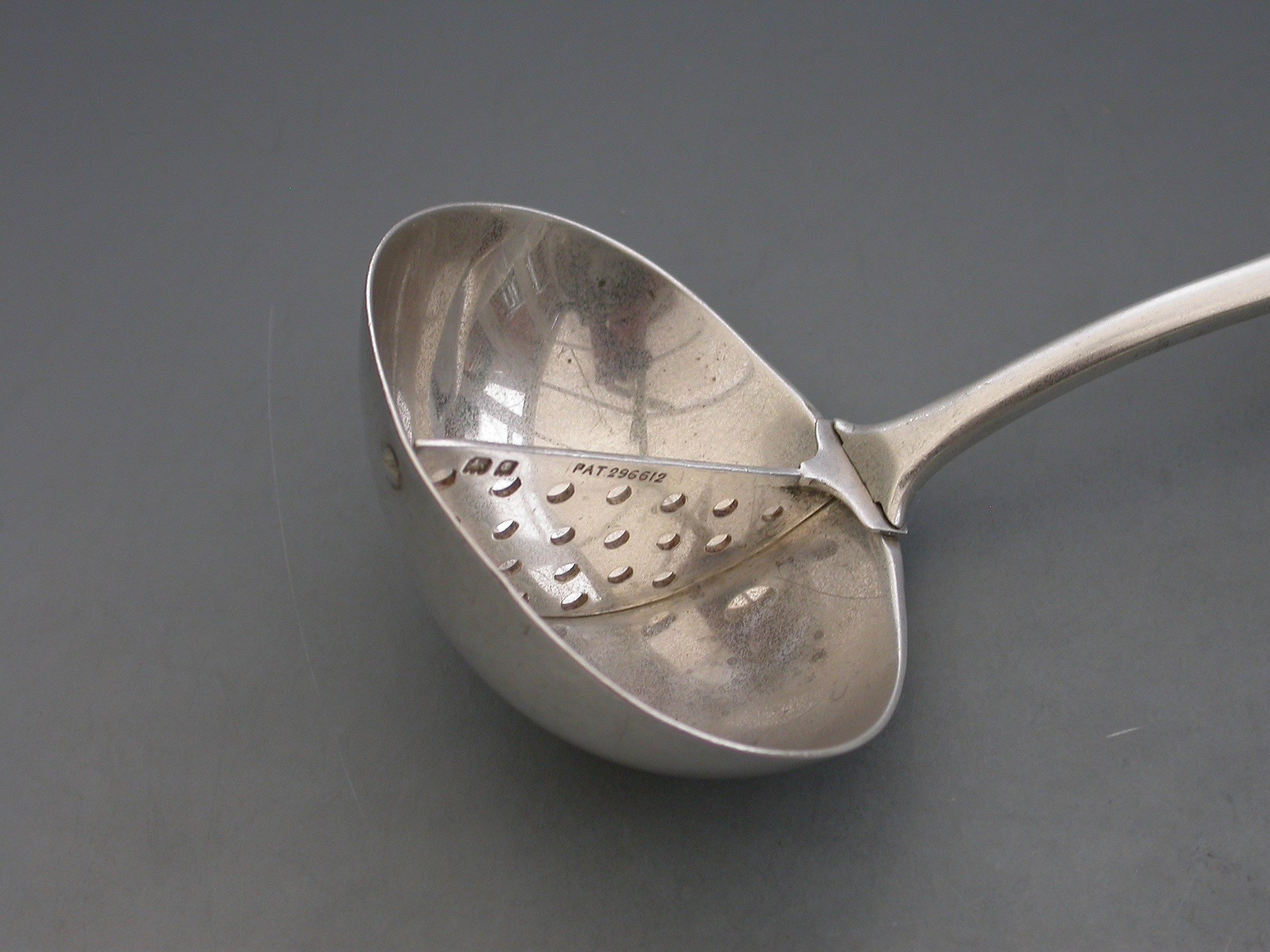 An unusual early 20th century patented silver Mint Sauce Ladle, the bowl divided by a pierced strainer, ribbed Hanoverian pattern handle.