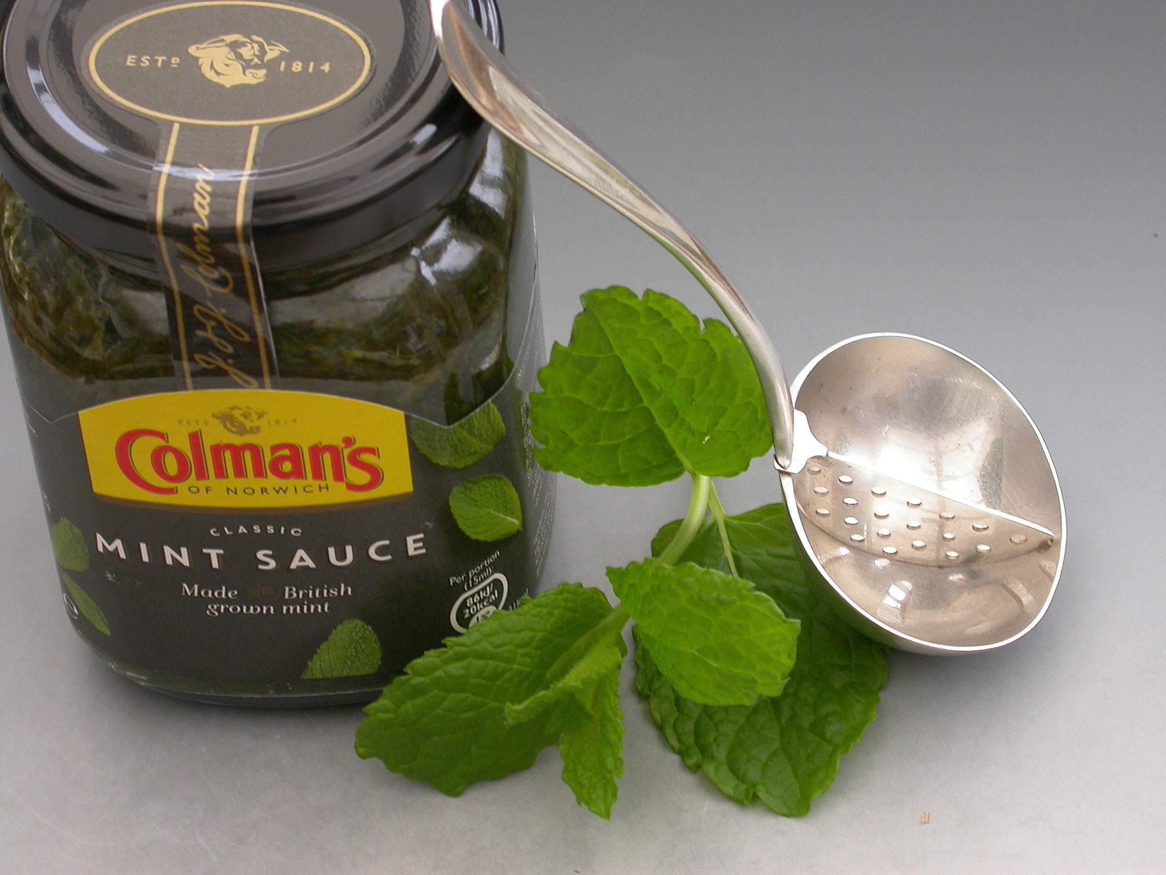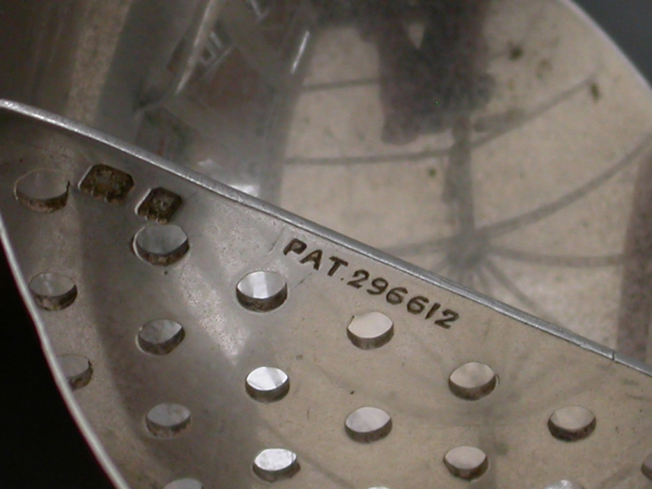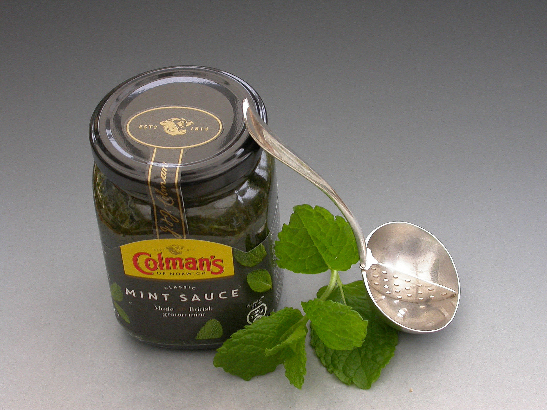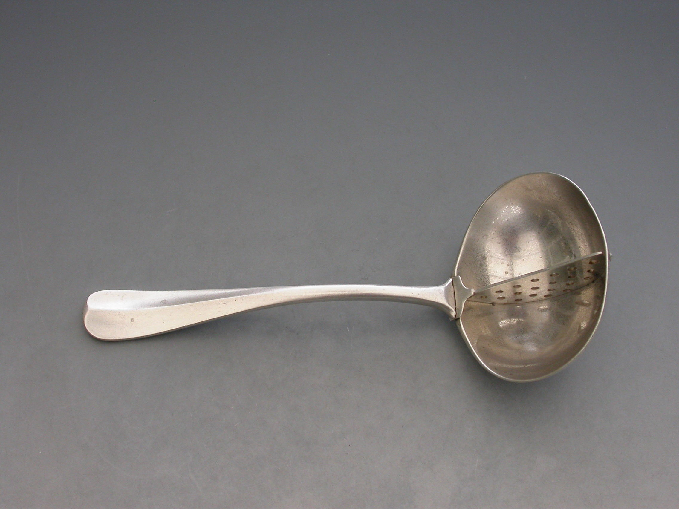 An unusual early 20th century patented silver Mint Sauce Ladle, the bowl divided by a pierced strainer, ribbed Hanoverian pattern handle.