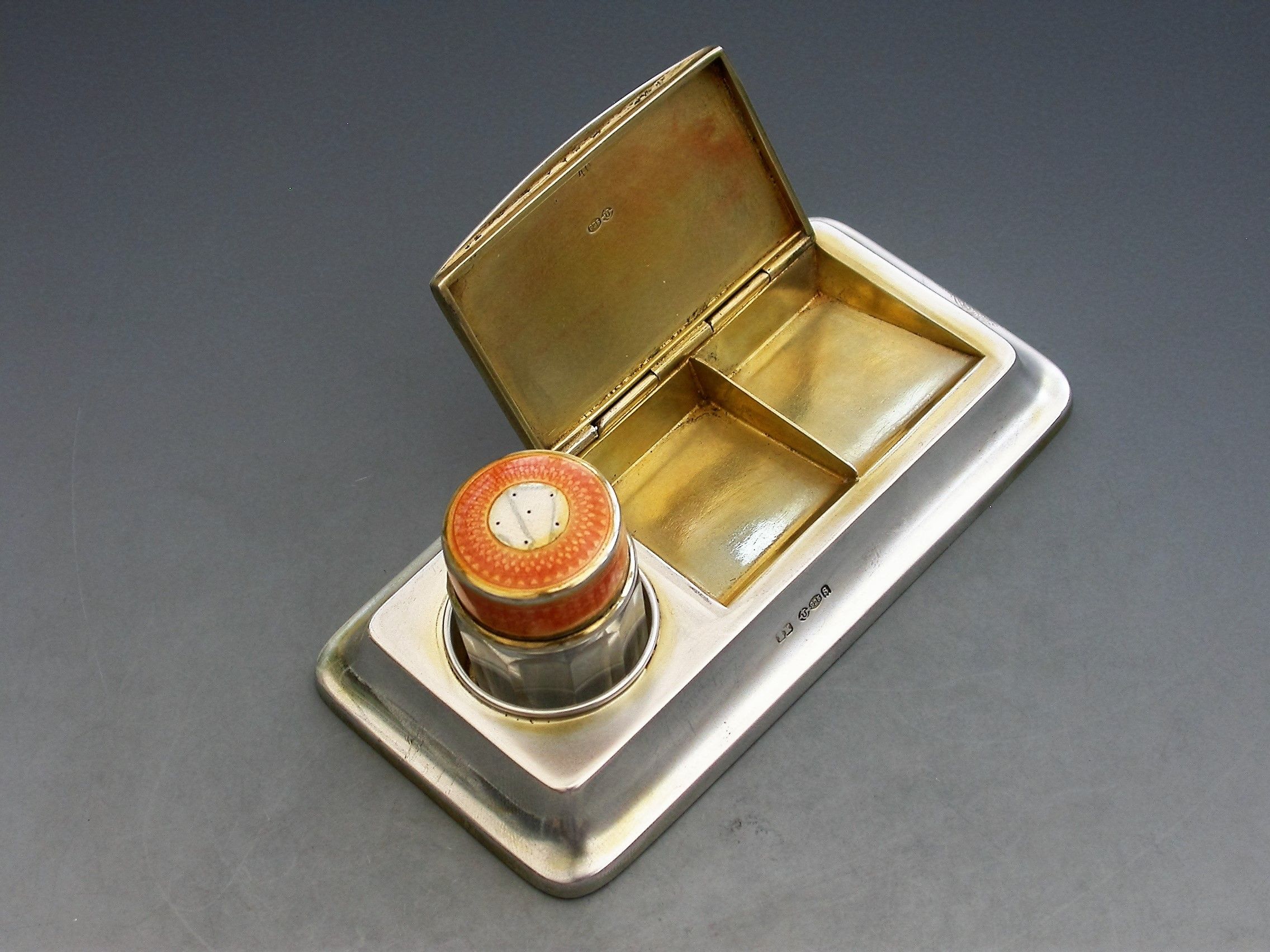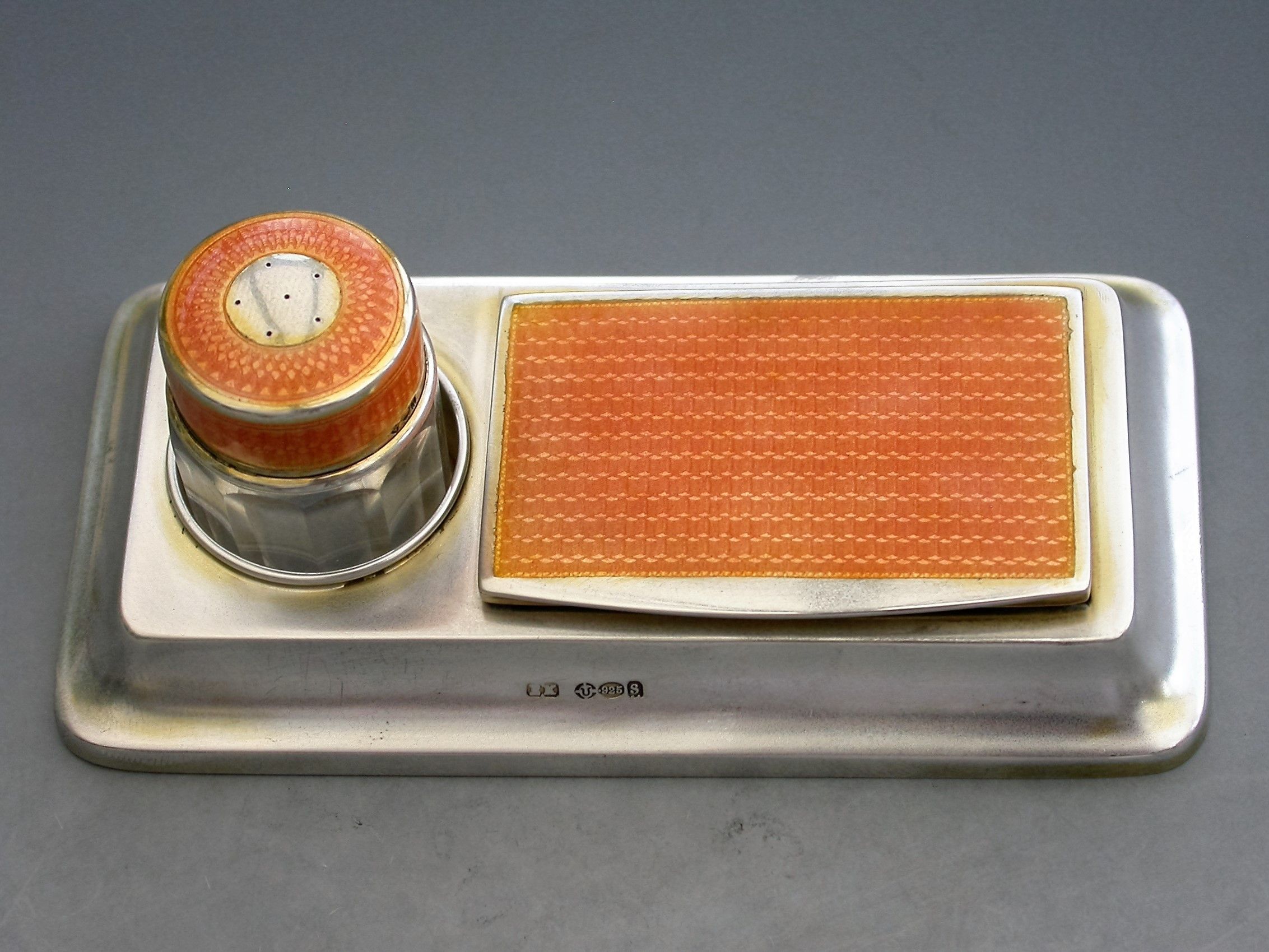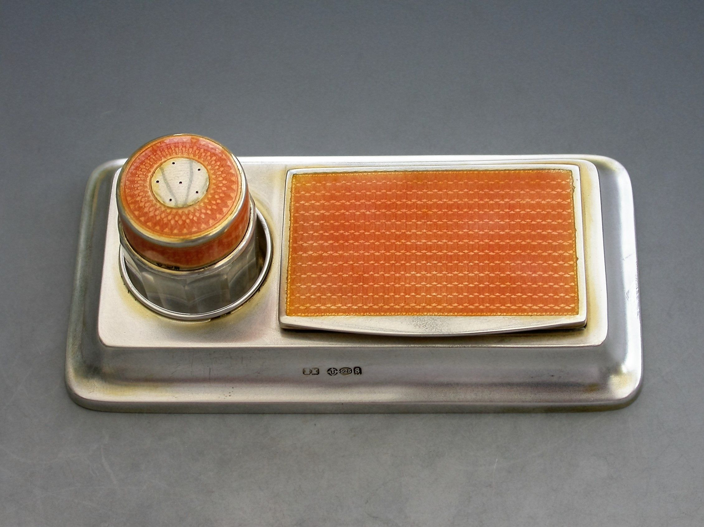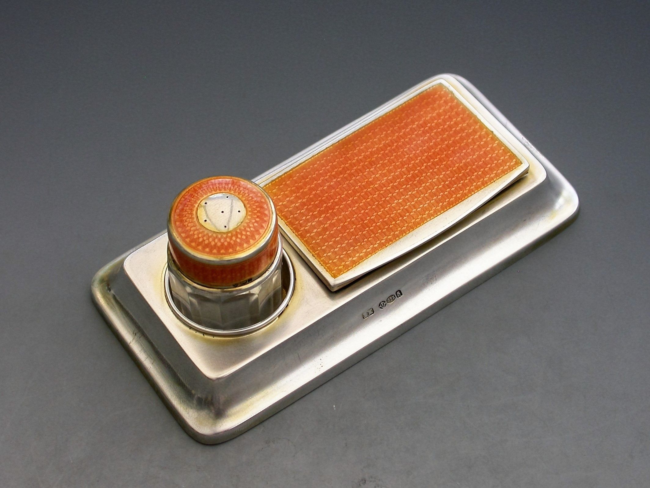 A good early 20th century silver and orange guilloche enamel twin compartment Stamp Box combined with a silver mounted glass Stamp Moistener, on plain rectangular stepped pedestal base.