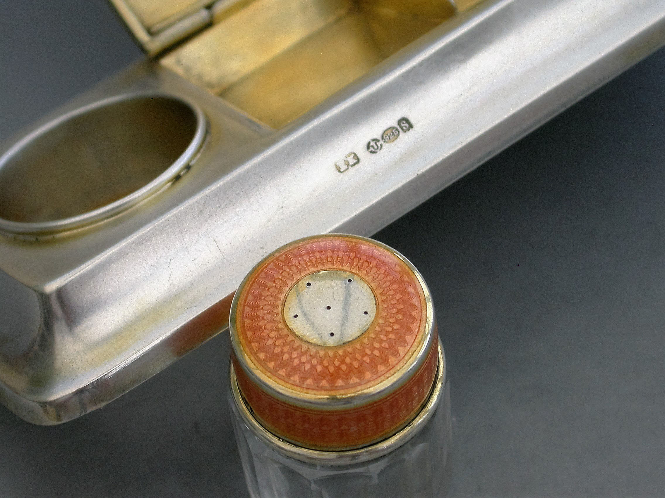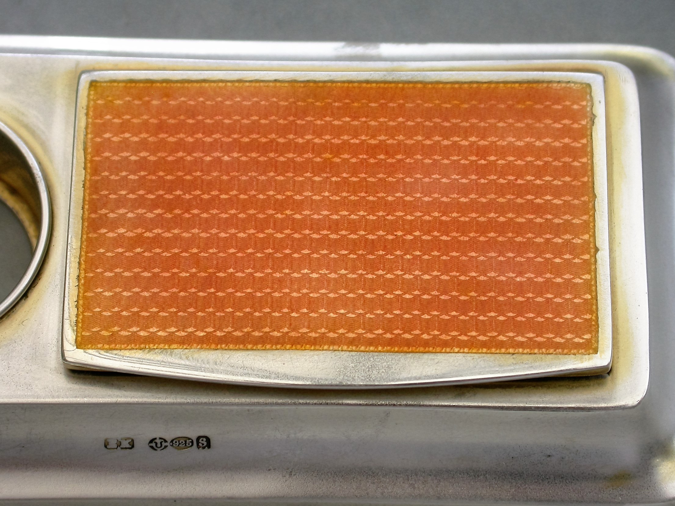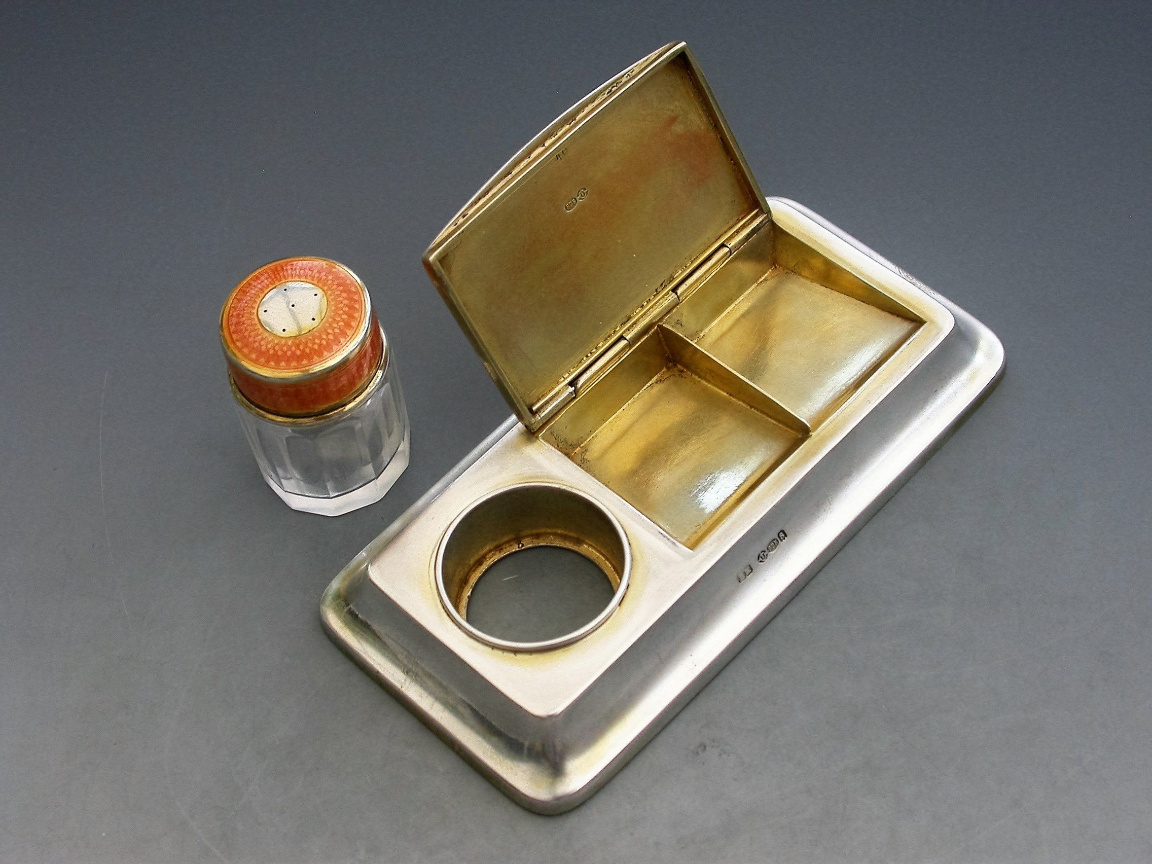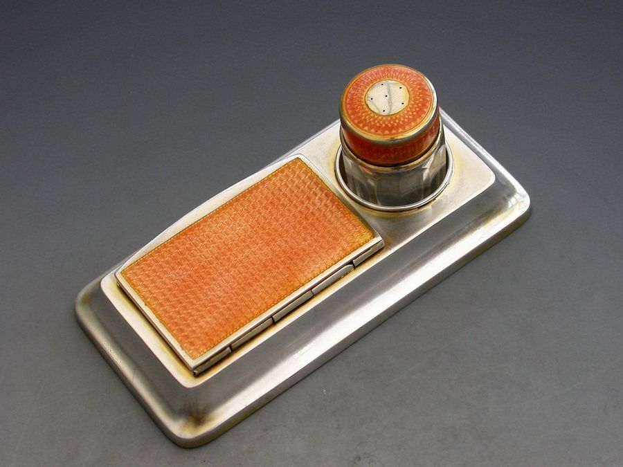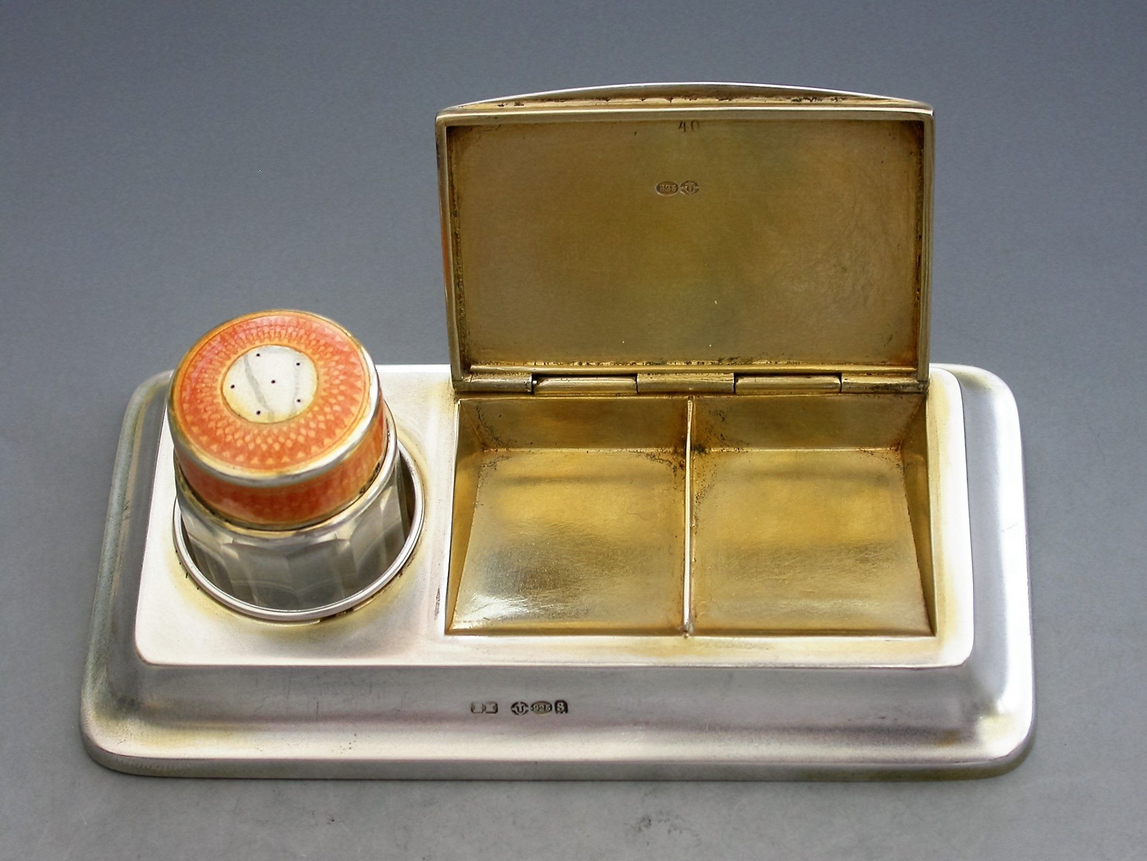 A good early 20th century silver and orange guilloche enamel twin compartment Stamp Box combined with a silver mounted glass Stamp Moistener, on plain rectangular stepped pedestal base.