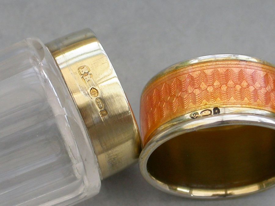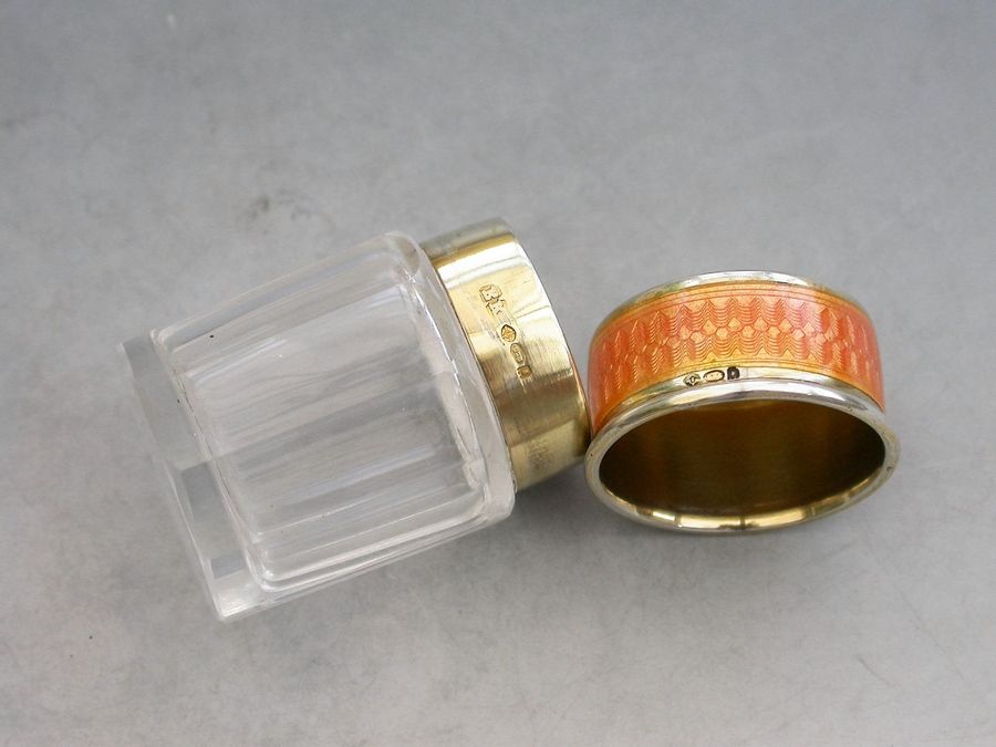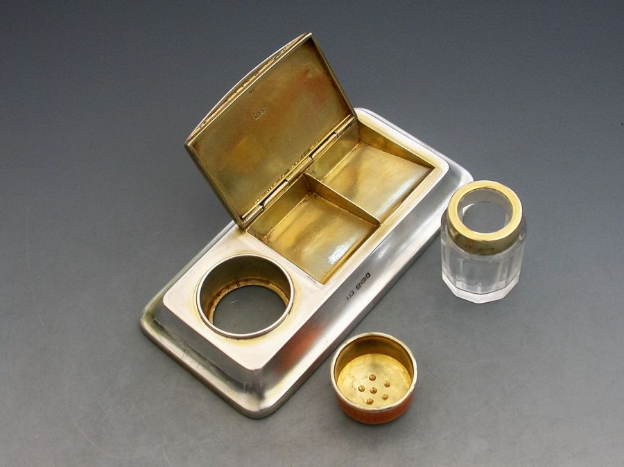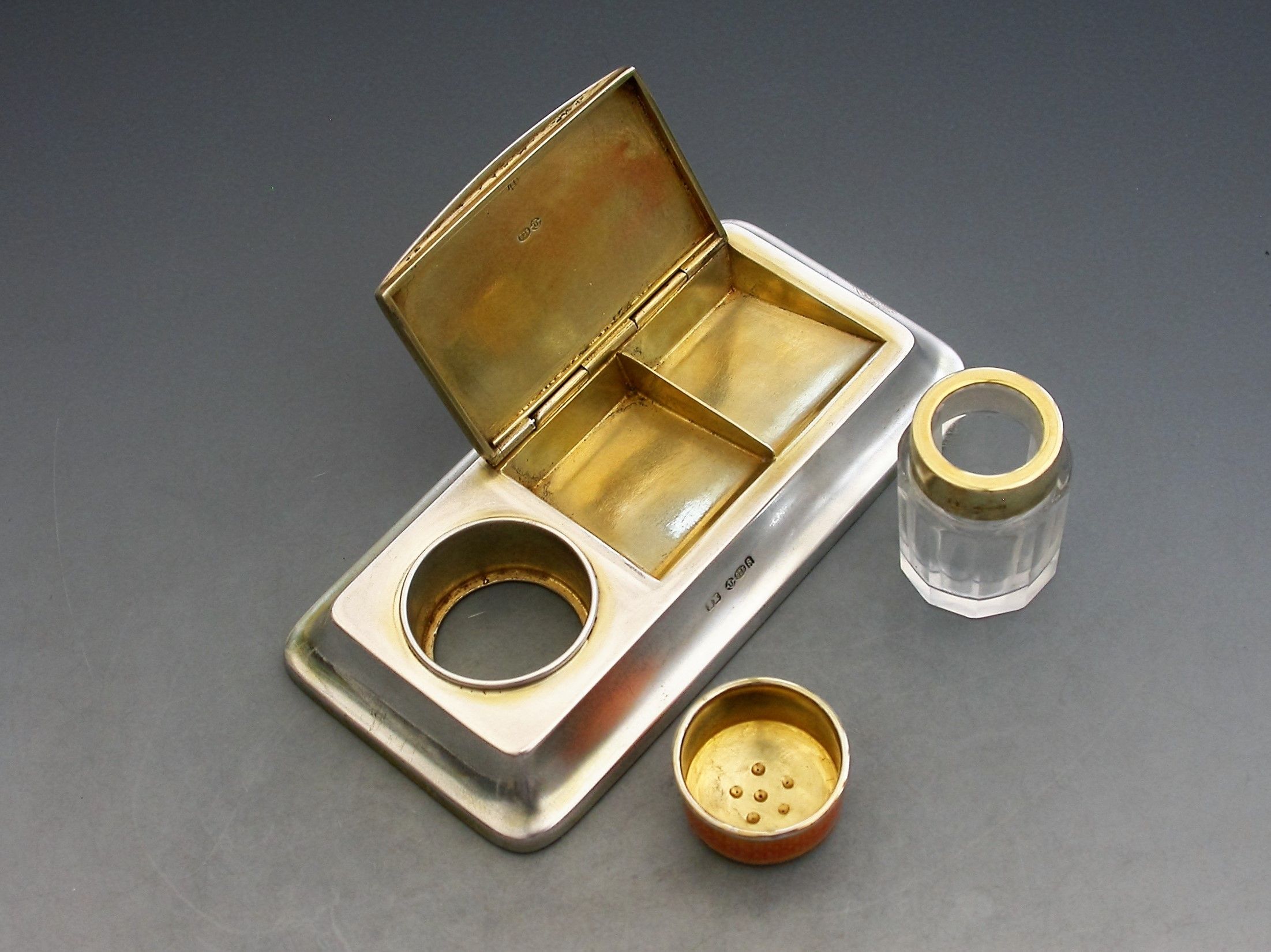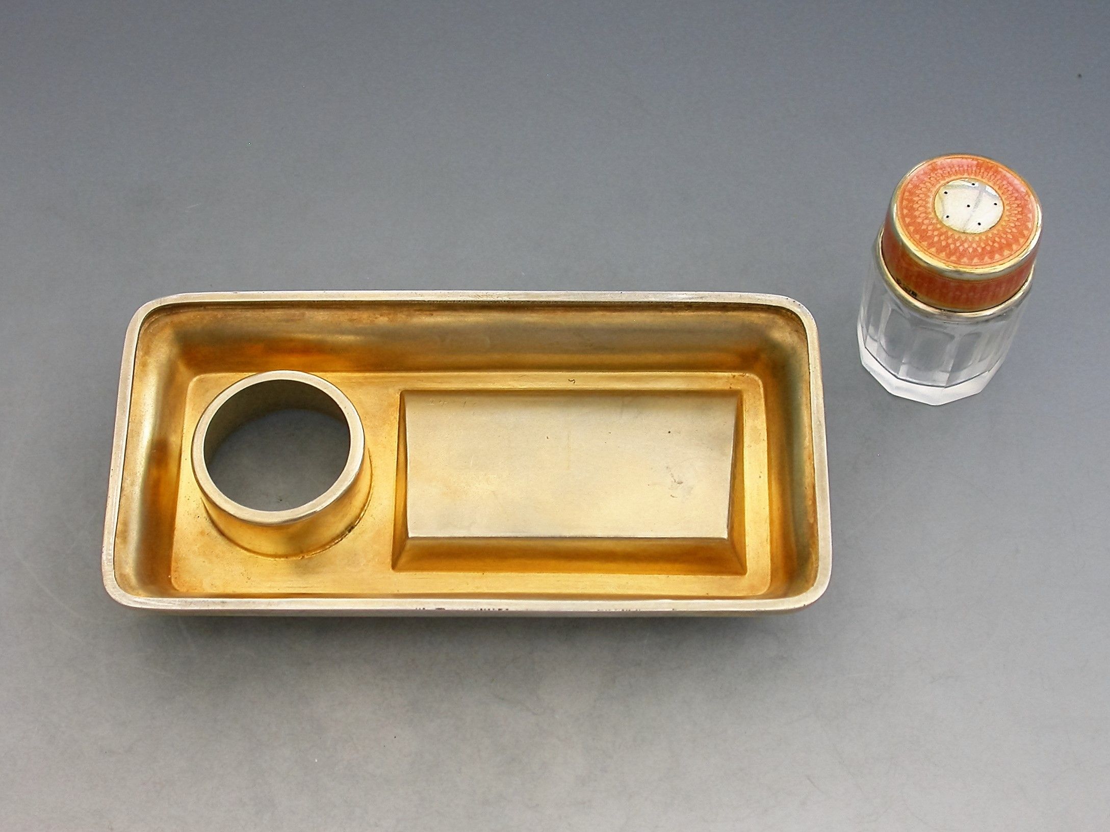 A good early 20th century silver and orange guilloche enamel twin compartment Stamp Box combined with a silver mounted glass Stamp Moistener, on plain rectangular stepped pedestal base.