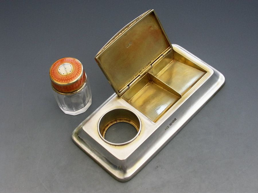 Early 20th Century Silver & Guilloche Enamel Twin Compartment Stamp Box & Stamp Moistener