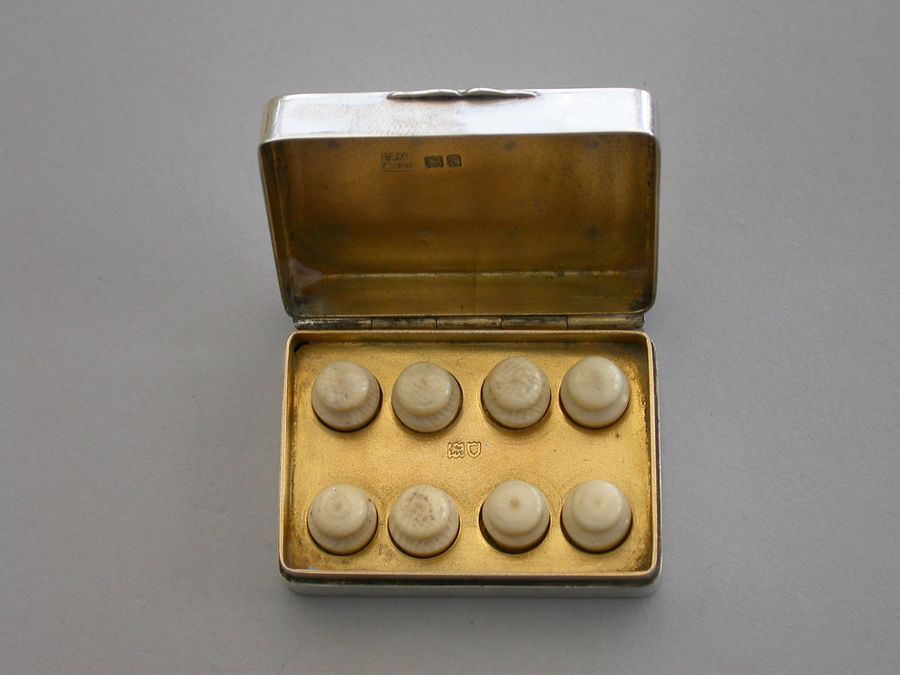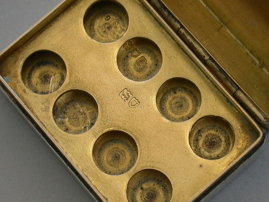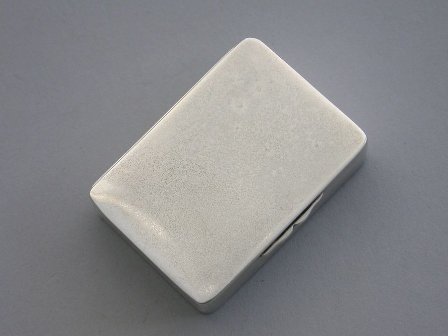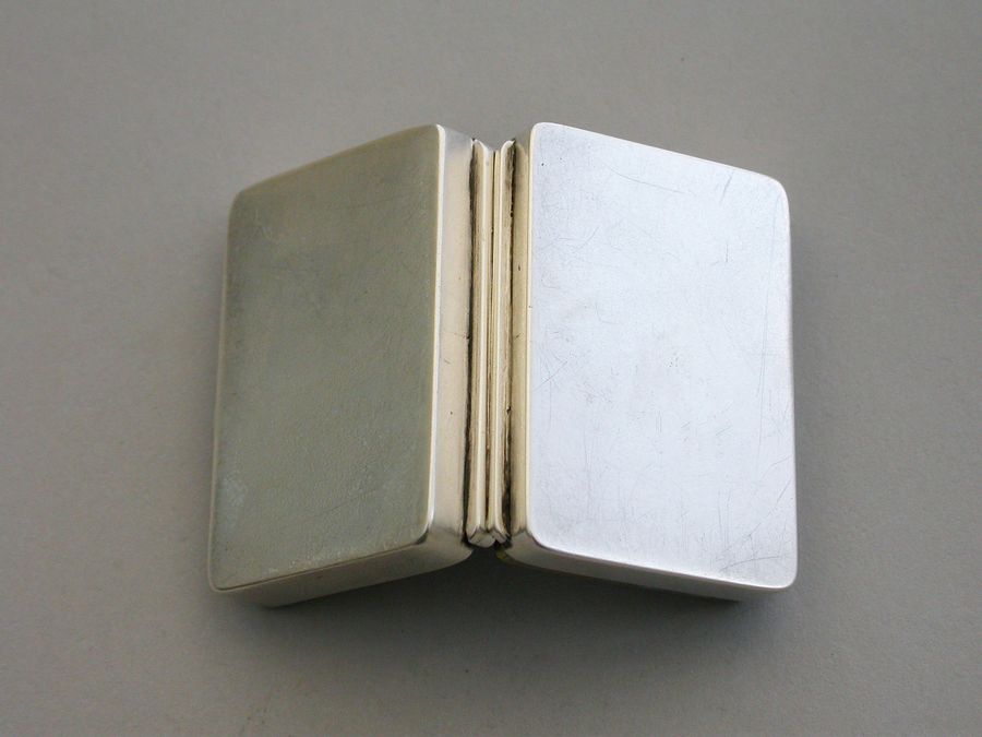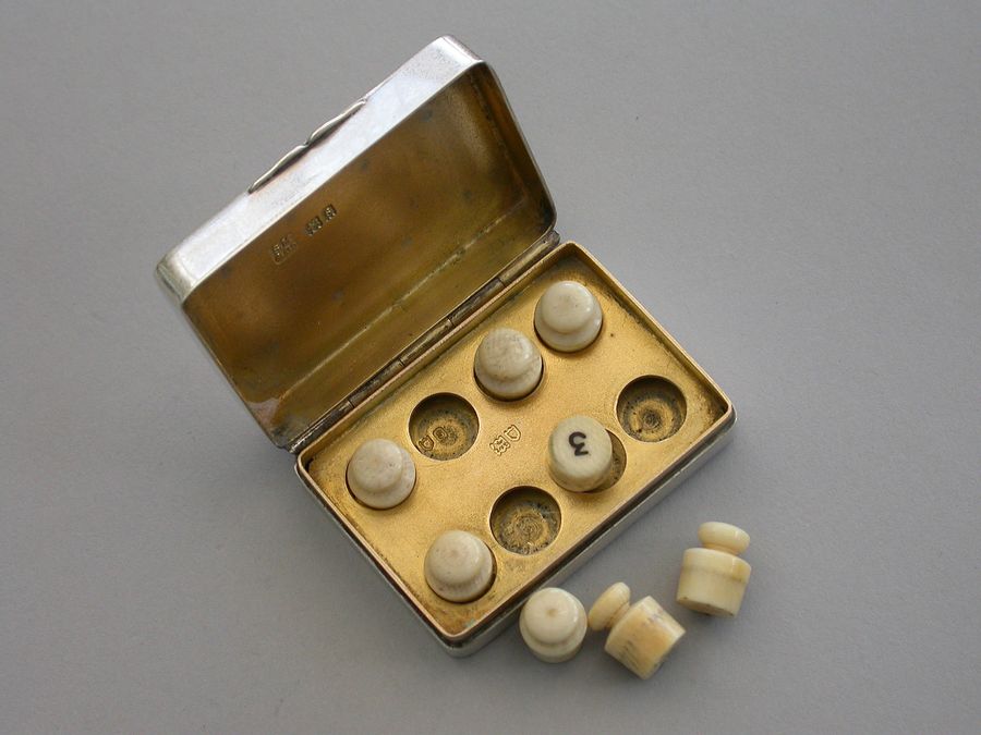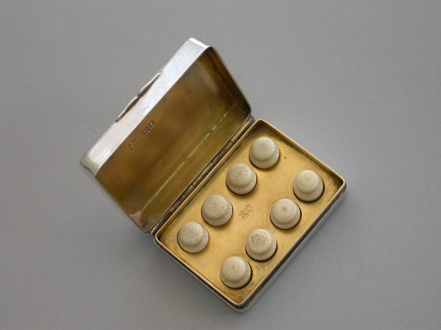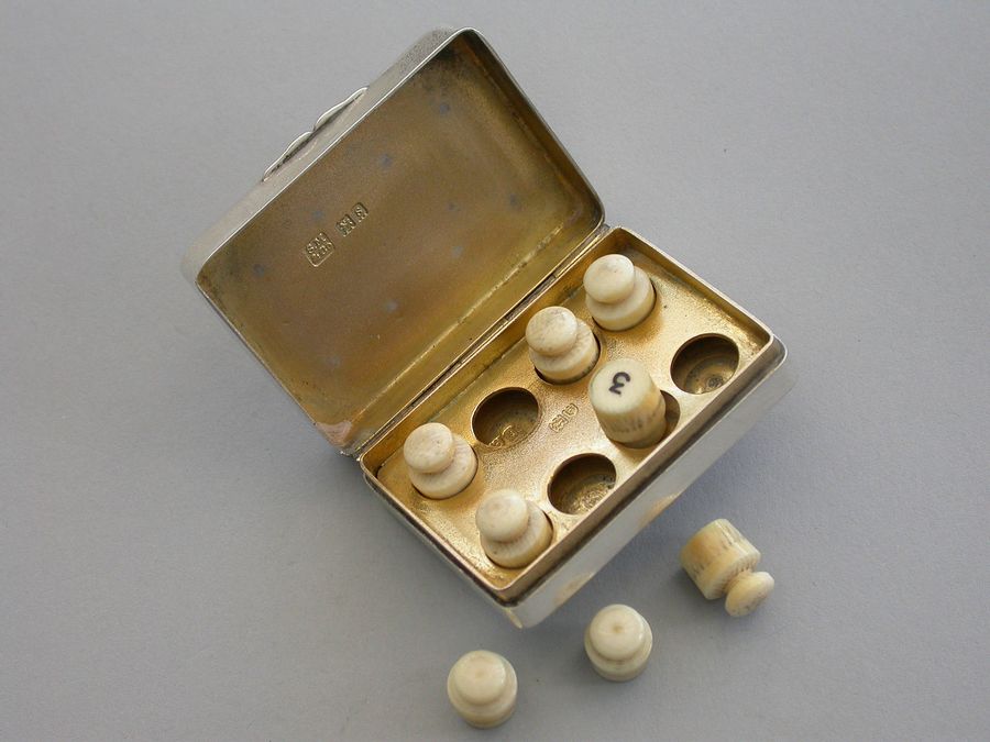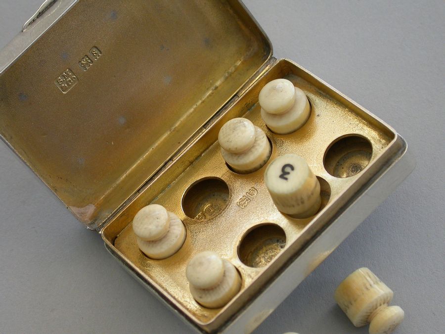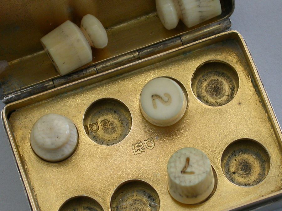 A rare early 20th century silver Butt Marker made in the form of a Weights Box, the plain rectangular box opening to reveal a silver gilt interior set with eight numbered ivory pegs.