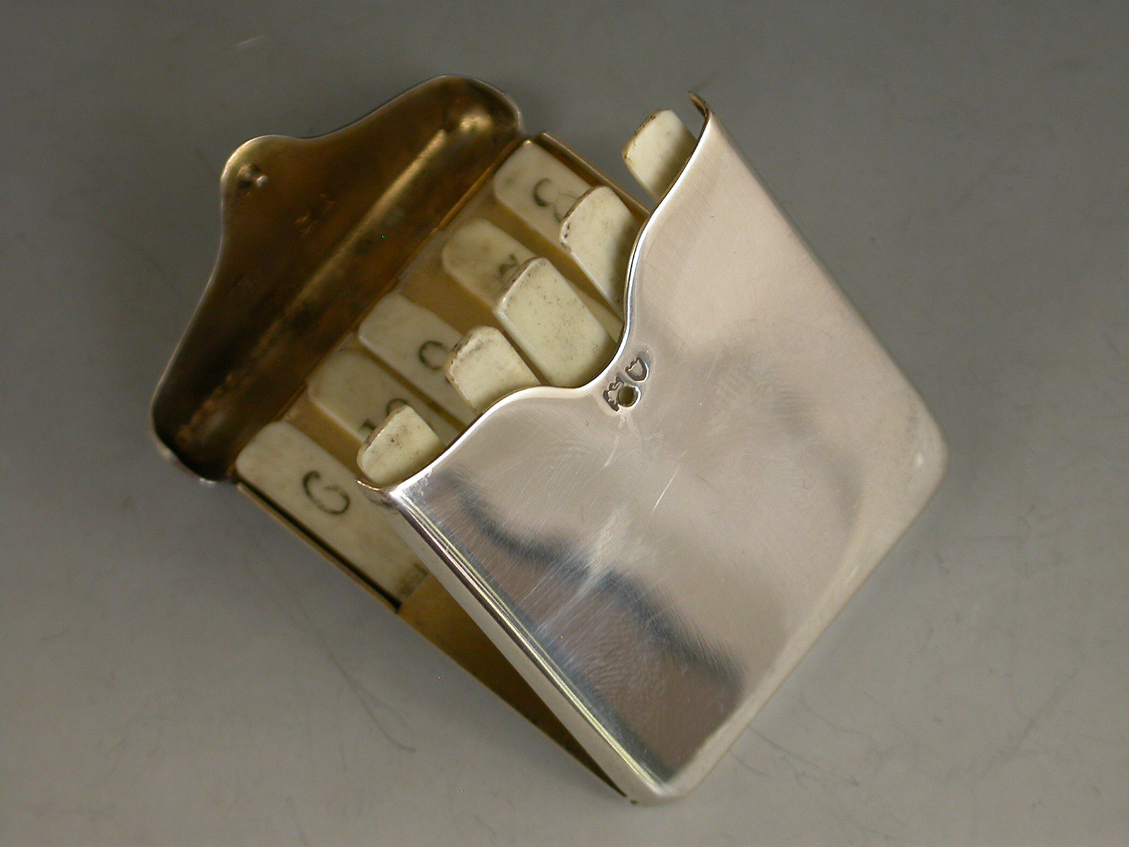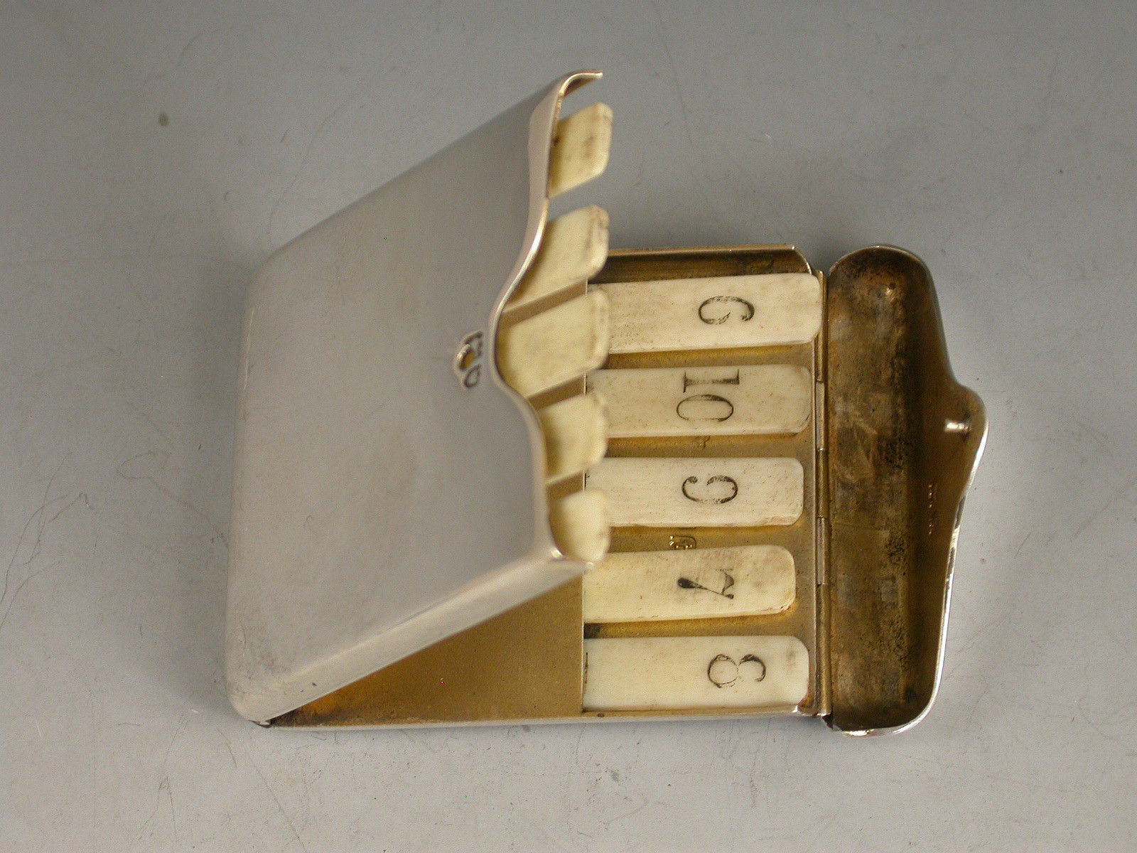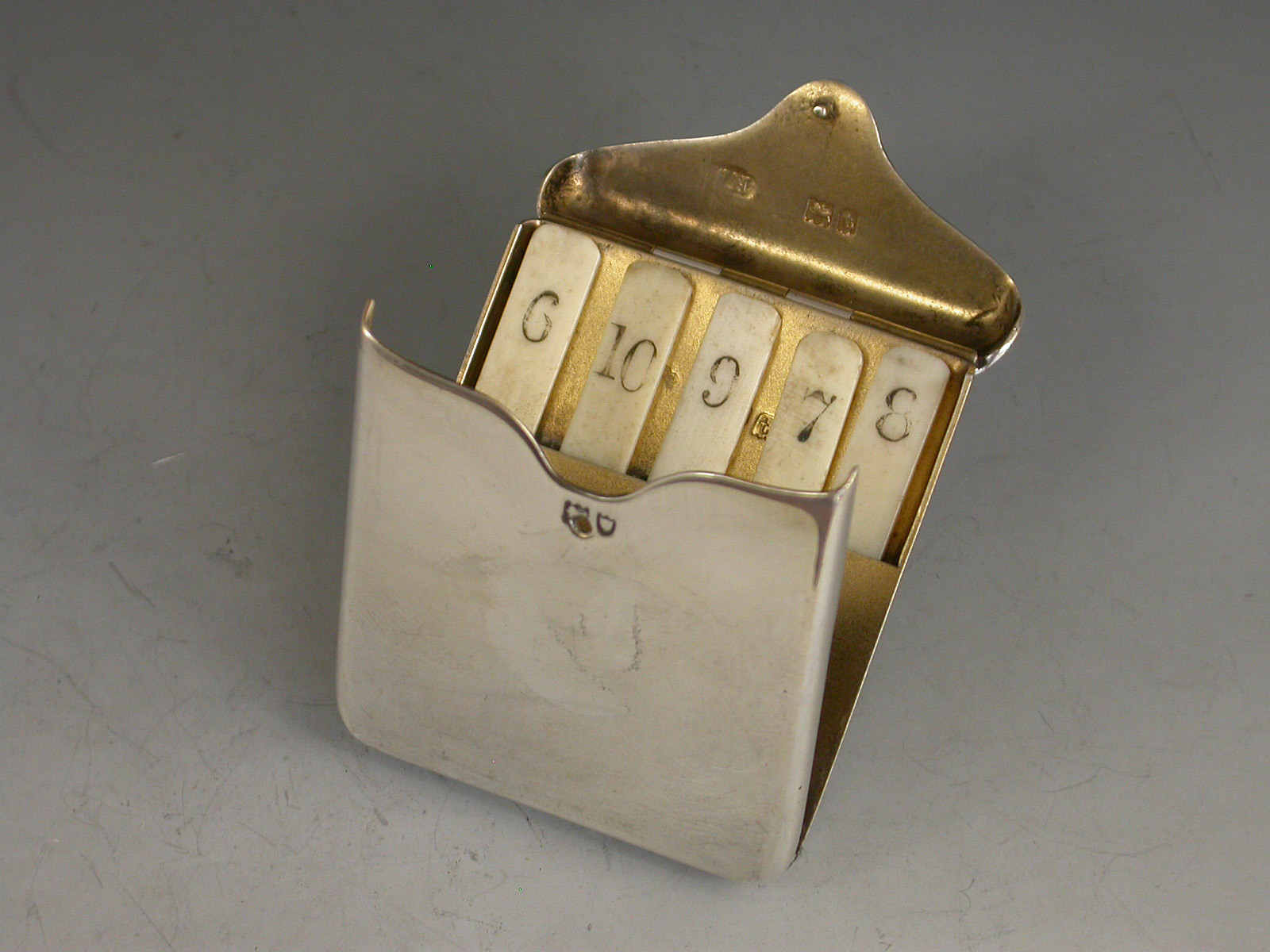 A good early 20th century silver Butt Marker of slim pouch form with hinged flap cover, springing open to reveal two sections each with five slots and containing ten numbered ivory or bone pegs. Silver gilt interior.