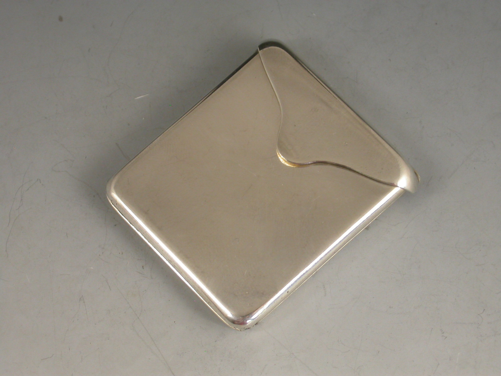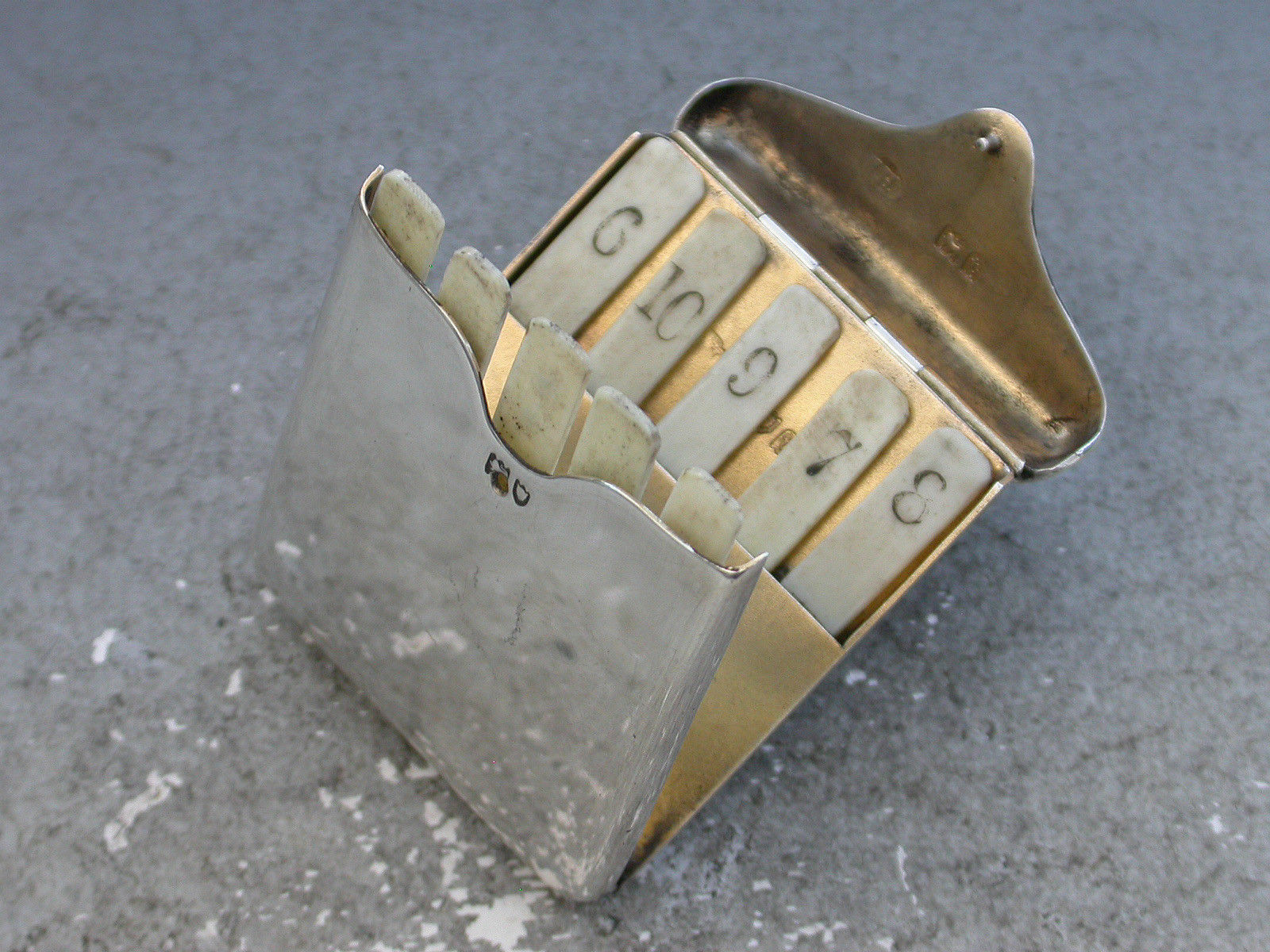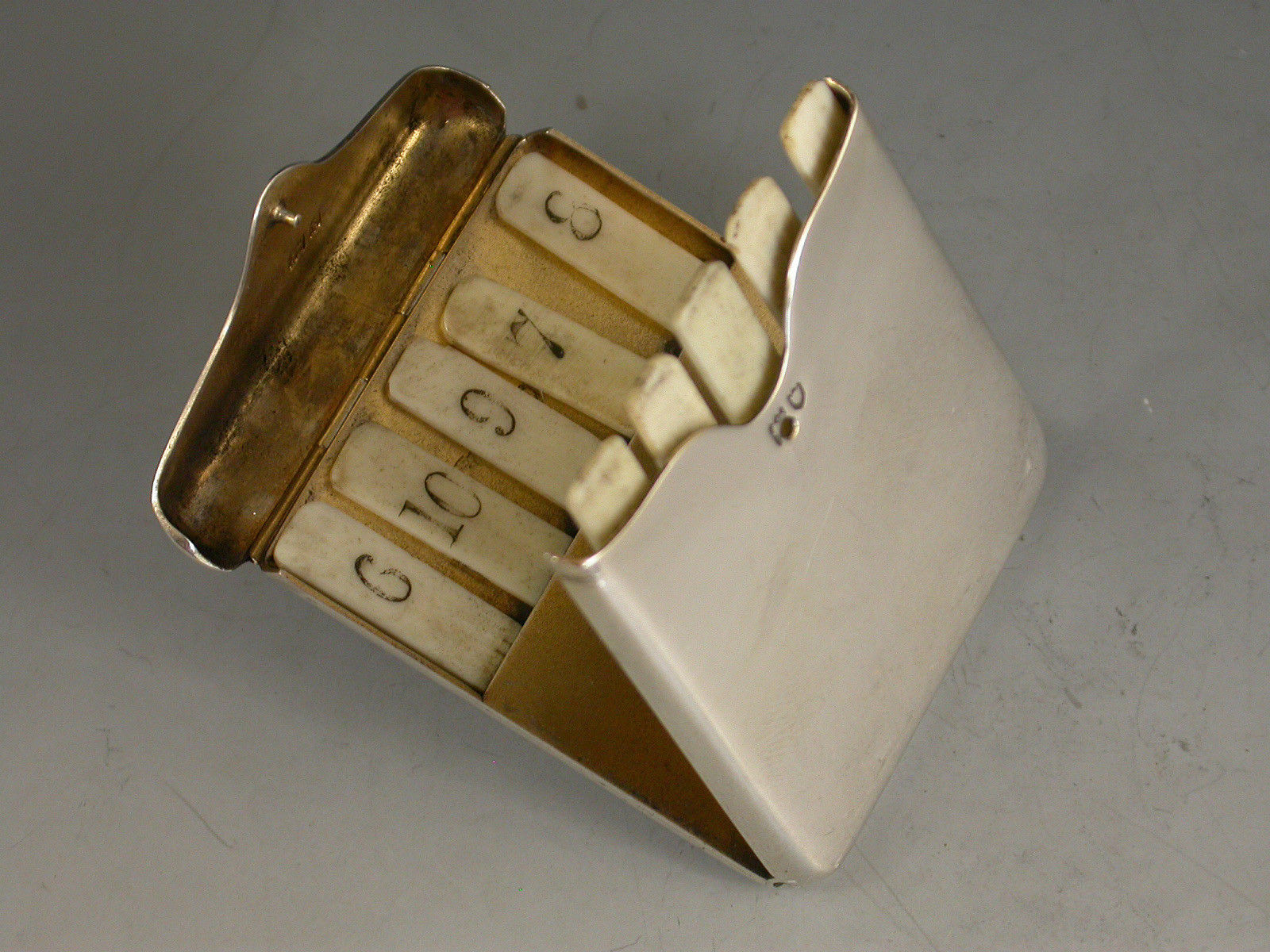 A good early 20th century silver Butt Marker of slim pouch form with hinged flap cover, springing open to reveal two sections each with five slots and containing ten numbered ivory or bone pegs. Silver gilt interior.