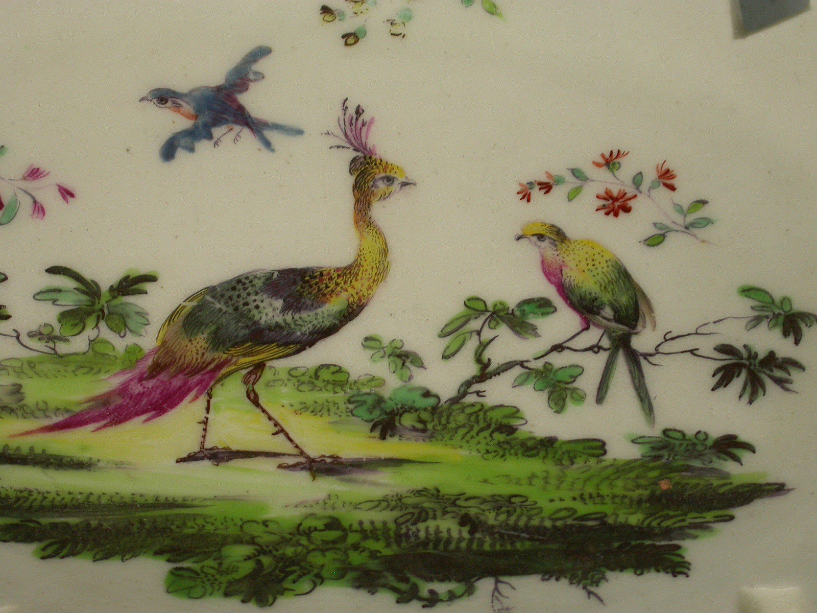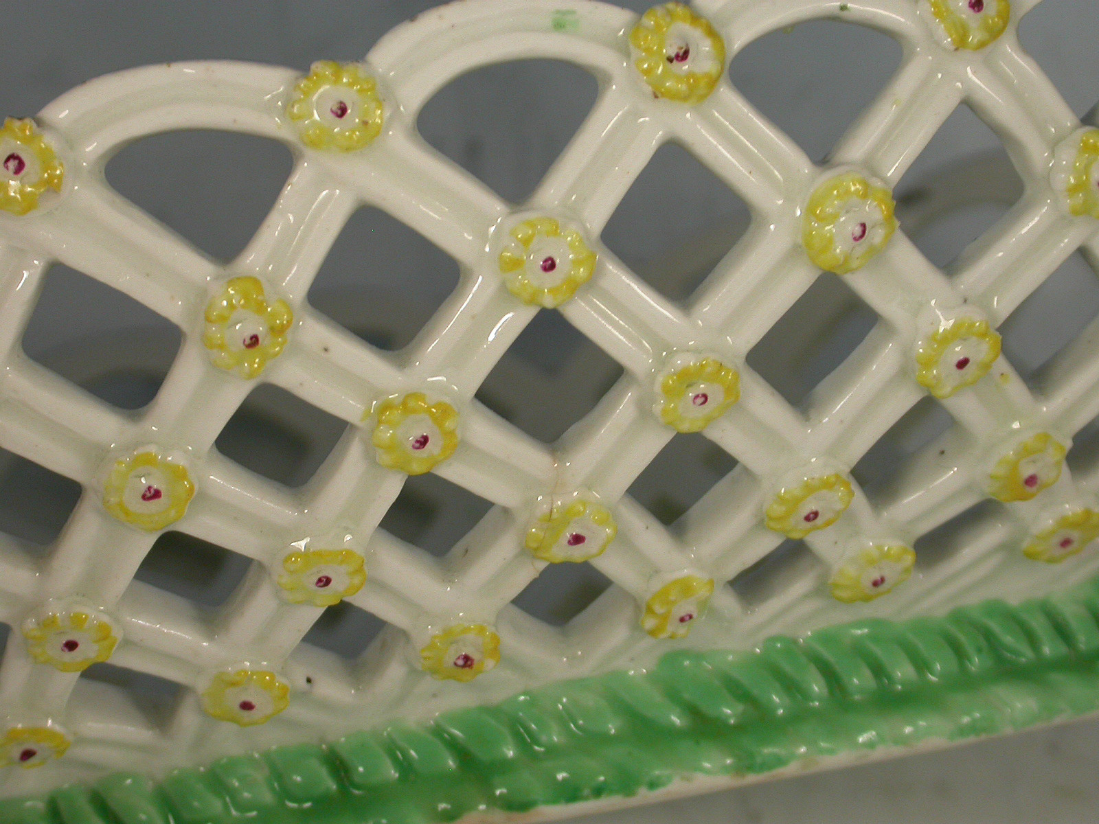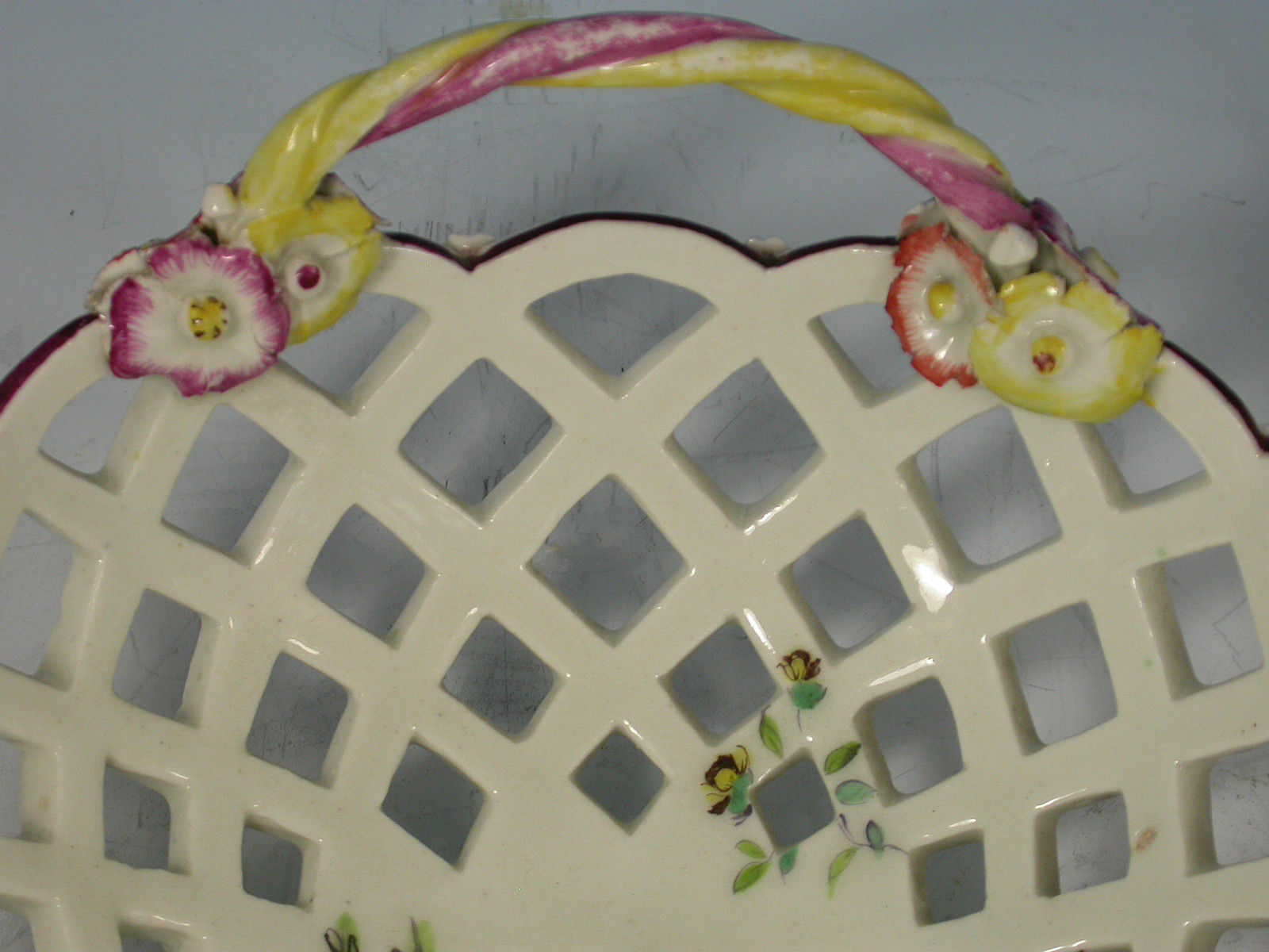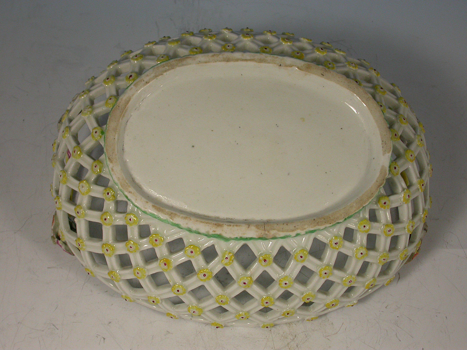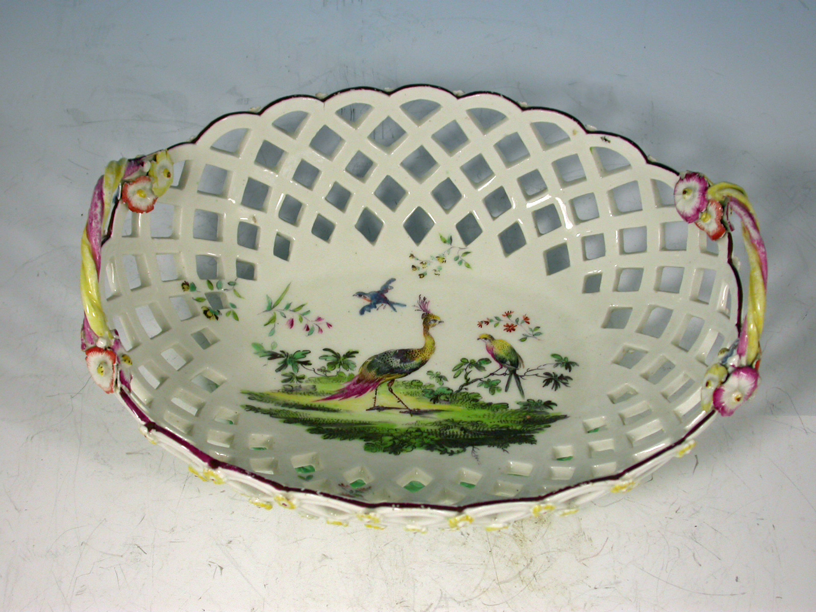 A very fine early Derby pierced oval Basket with applied rope twist handles enriched with florets, the interior painted in polychrome enamels with exotic birds in parkland and scattered floral sprays, the exterior with applied flower heads embellished with a soft canary yellow on a raised collet apple green base, all within a chocolate lime border.