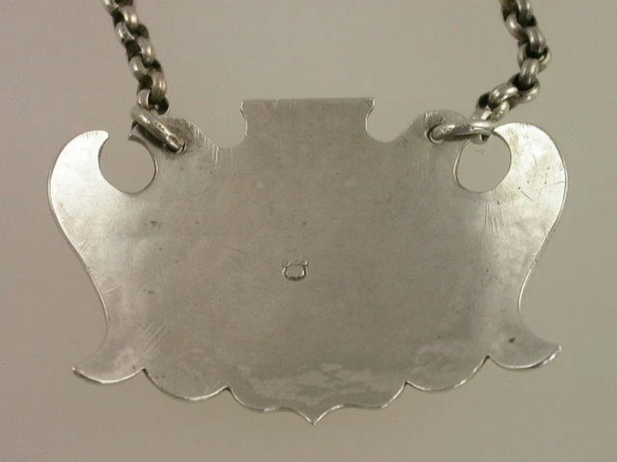 A superb George II silver Wine Label of unusual chased escutcheon form with distinctive flattened top, chased and engraved with vine leaves and grapes. Incised for CLARET.