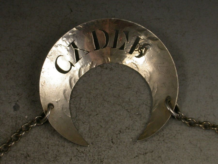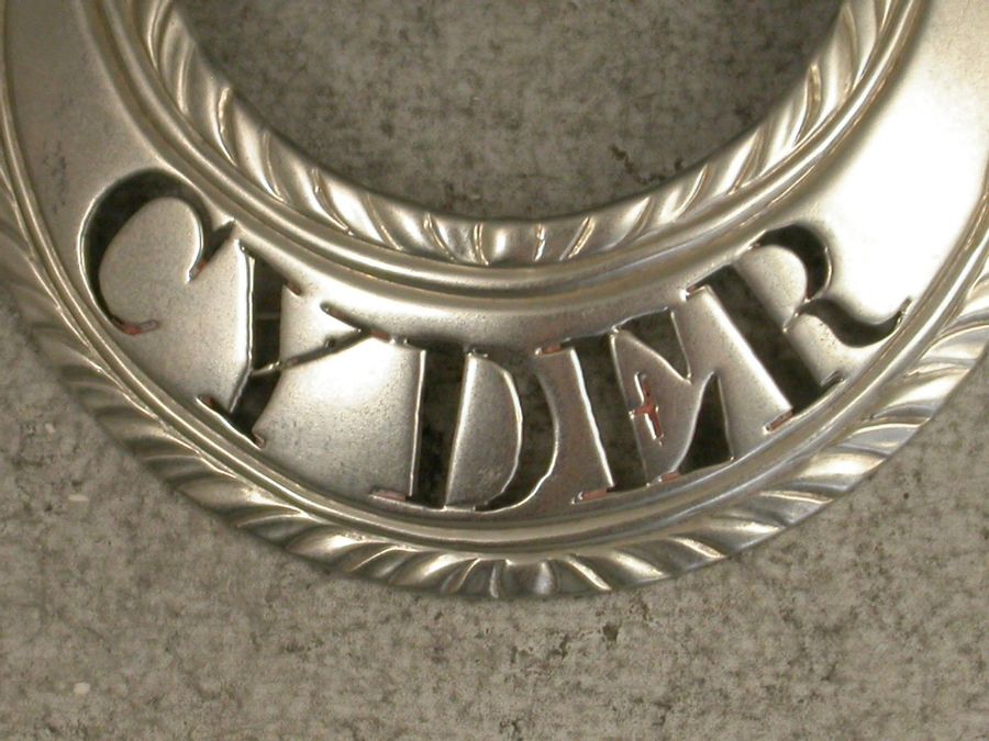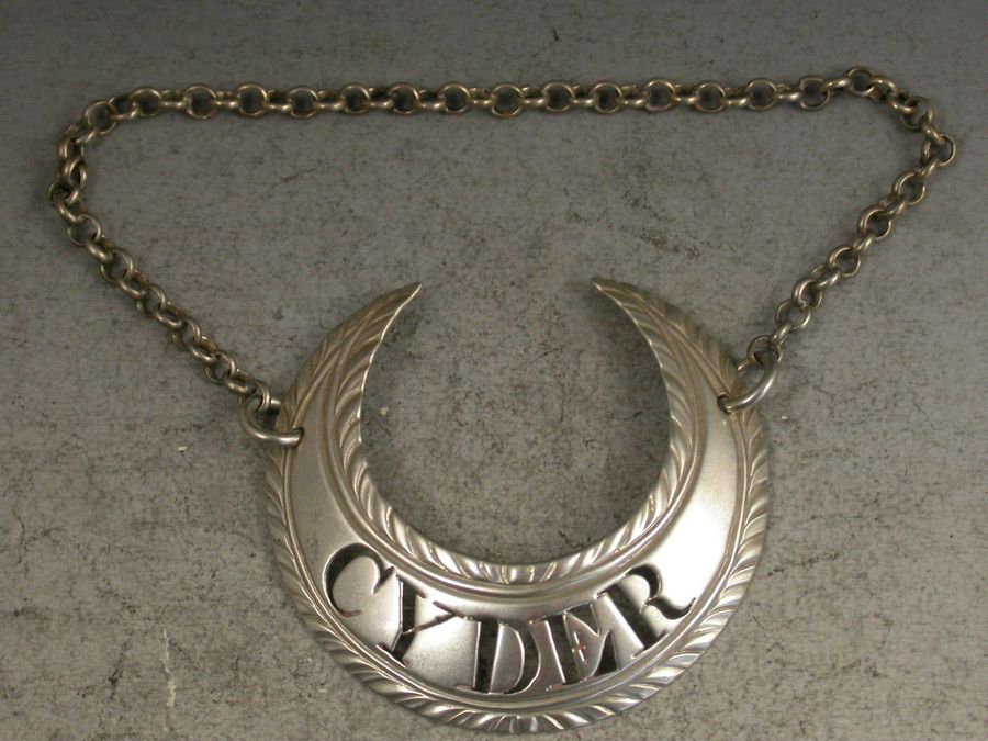 A rare early George III silver Wine Label of crescent form with feather edge border, pierced for Cyder.