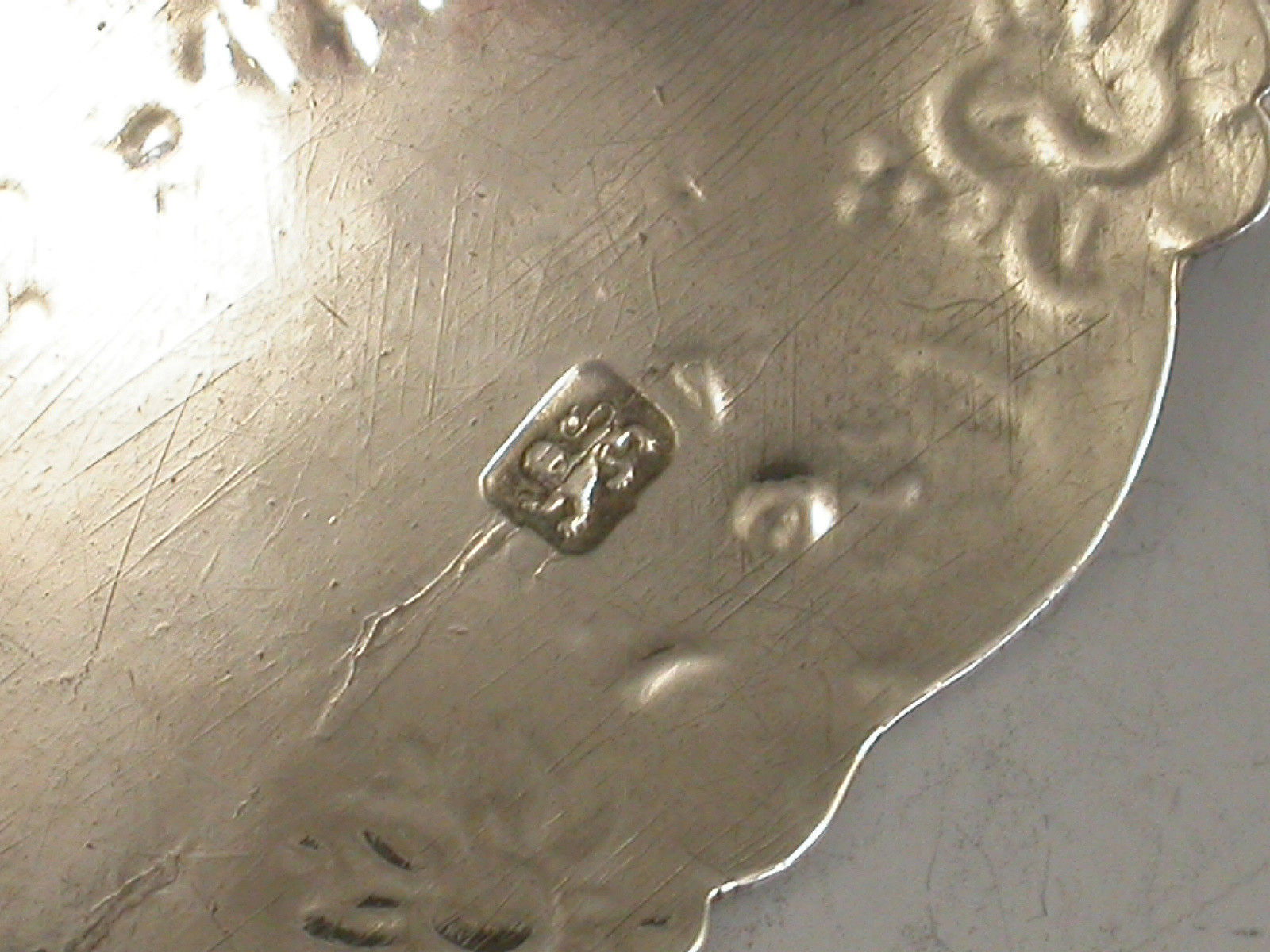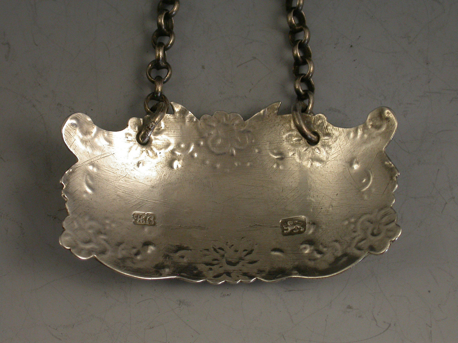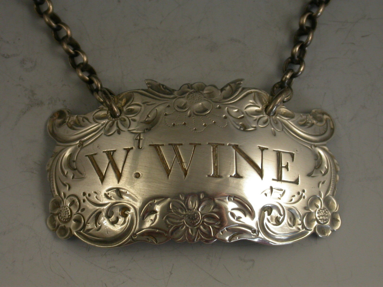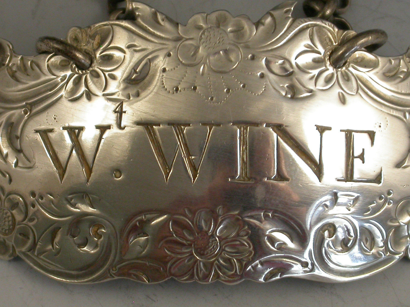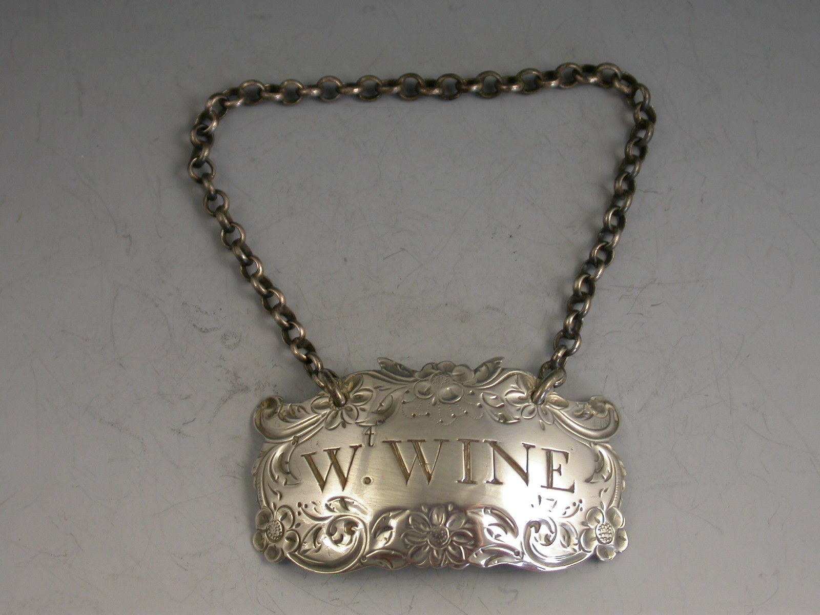 A rare early George III silver Wine Label of shaped cartouche form, the border chased with scrolls and flower heads, incised for Wt.Wine.