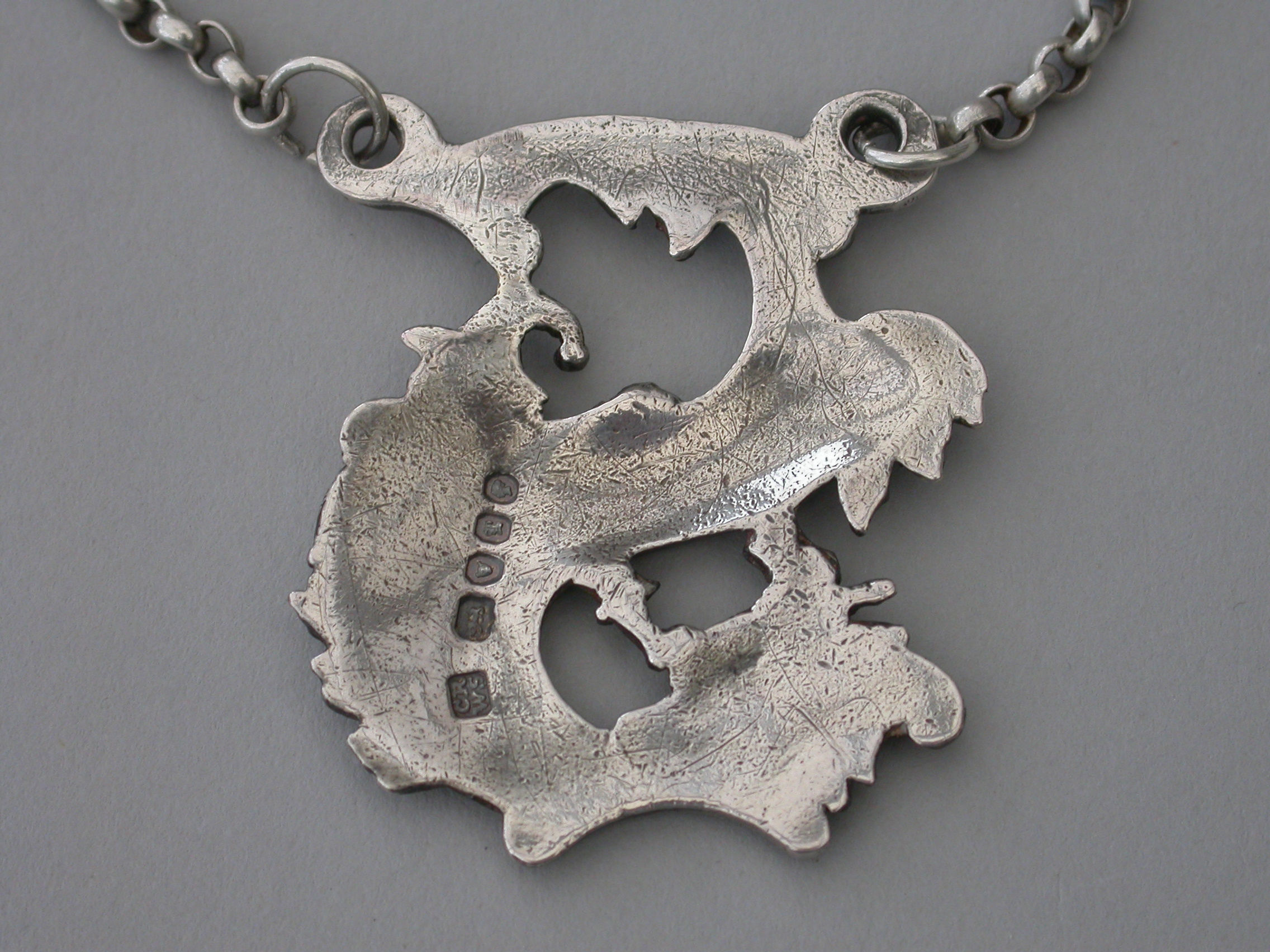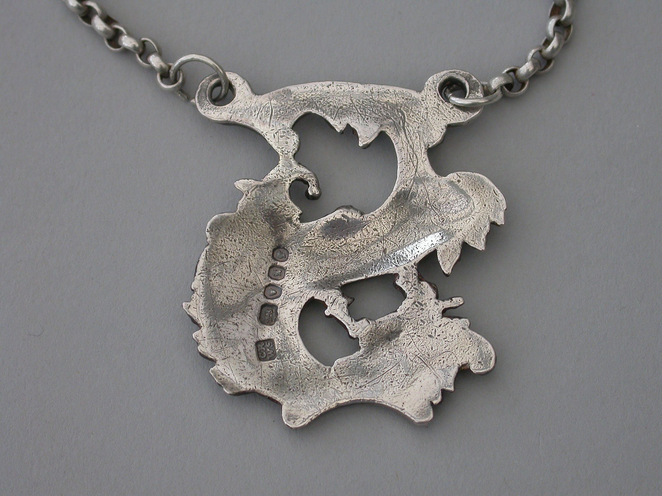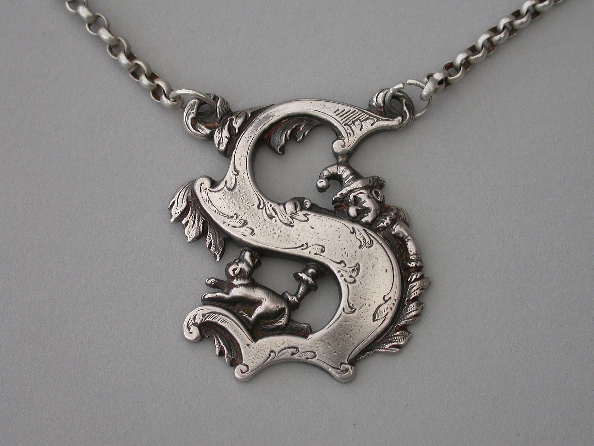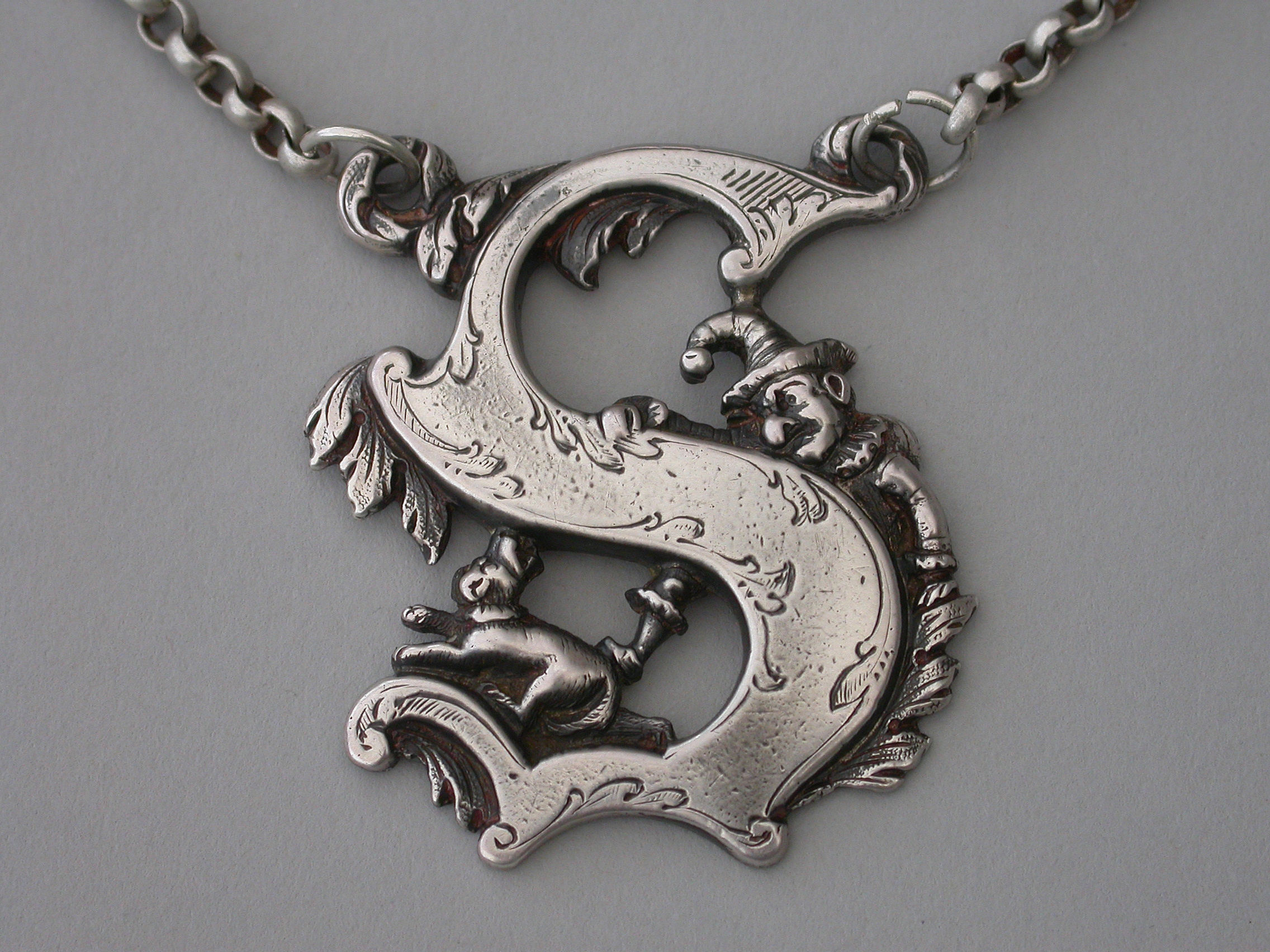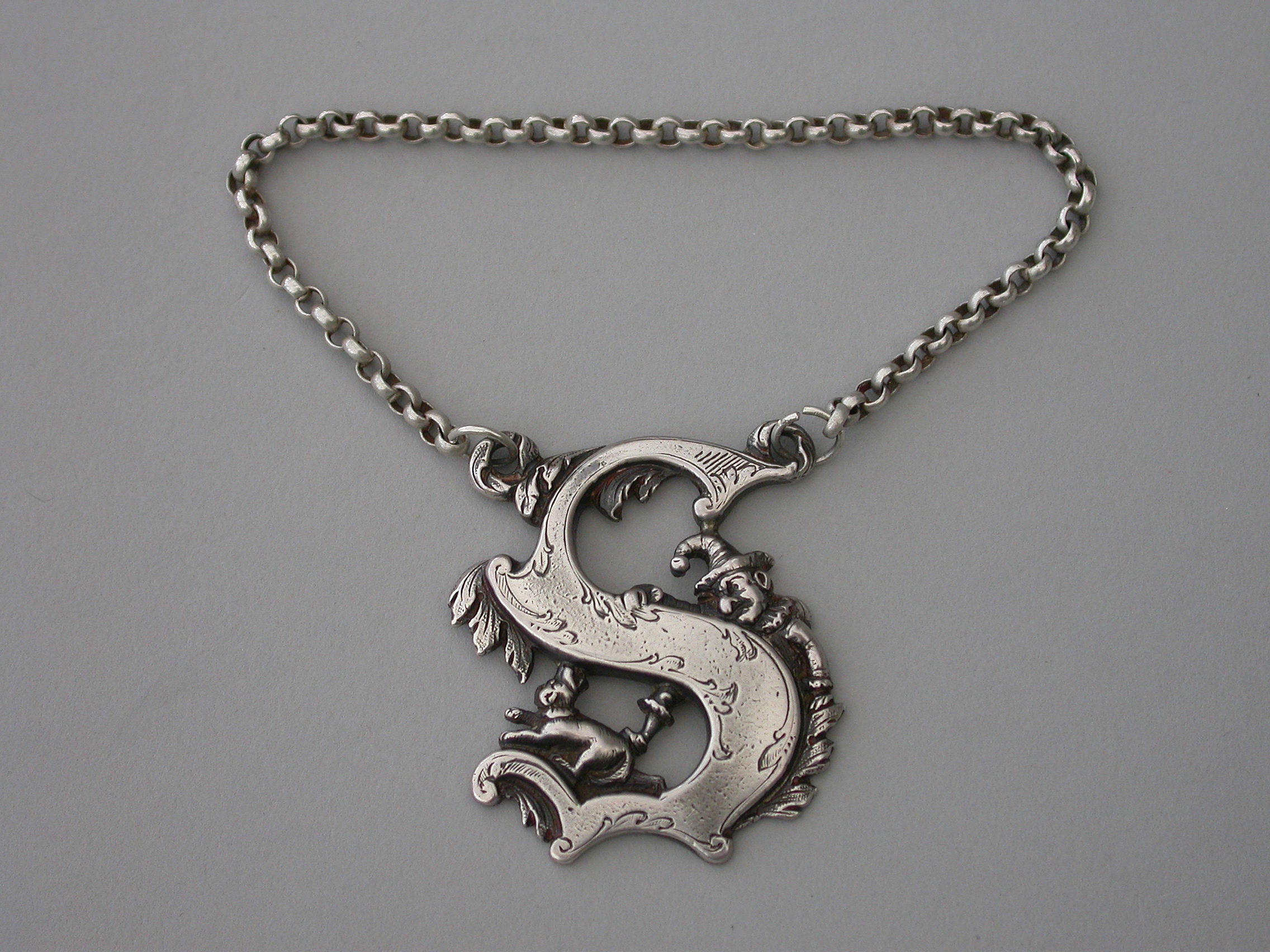 An extremely rare Victorian heavy cast silver Wine Label made in the form of a scrolled and engraved capital letter ’S’ with acanthus leaves and characters depicting Mr Punch kicking Dog Toby.