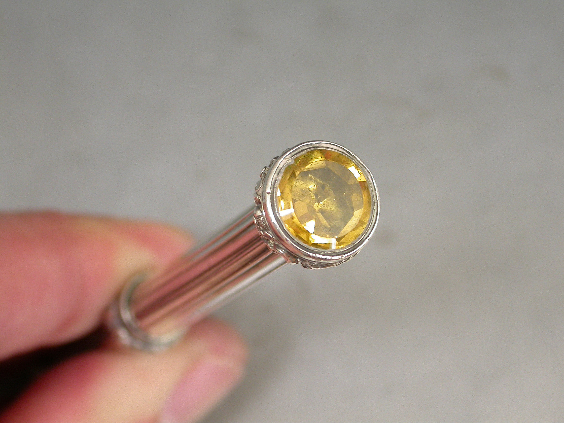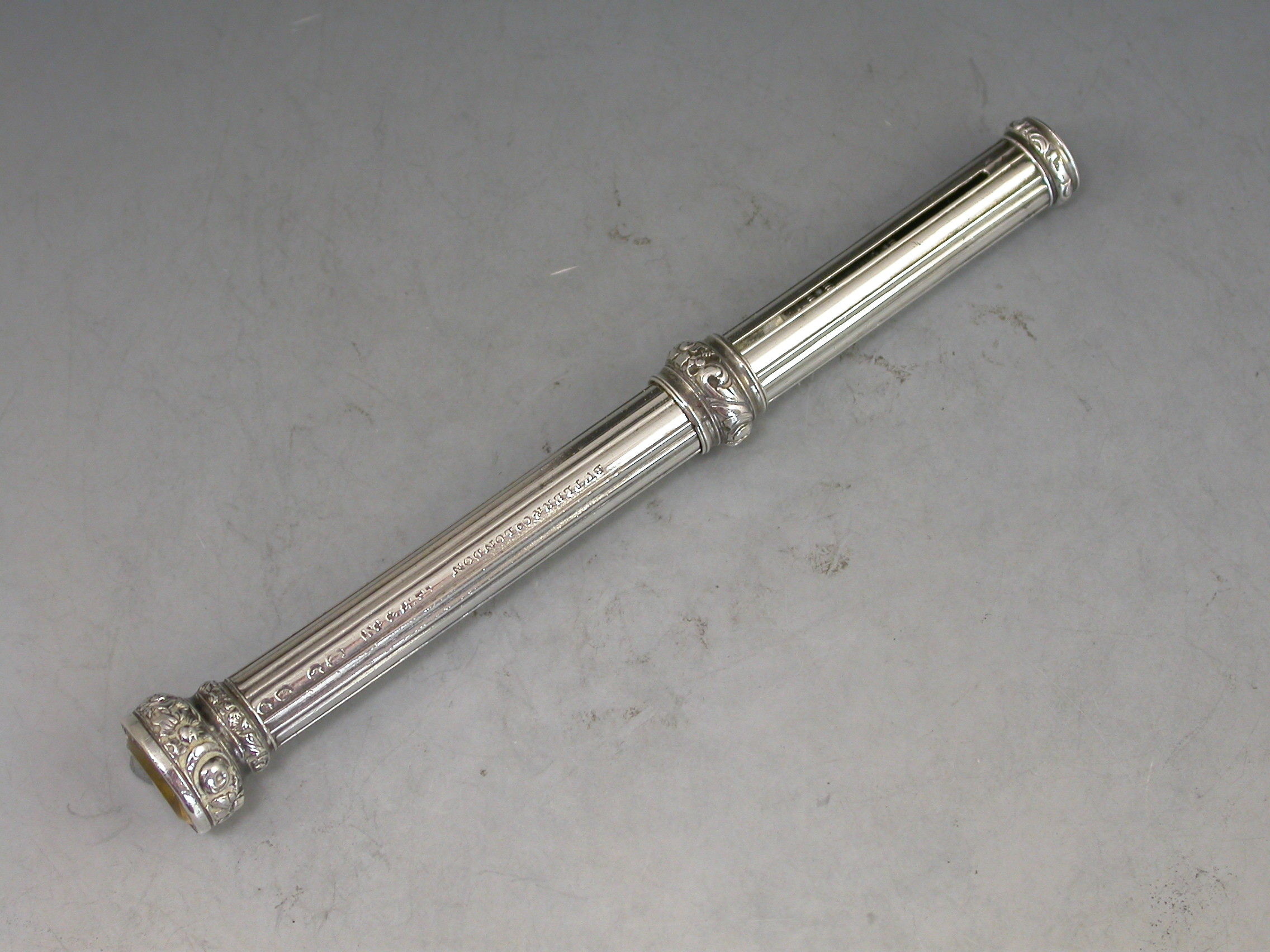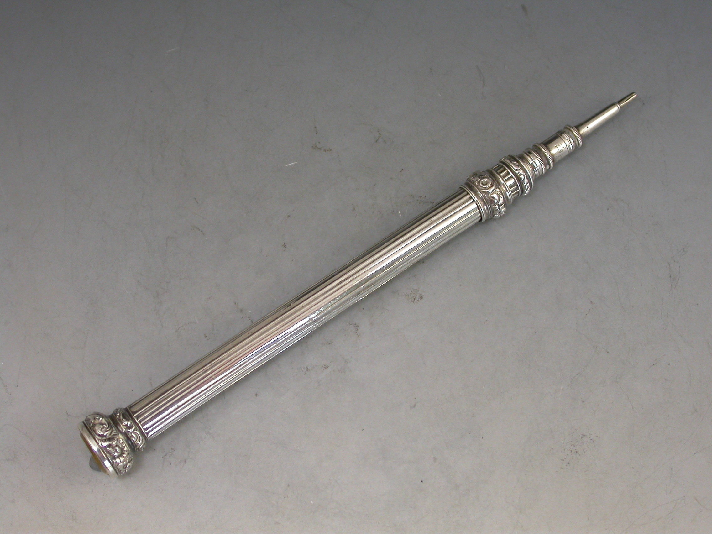 A good quality early Victorian fully hallmarked silver sliding Propelling Pencil with plain reeded barrel, chased foliate decoration to the slider ring and citrine set seal terminal.