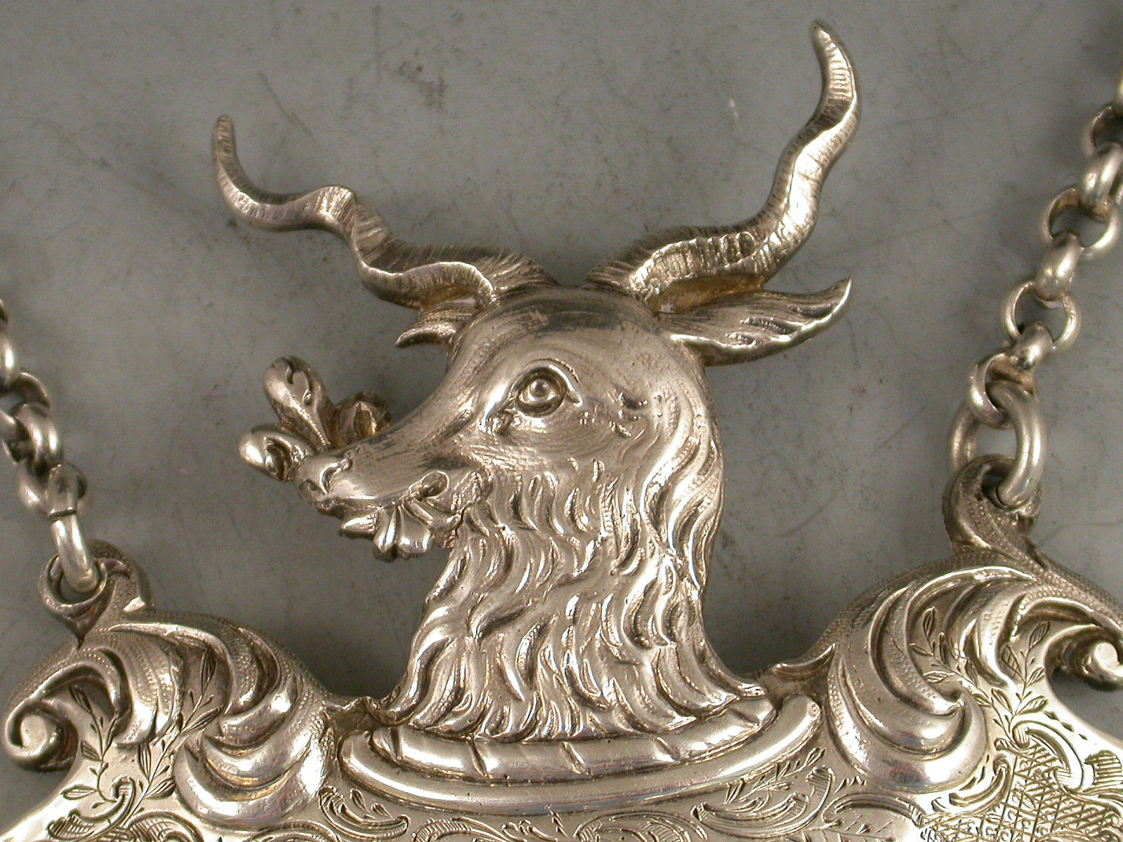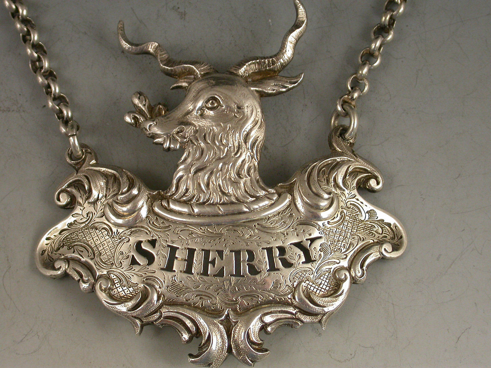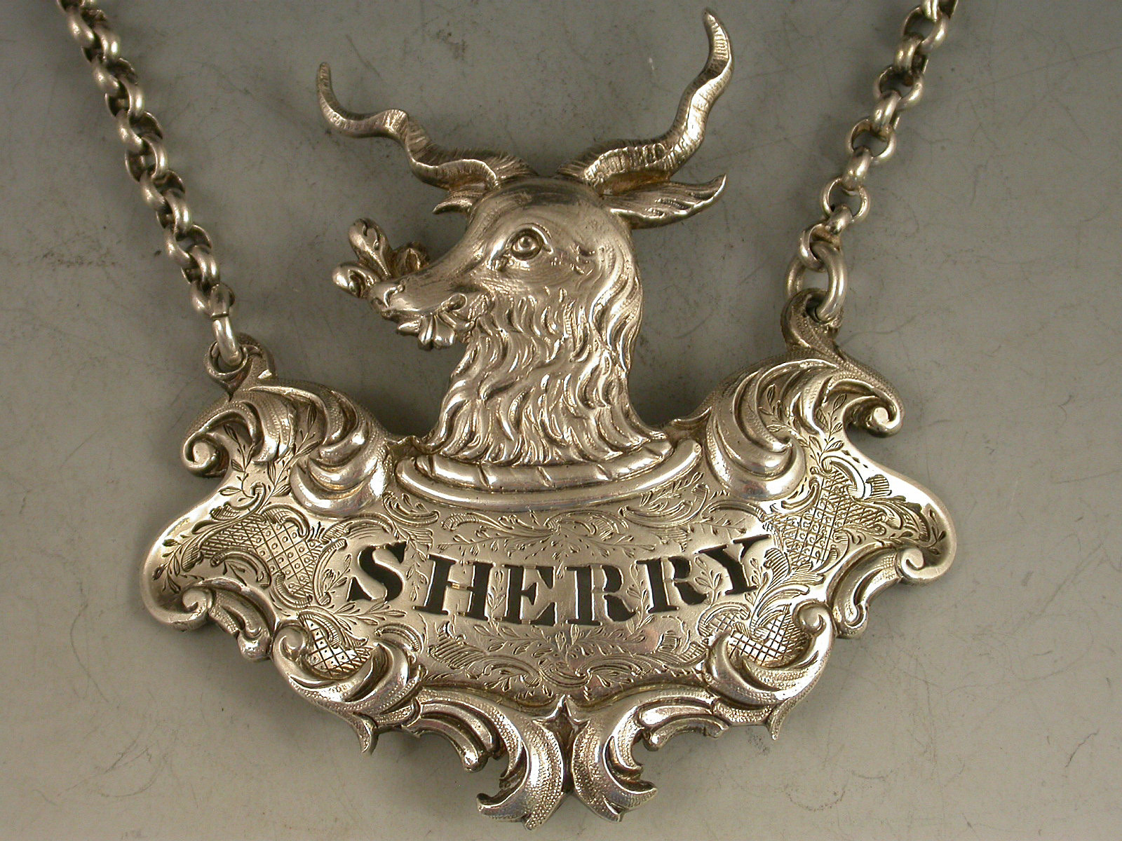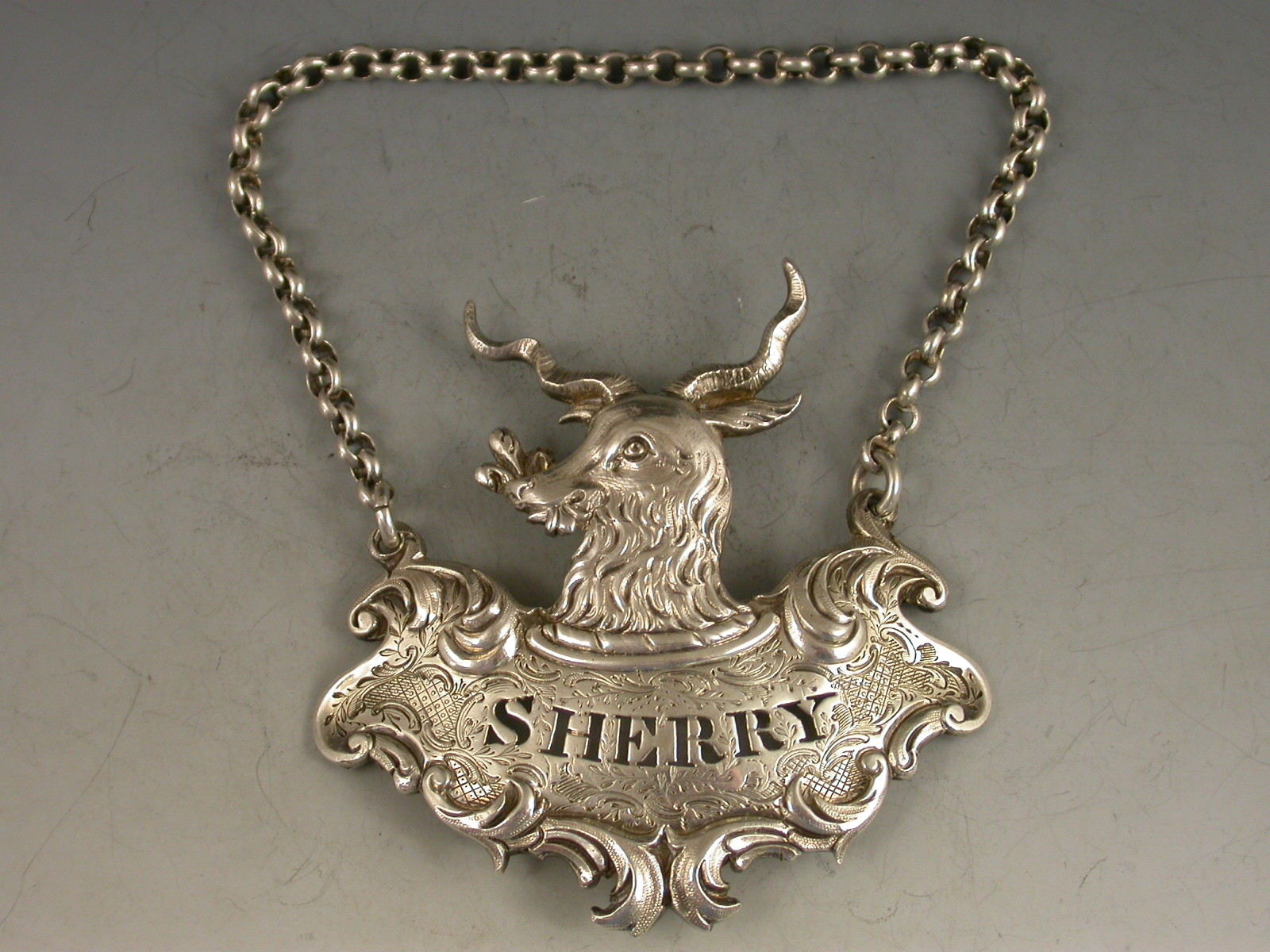 Early Victorian Goats Head Armorial Silver Wine Label 'Sherry'