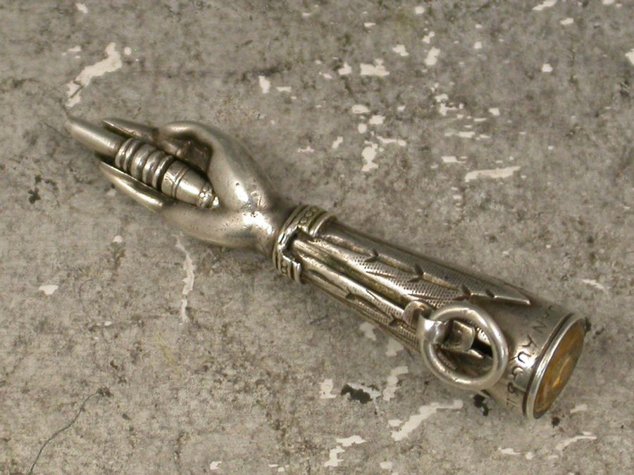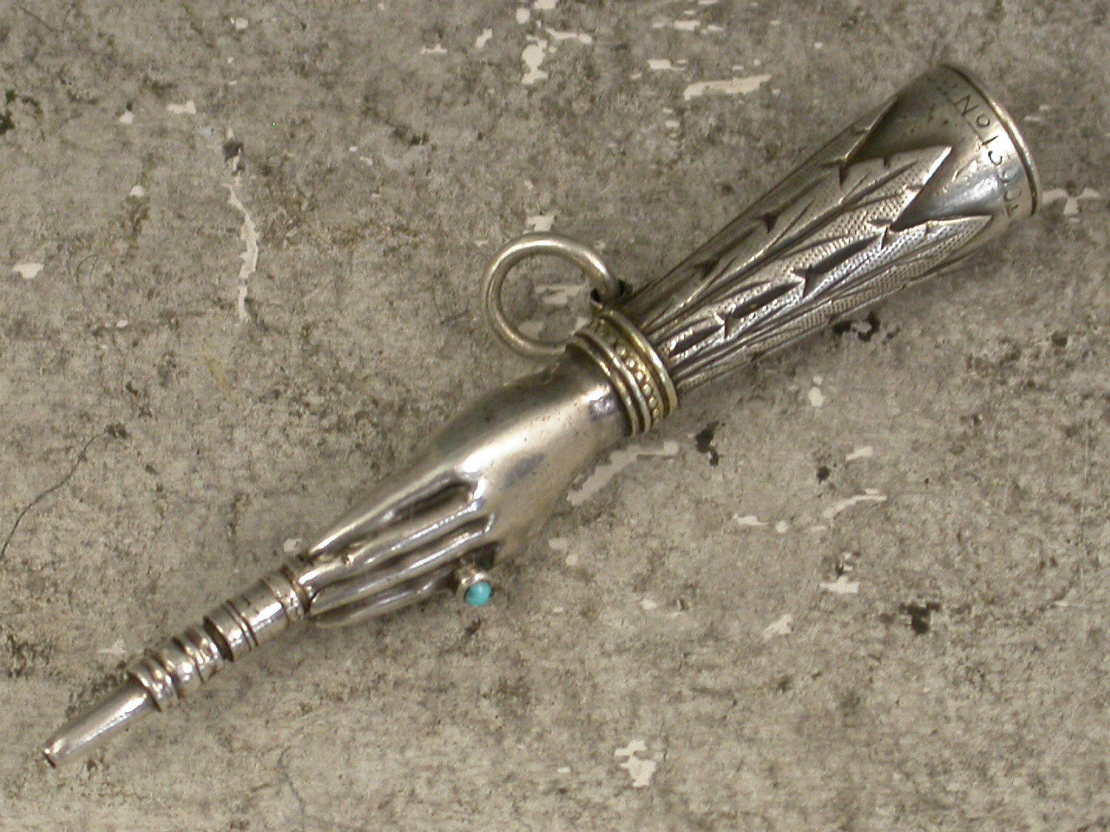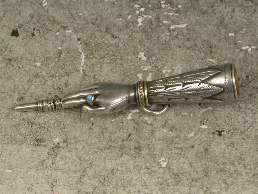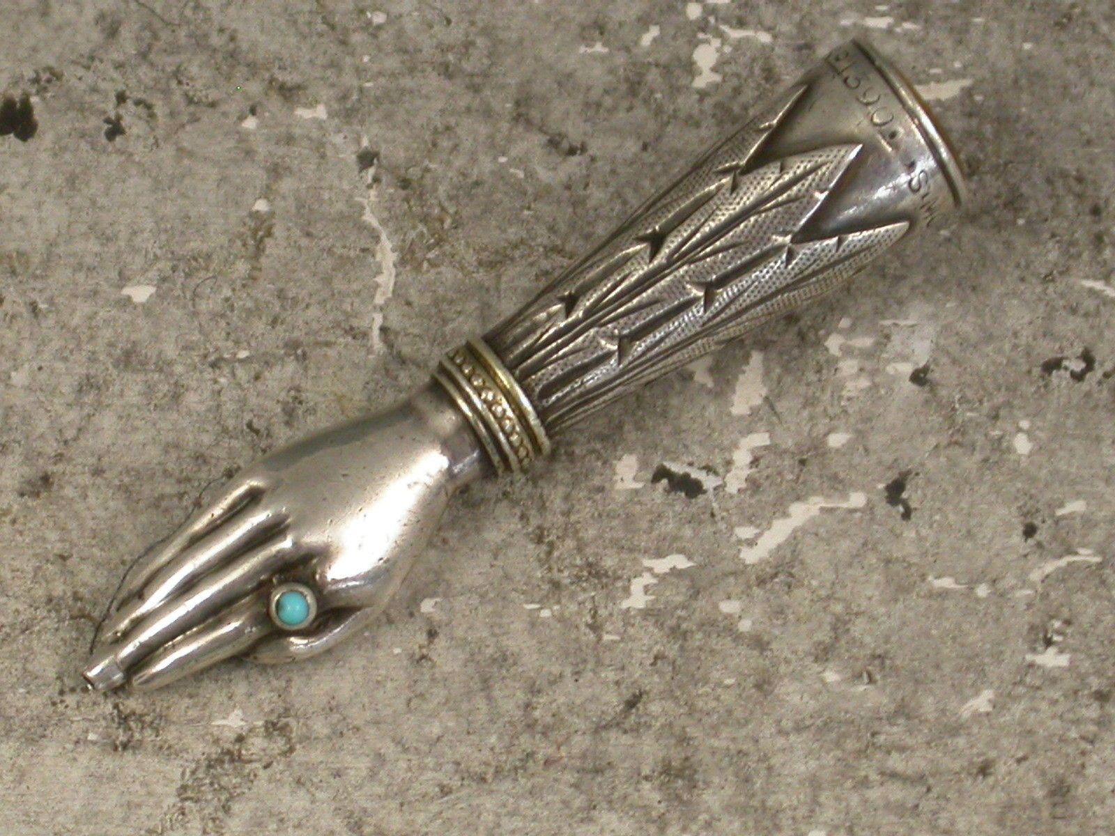 A very rare and early Victorian novelty silver Sliding Pencil, modelled in the form of a hand with turquoise ring on the index finger, applied and gilded decoration to the cuff. The terminal set with an citine coloured seal stone.