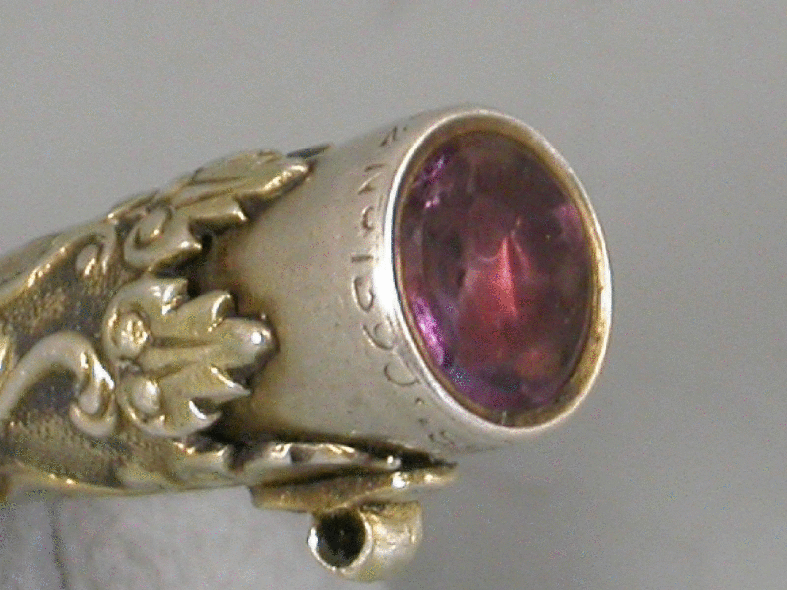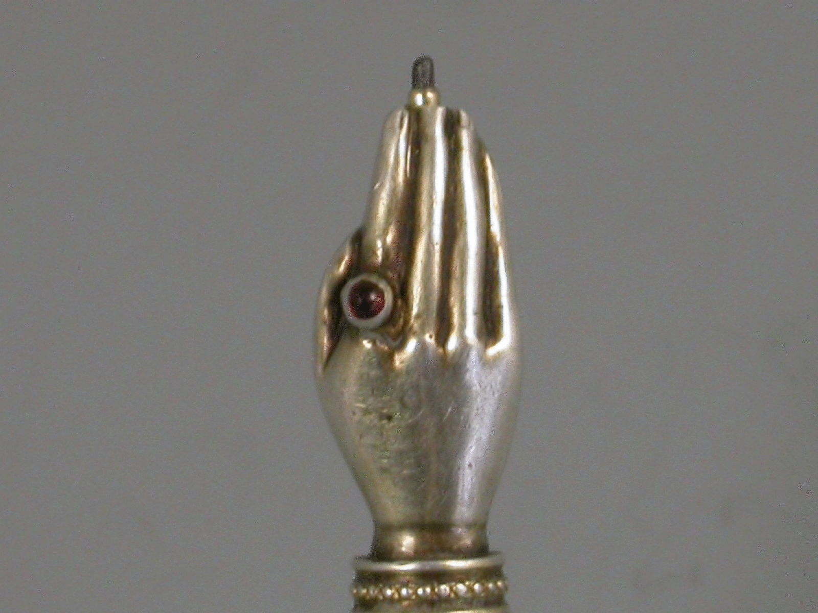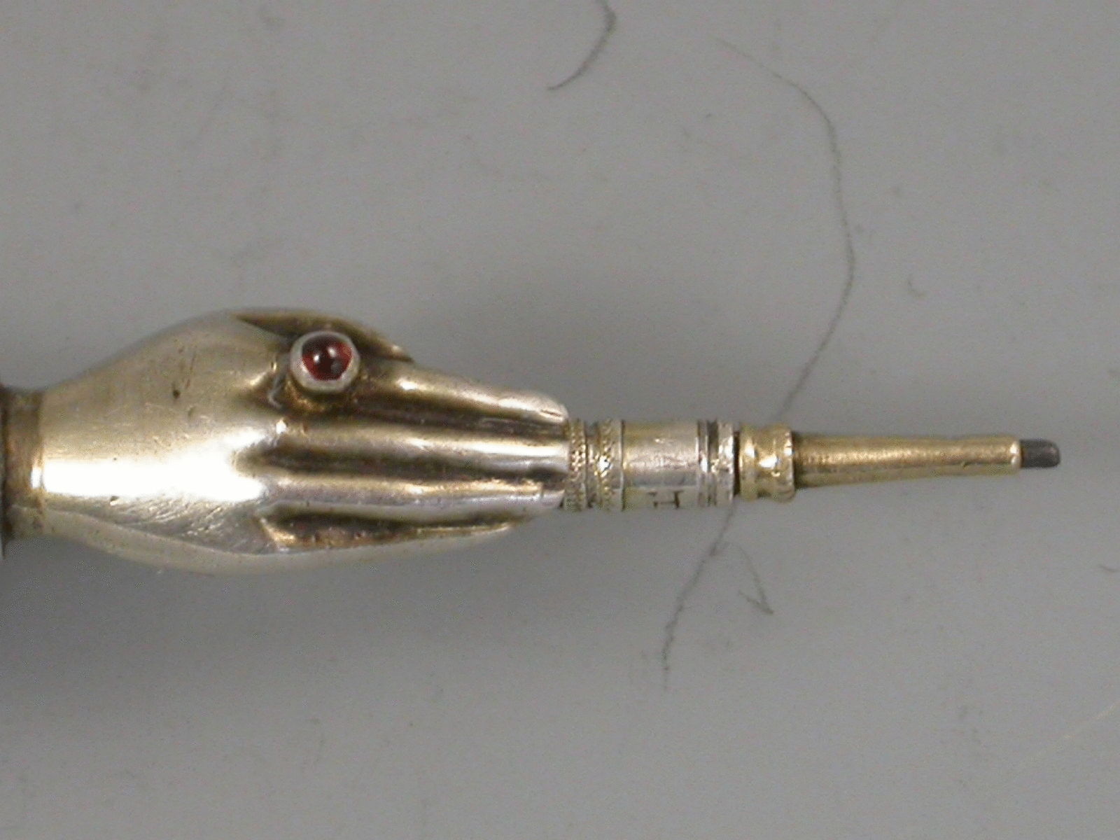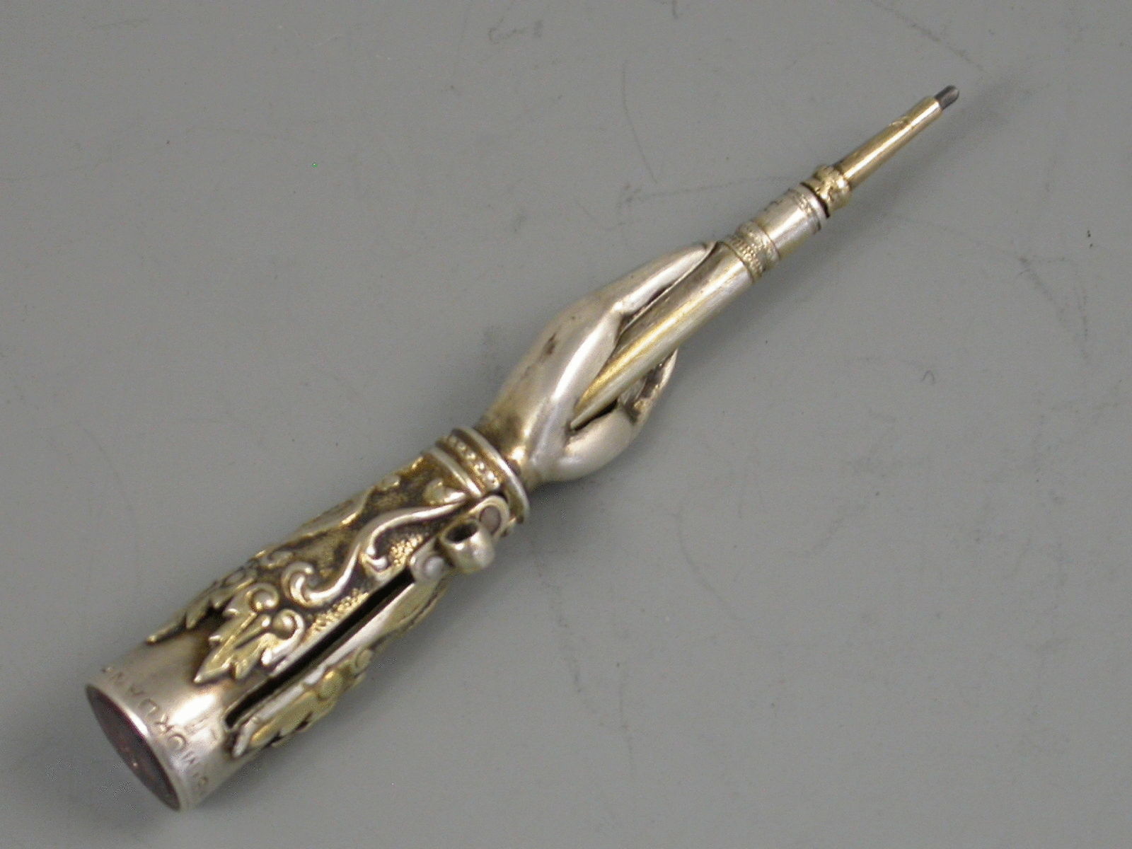 A very rare and early Victorian novelty silver Sliding Pencil, modelled in the form of a hand with red garnet ring on the index finger, applied and gilded decoration to the cuff. The terminal set with an amethyst coloured seal stone.