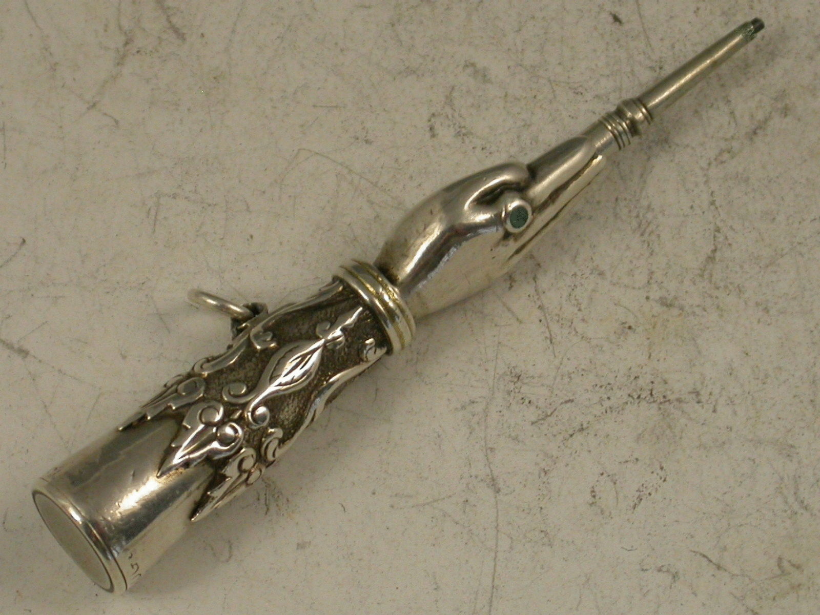 A very scarce and early Victorian novelty silver Slider Pencil, modelled in the form of a hand with blue enamel ring on the index finger, applied decoration to the cuff, with attached suspension ring.