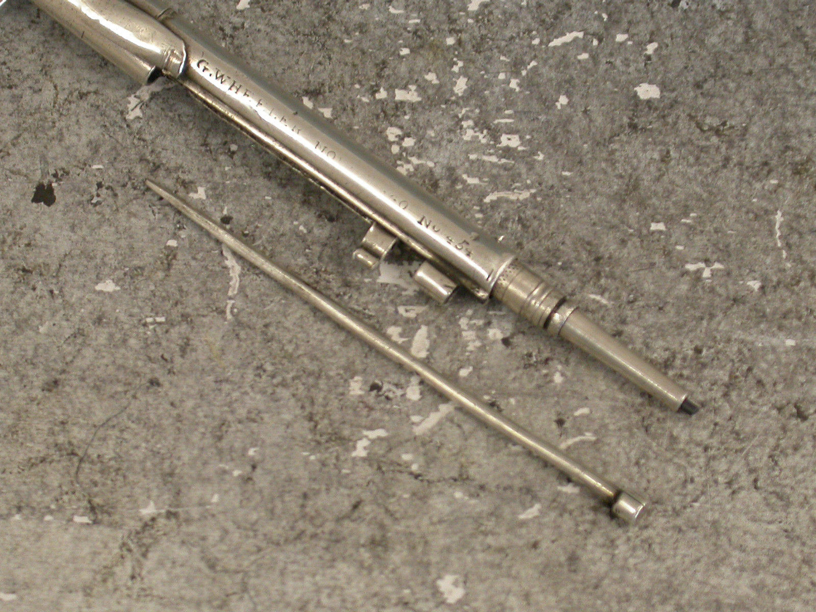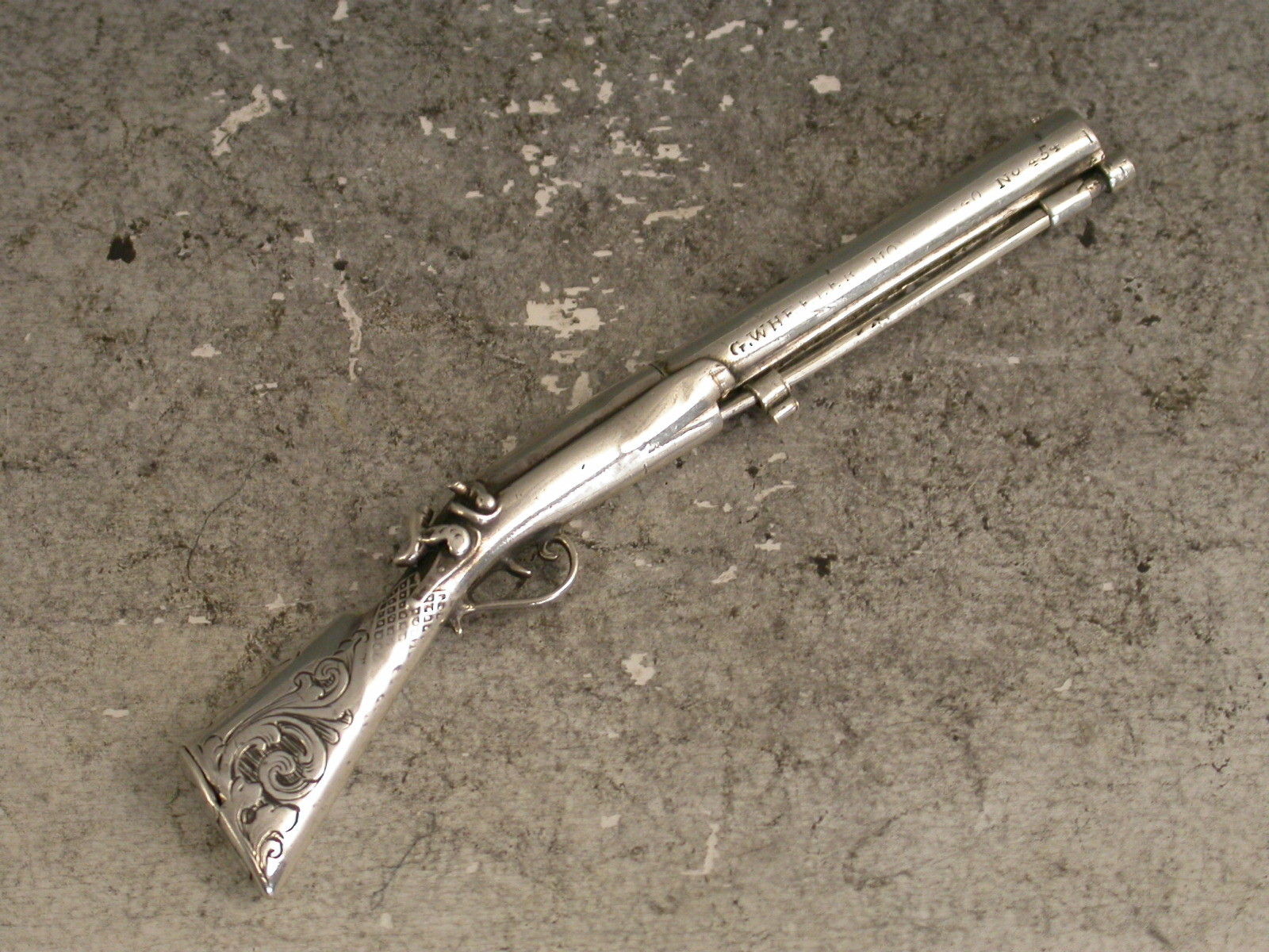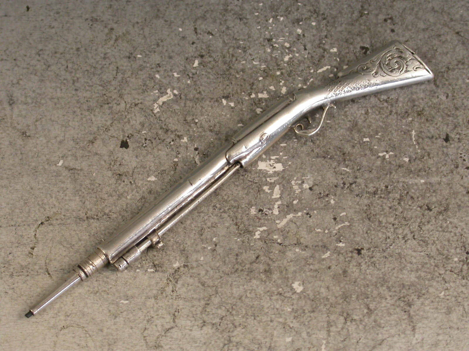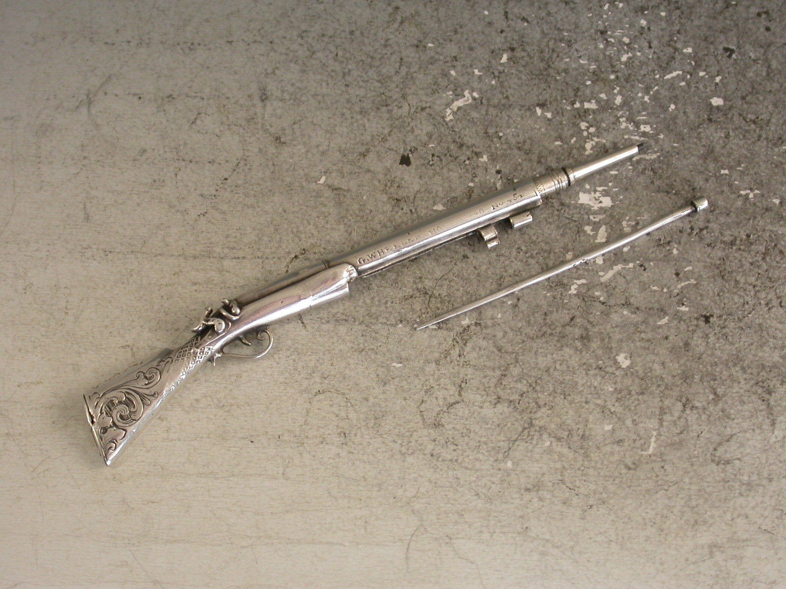 A rare early Victorian novelty silver Propelling Pencil combined with a Toothpick, made in the form of a Percussion Musket, the engraved butt with hinge-lidded lead reservoir to heel. The pencil within the barrel is ejected by sliding the ramrod which is also the toothpick. The barrel stamped: ""G.Wheeler Novr 9 1840. No 454"