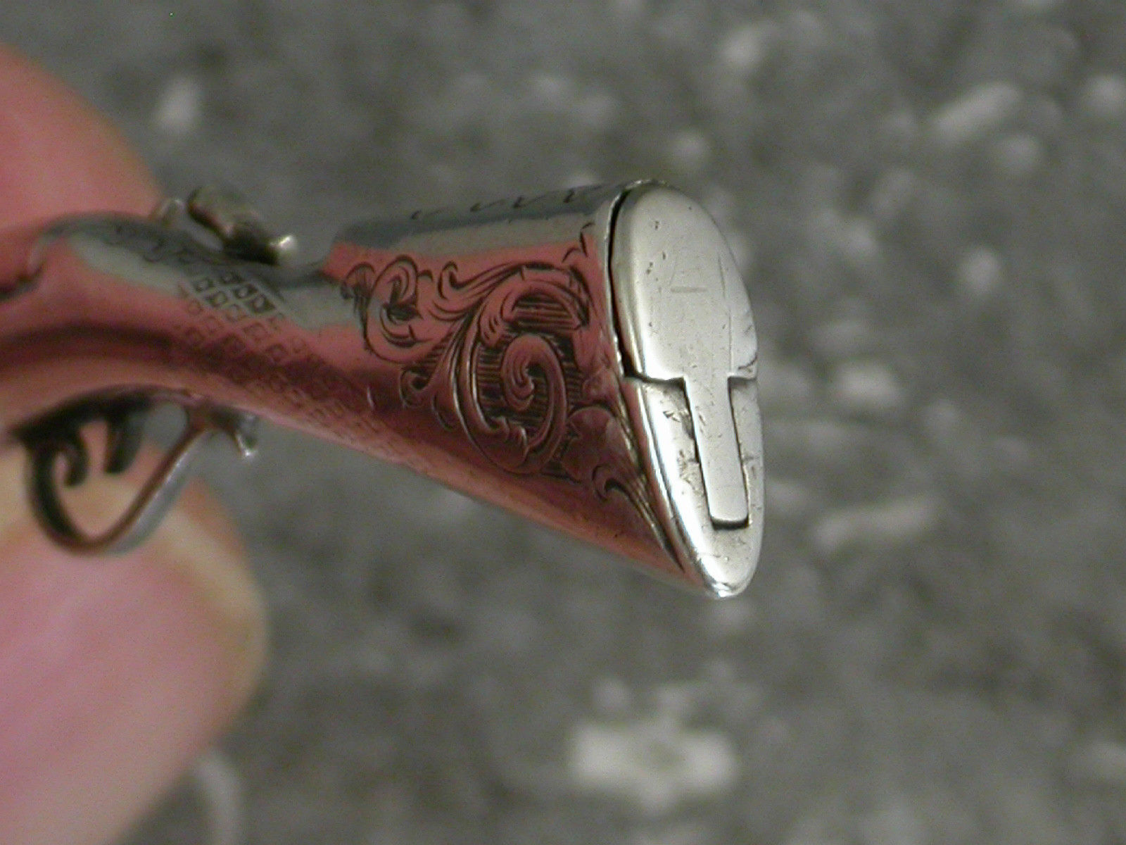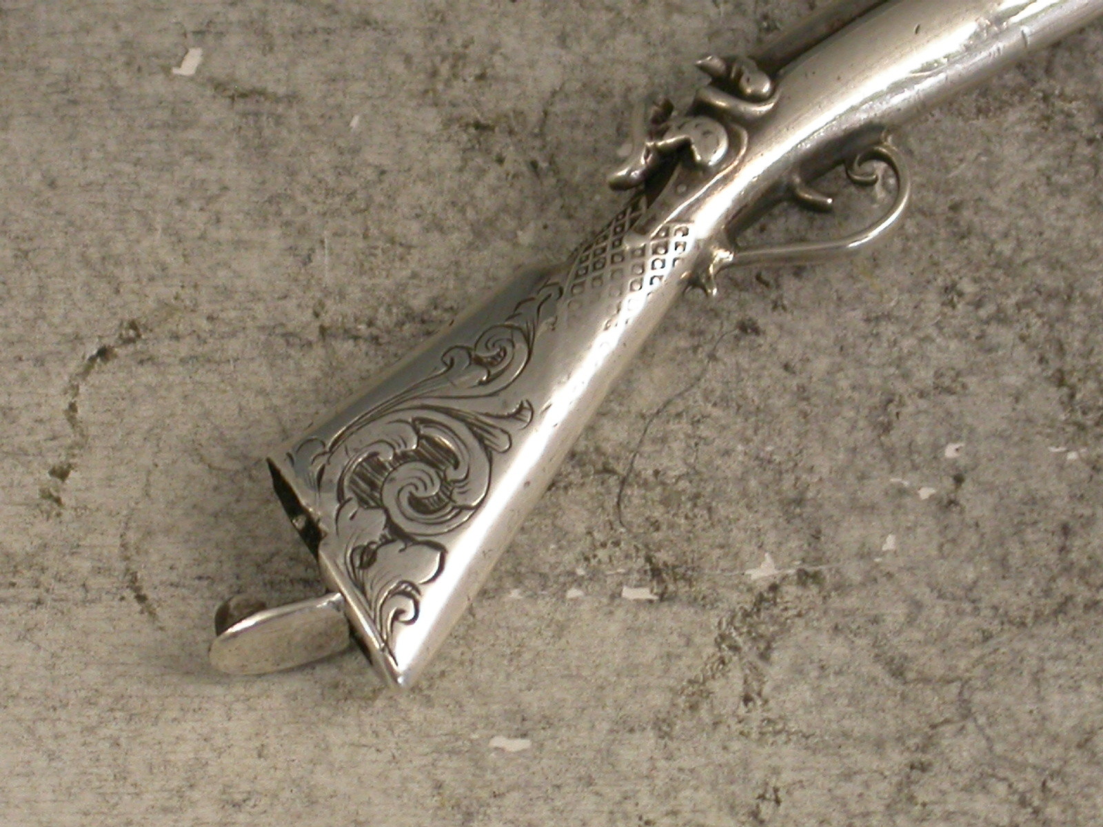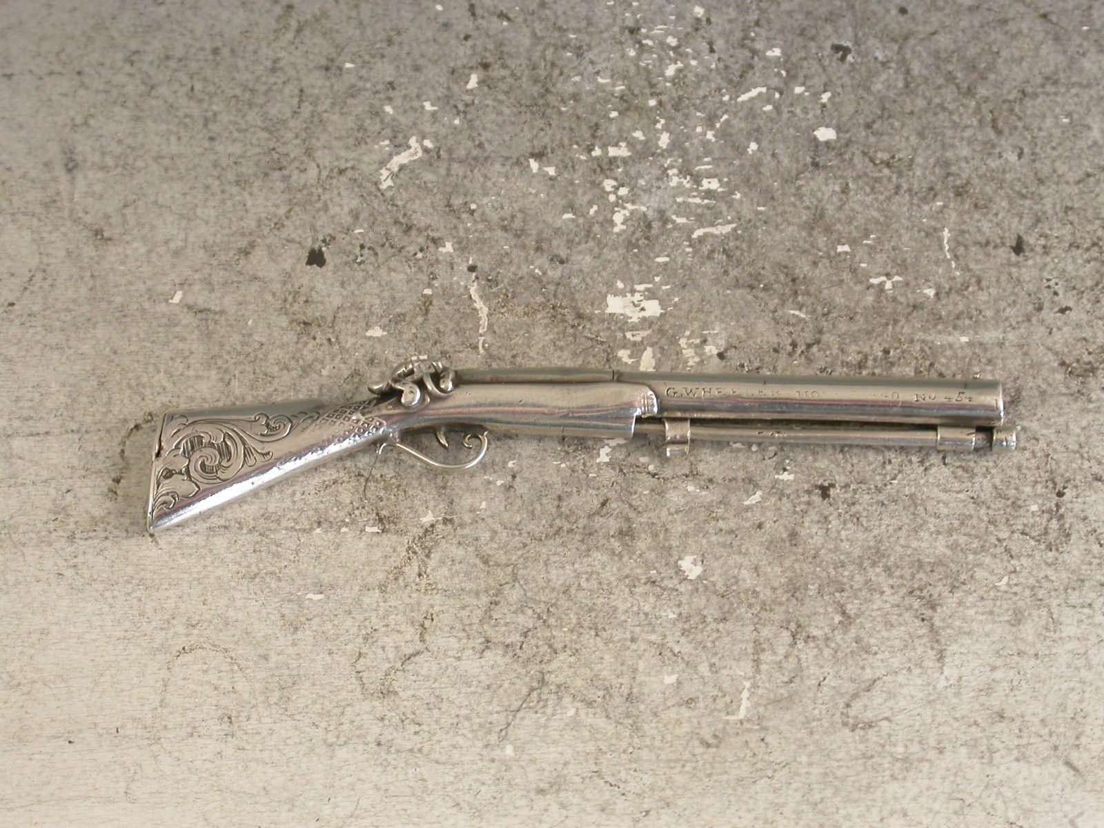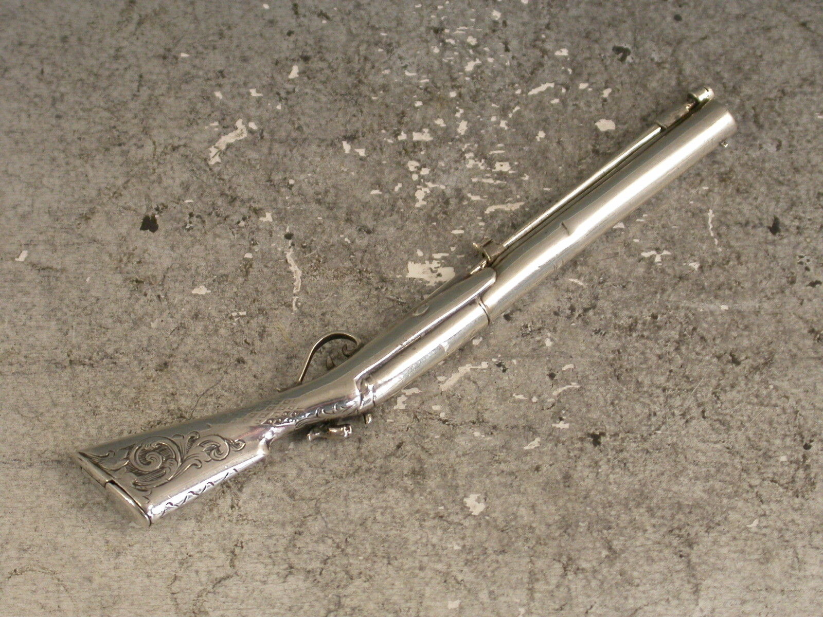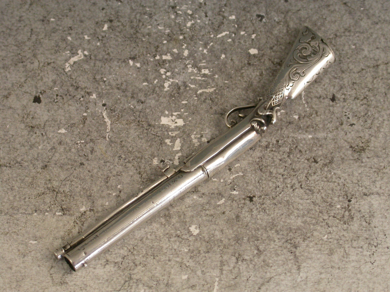 A rare early Victorian novelty silver Propelling Pencil combined with a Toothpick, made in the form of a Percussion Musket, the engraved butt with hinge-lidded lead reservoir to heel. The pencil within the barrel is ejected by sliding the ramrod which is also the toothpick. The barrel stamped: ""G.Wheeler Novr 9 1840. No 454"