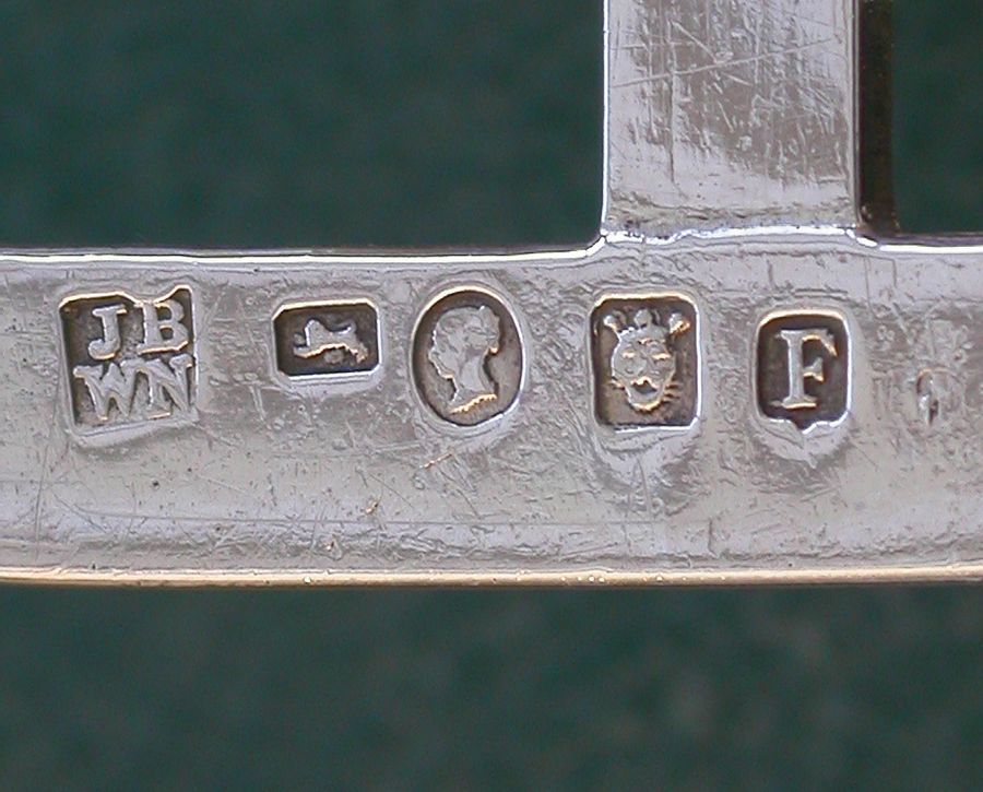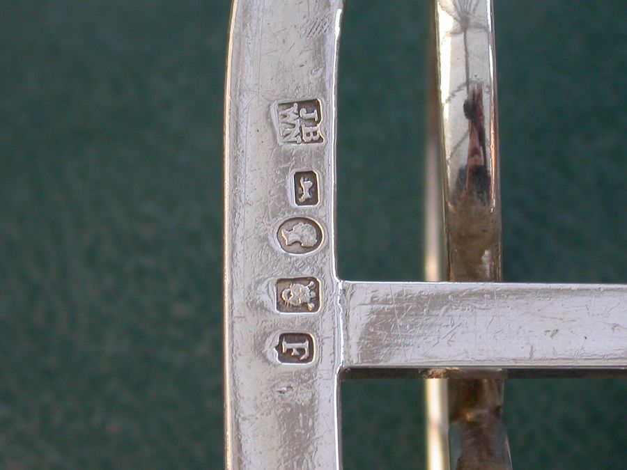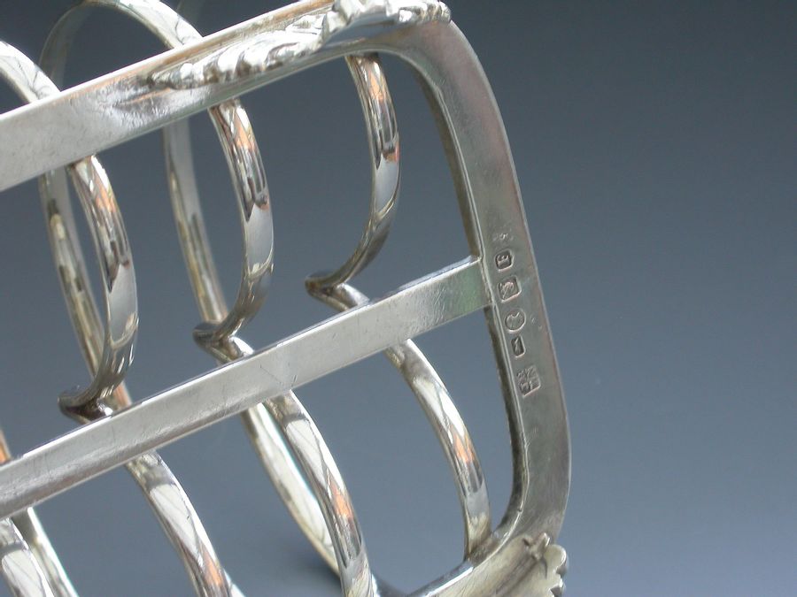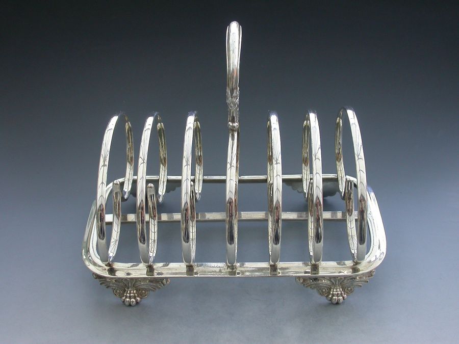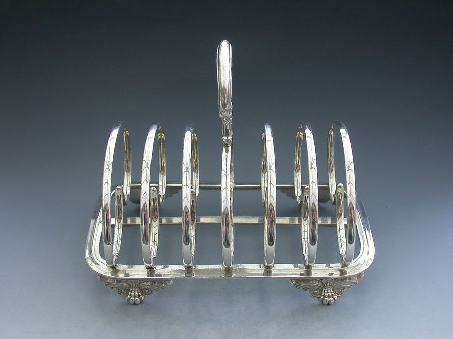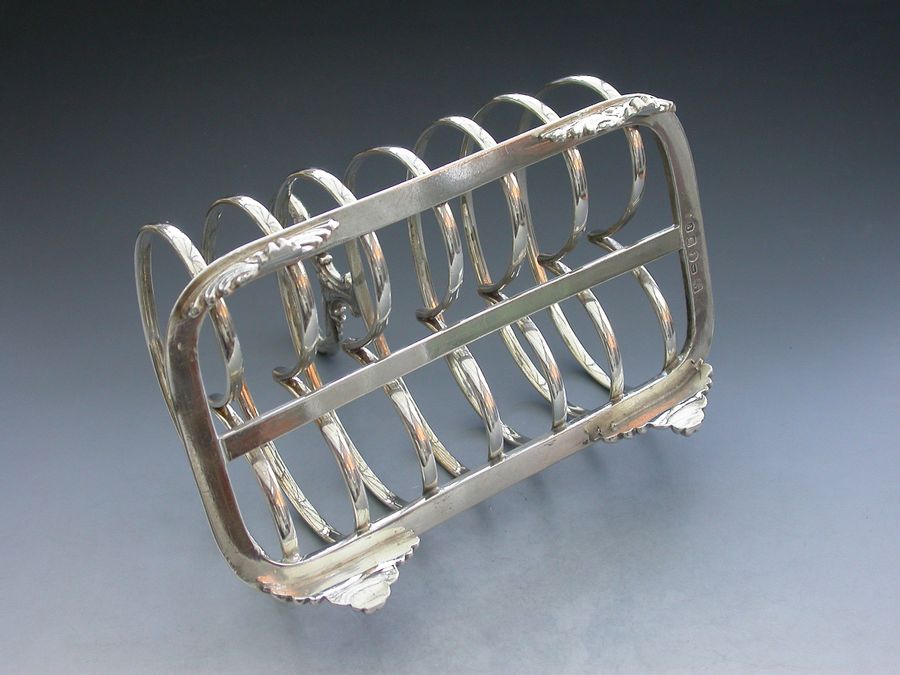 A fine quality and rare early Victorian Provincial silver Toast Rack, standing on a rounded rectangular platform with four cast winged paw feet, six heart shaped divisions and an oval carrying handle decorated with scrolls and leaves.