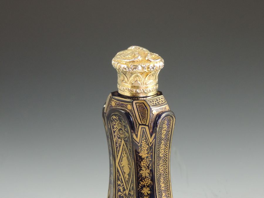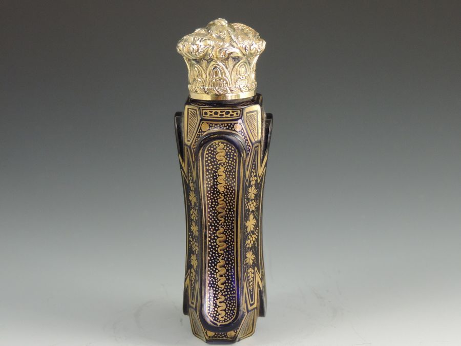 Early Victorian Silver Gilt Mounted Blue Glass Gilt Enriched Scent Bottle