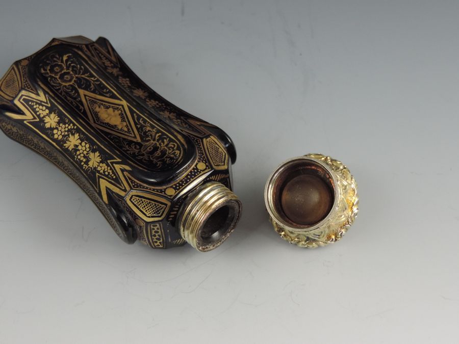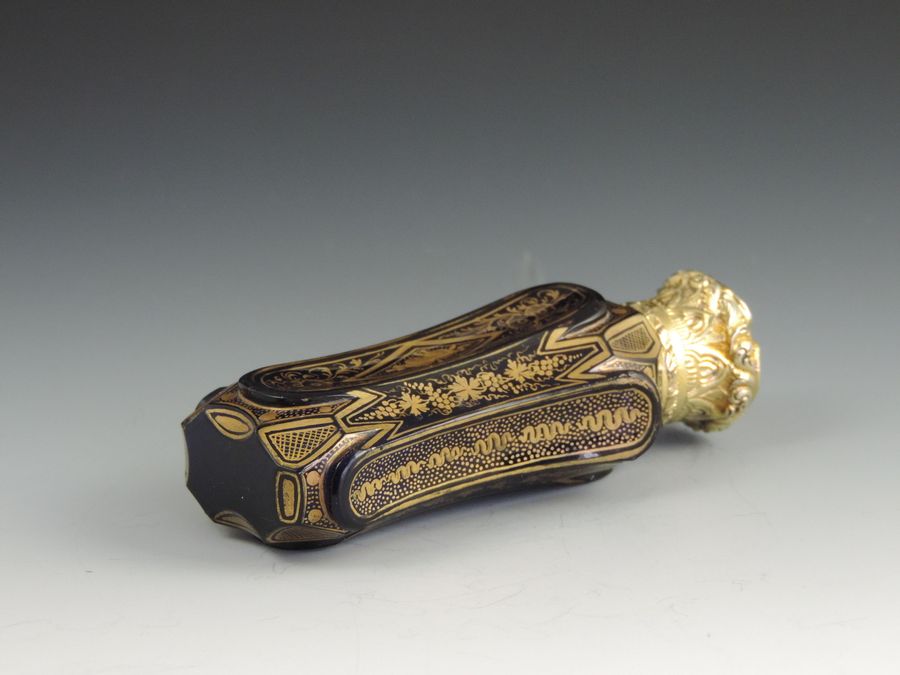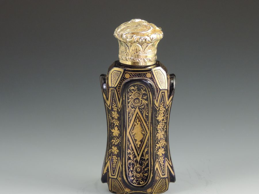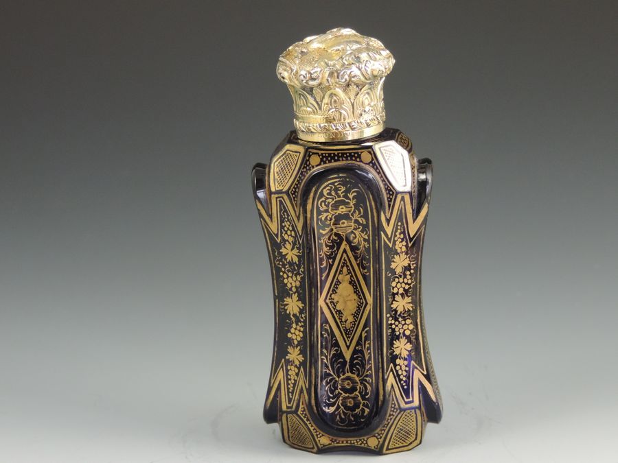 A fine quality early Victorian silver gilt mounted blue glass Scent Bottle of shaped faceted form, the blue glass highlighted with gilt floral and grape decoration. The silver gilt screw-off cap chased with scrolls and an eagle displayed and complete with R.B. Cooper's Patent glass ball stopper closure.