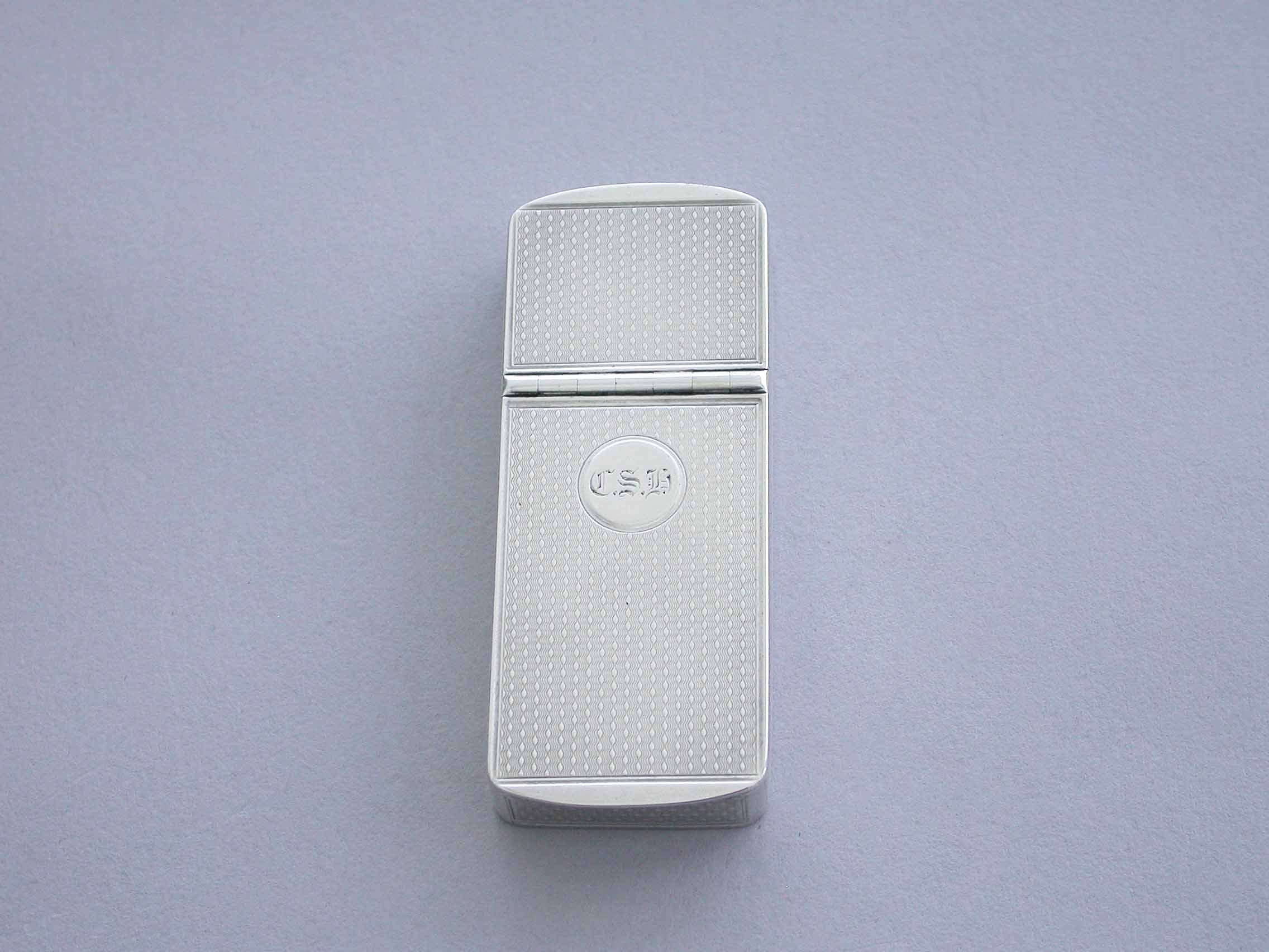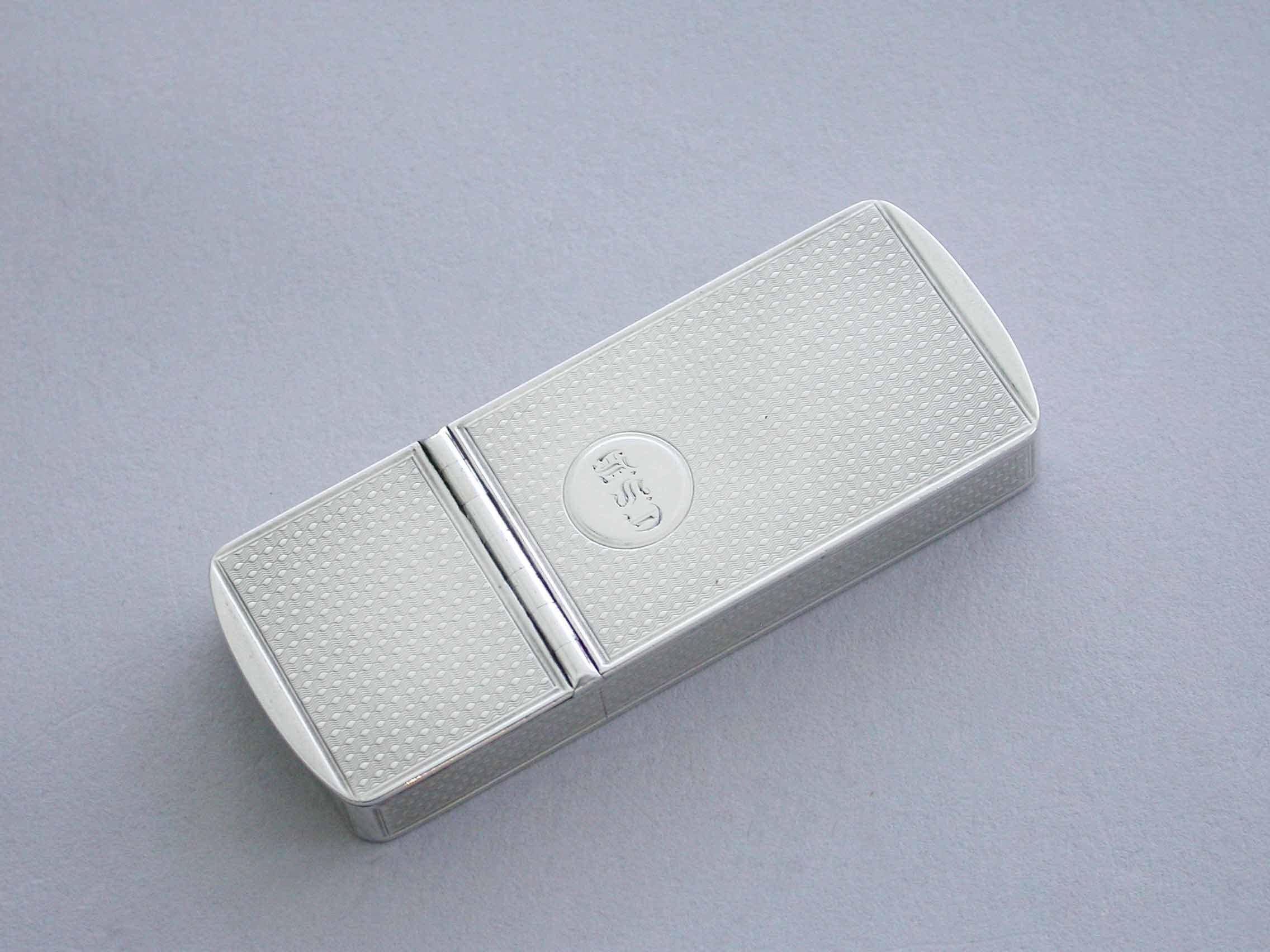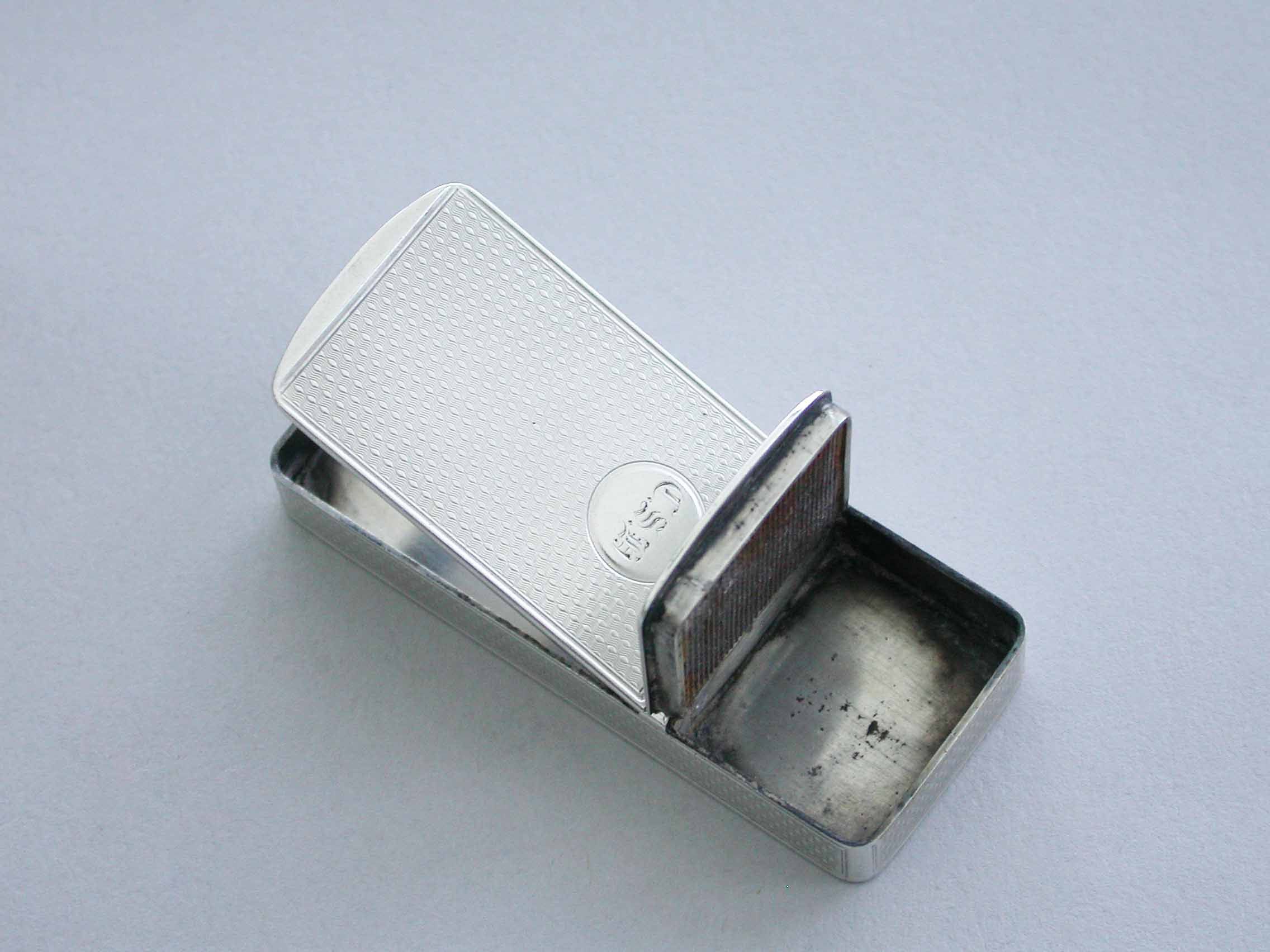 An early Victorian silver twin compartment Vesta Case of flat rectangular form with engine turned decoration and a circular cartouche engraved with contemporary initials, two hinged lids with a metal striker attached to the smaller interior lid.