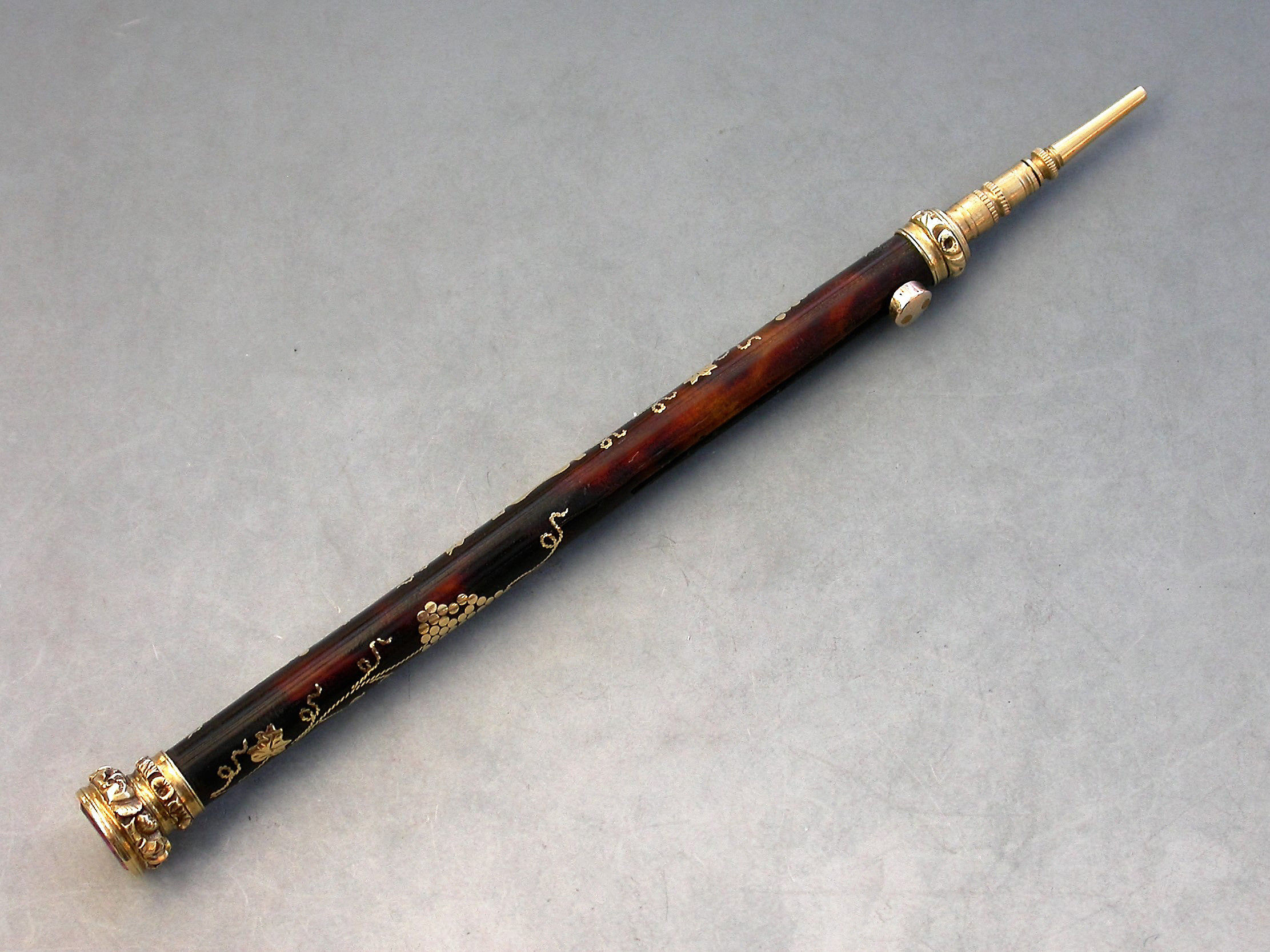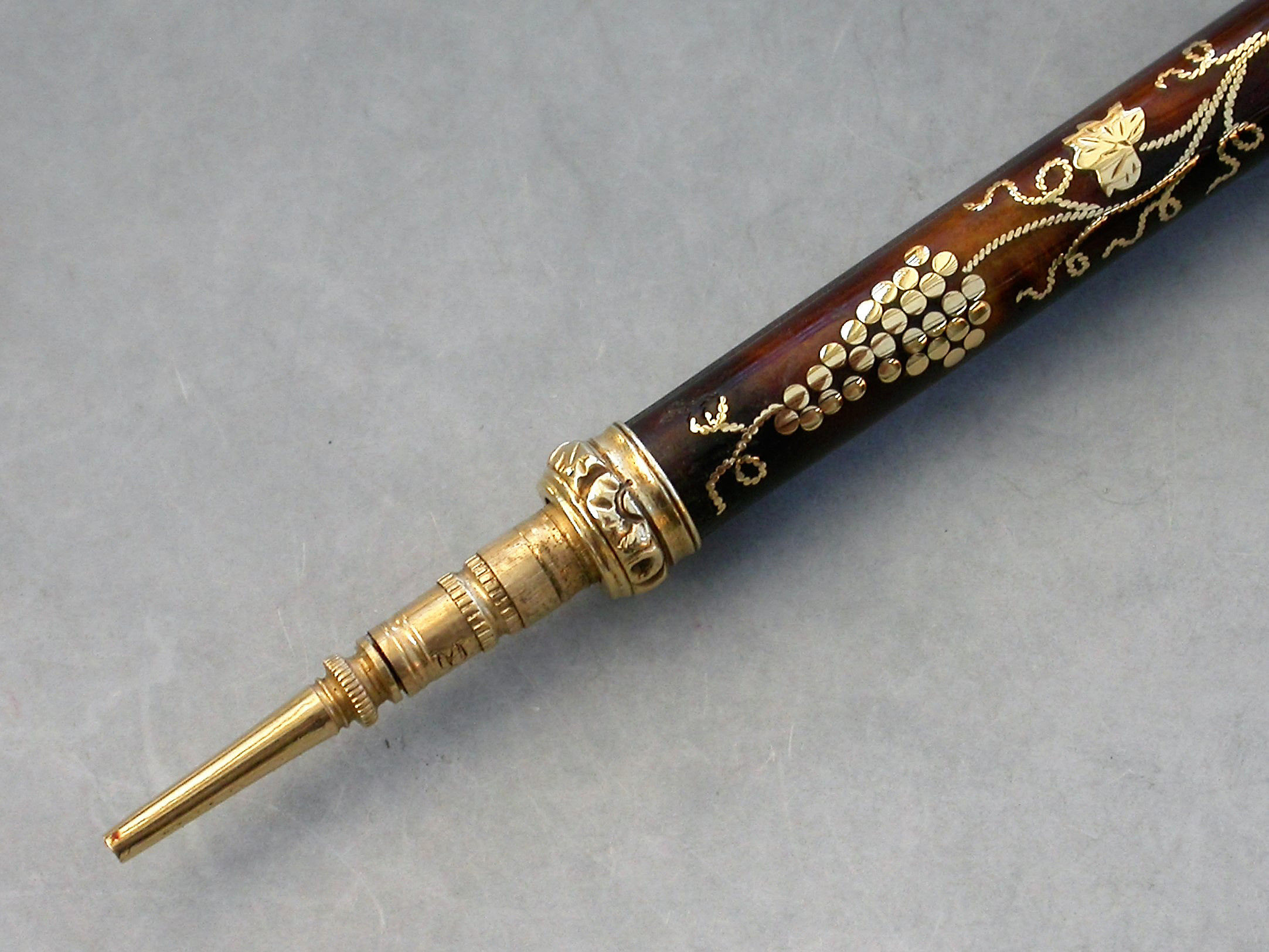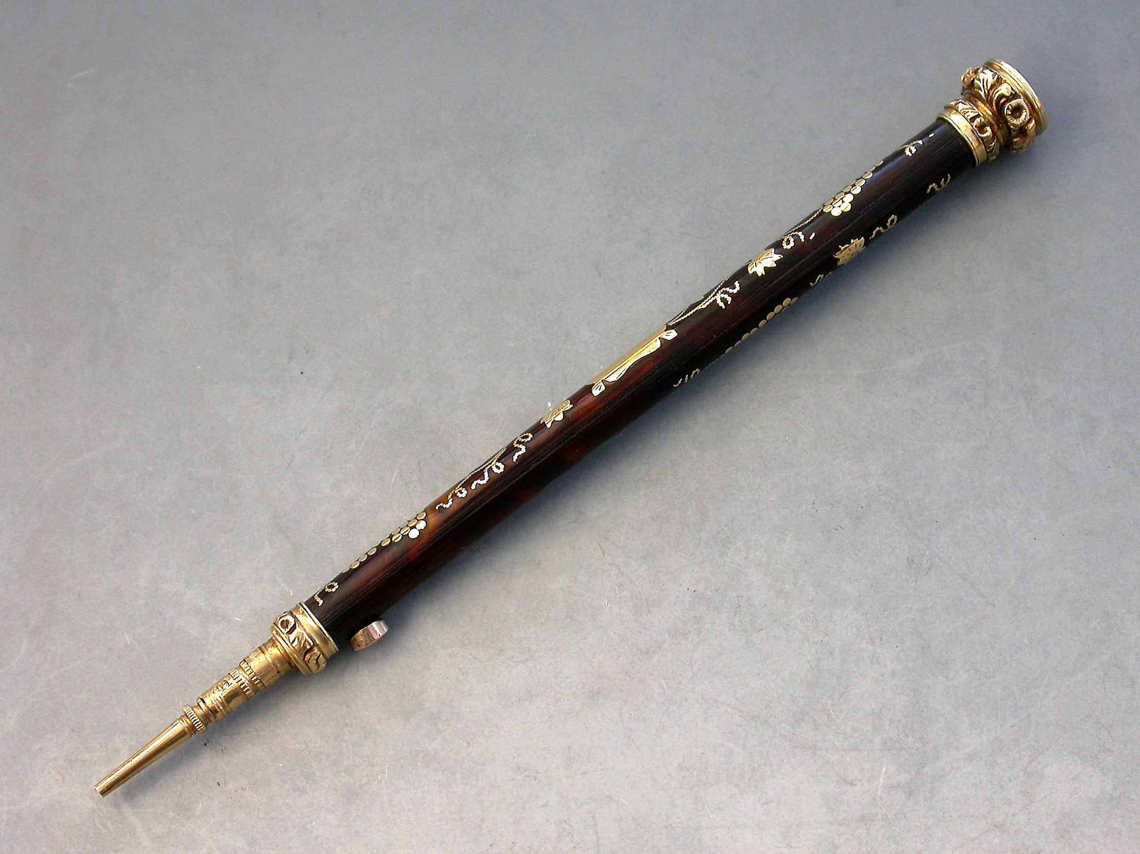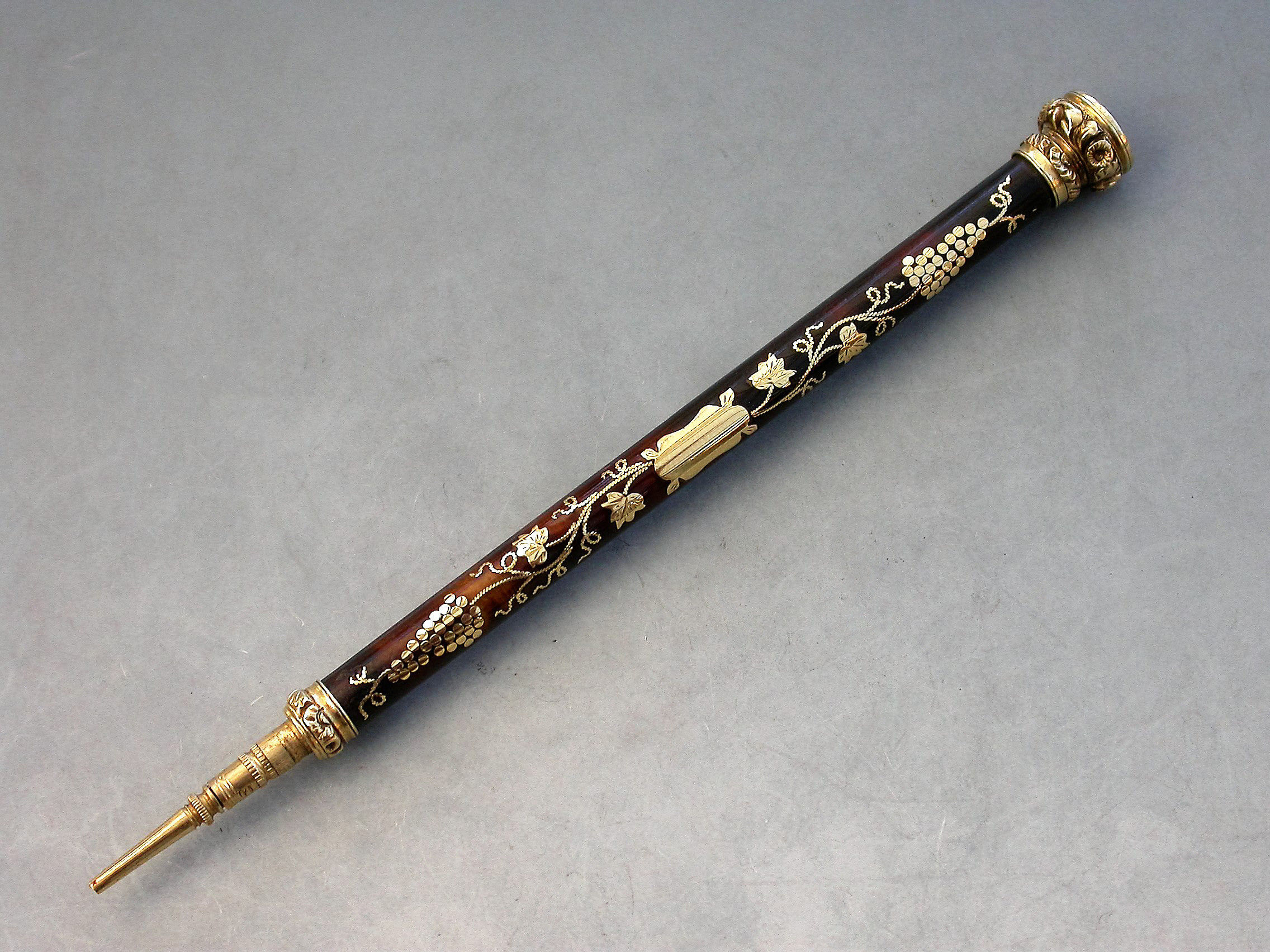 A very fine quality gold mounted tortoiseshell and pique work sliding Propelling Pencil with inlaid vine leaf and grape decoration, the chased terminal set with an amethyst seal stone.