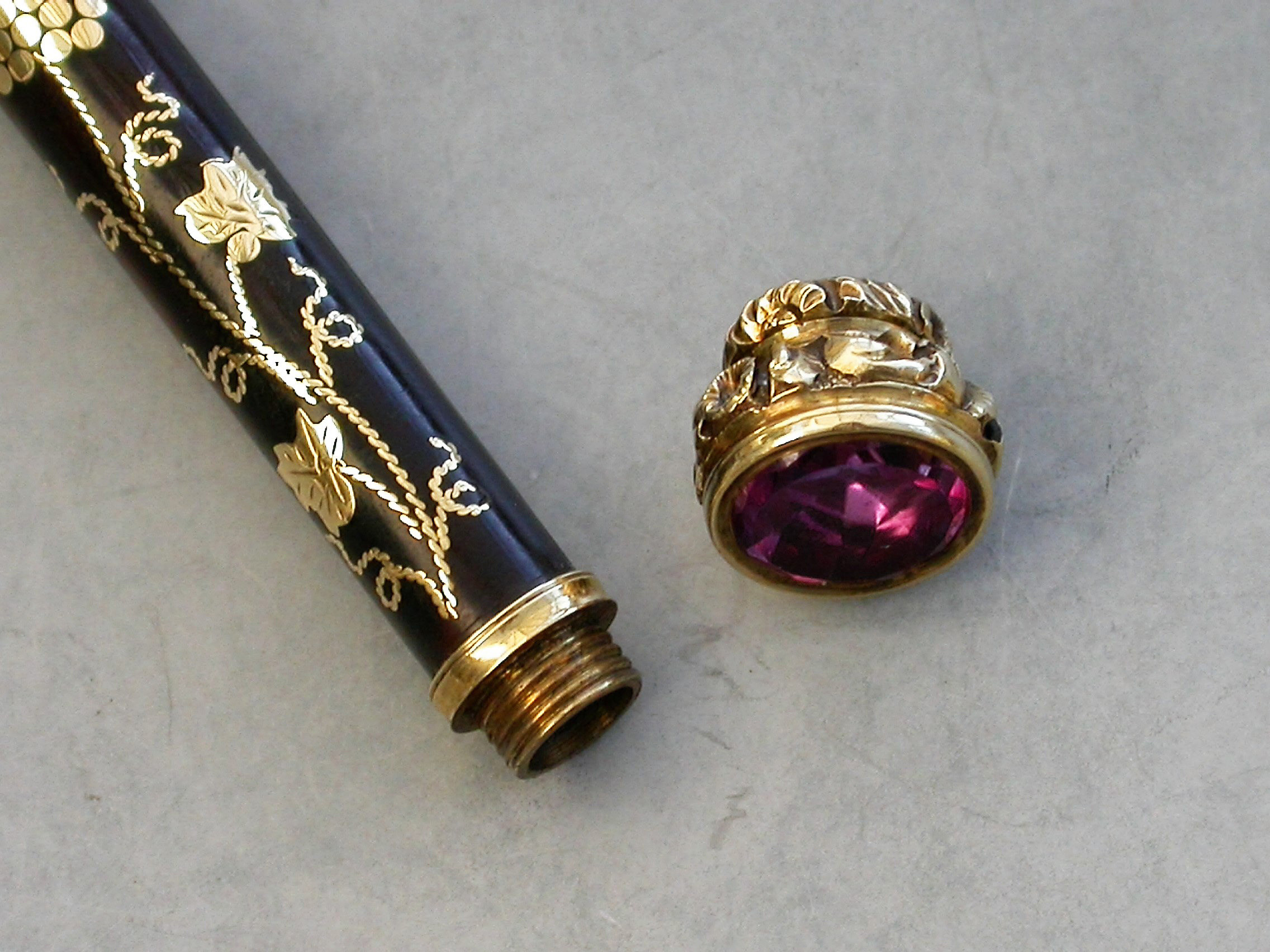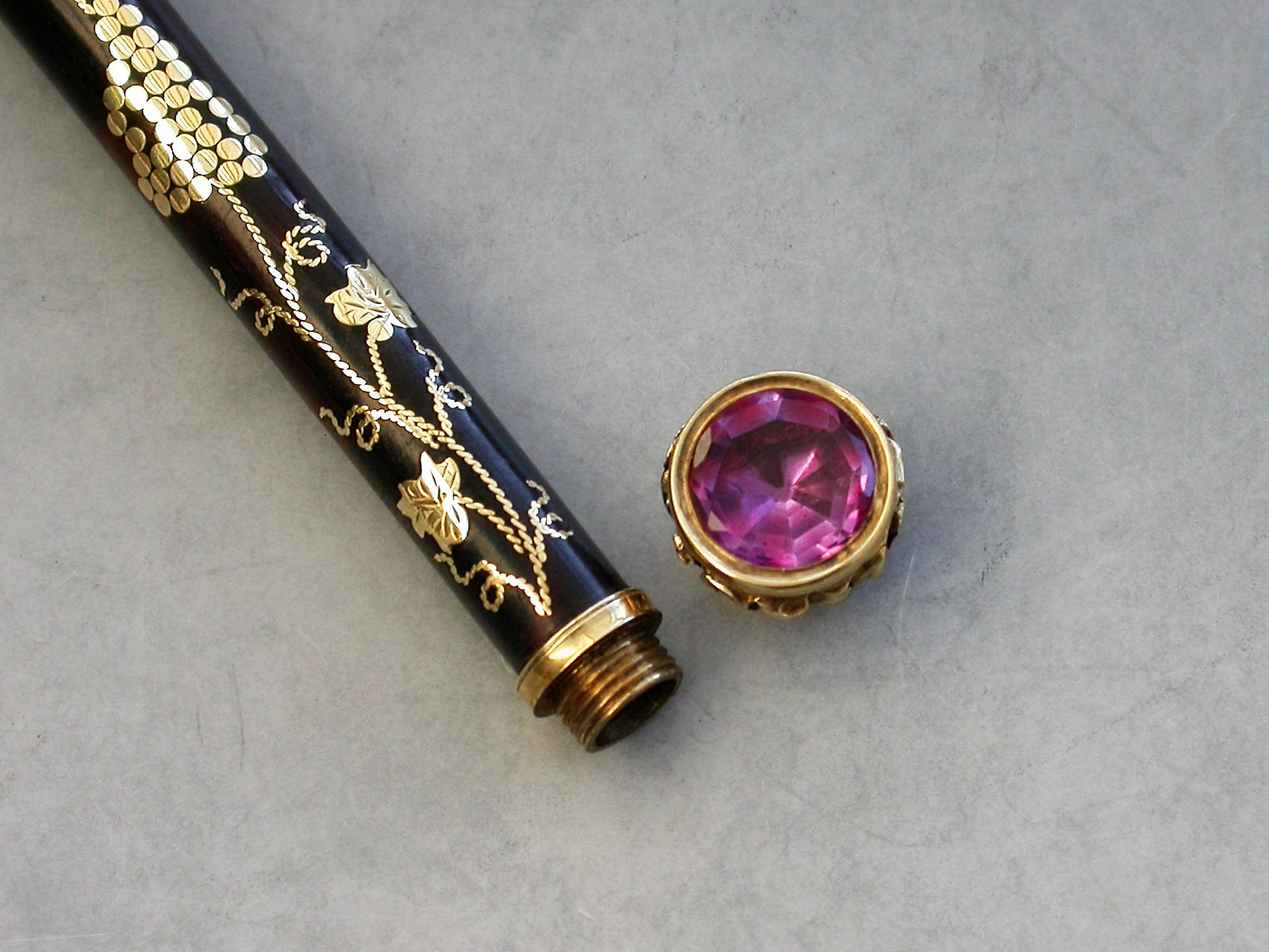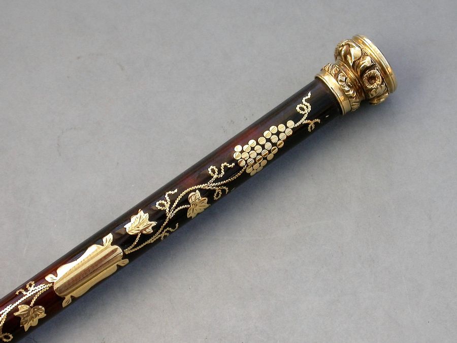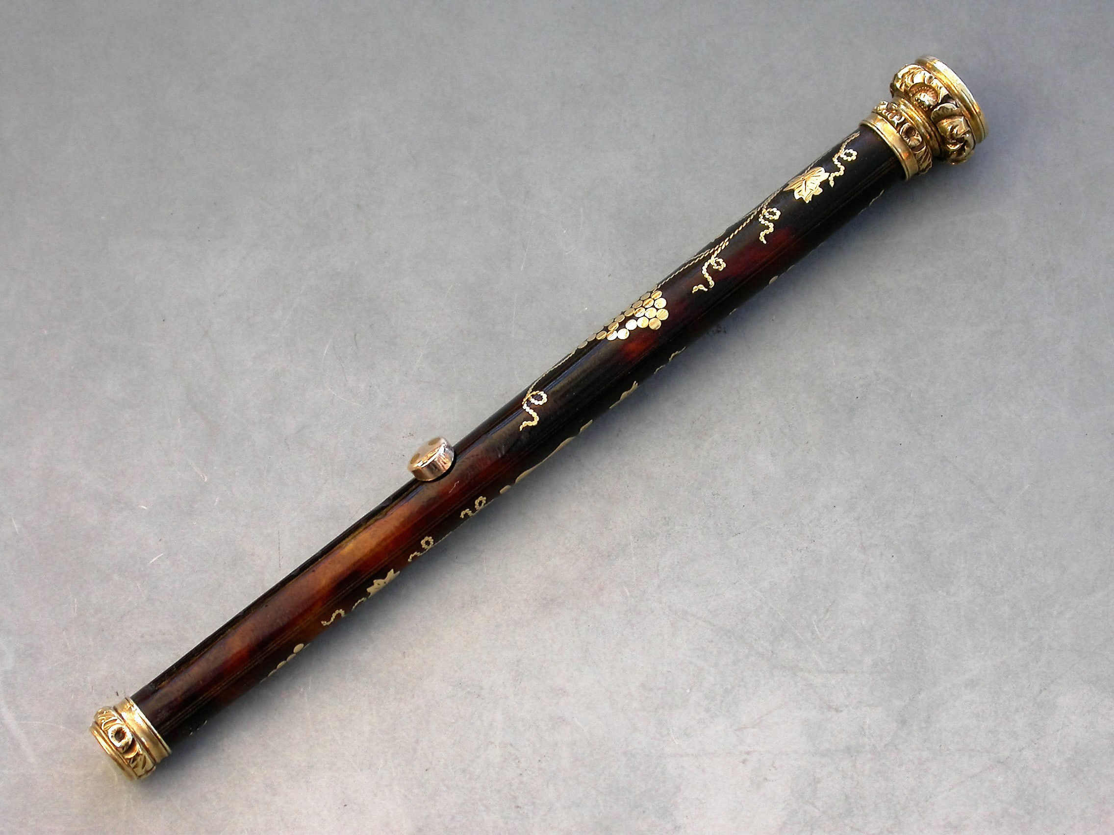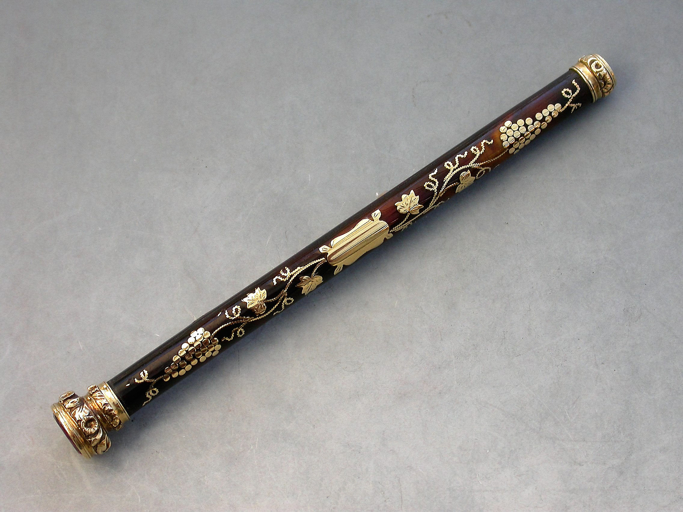 A very fine quality gold mounted tortoiseshell and pique work sliding Propelling Pencil with inlaid vine leaf and grape decoration, the chased terminal set with an amethyst seal stone.