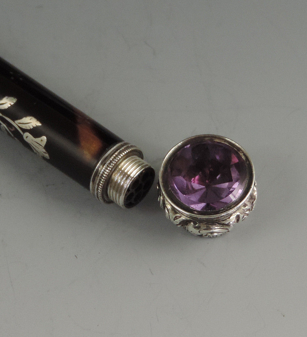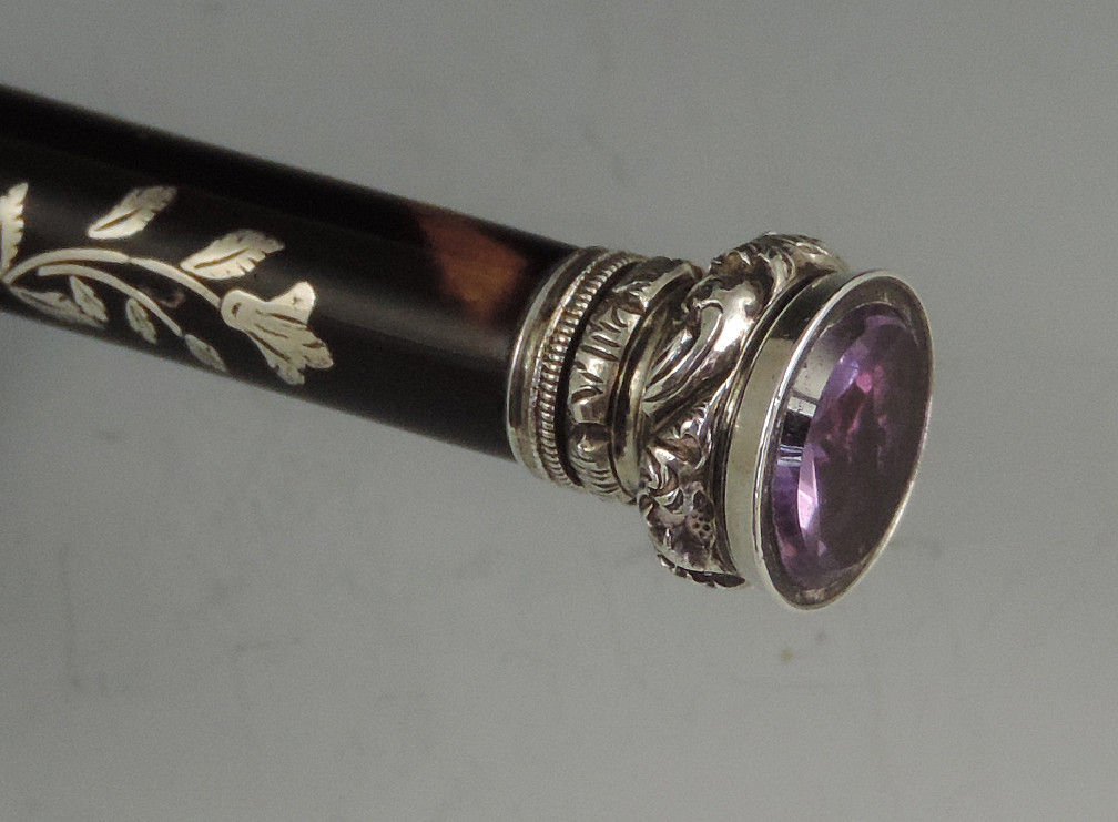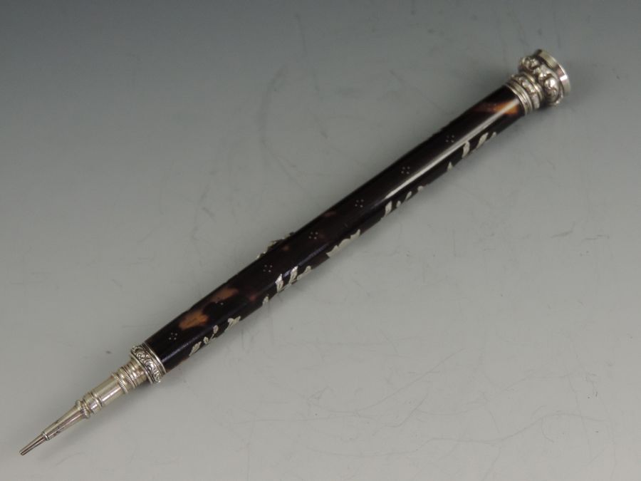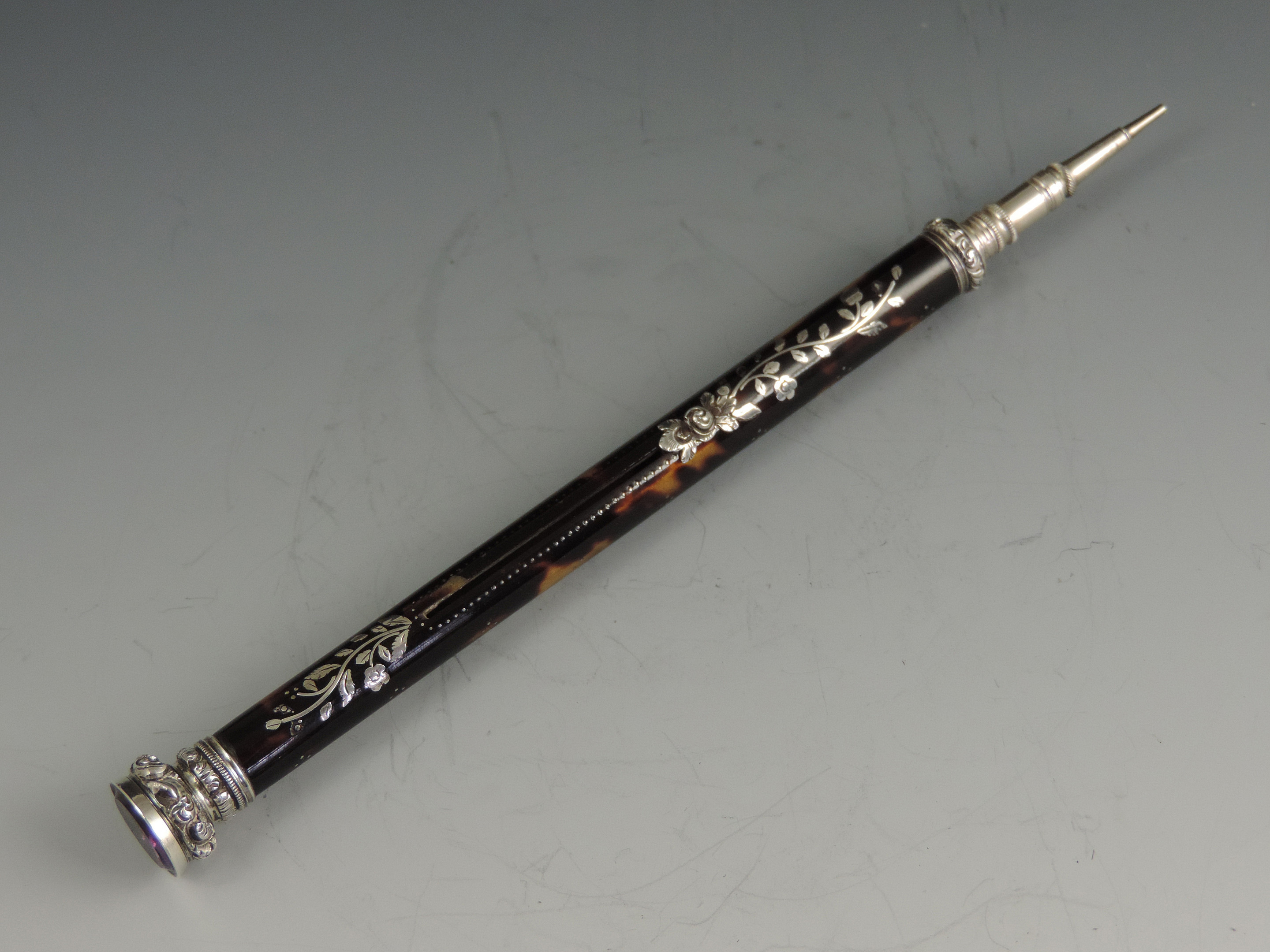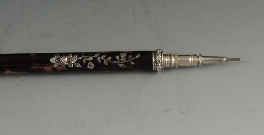 A very fine quality early Victorian silver mounted tortoiseshell Propelling Pencil with inlaid silver pique decoration and silver flower head slider button. The propelling pencil with reinforced nib, the silver finial set with an amethyst coloured stone.