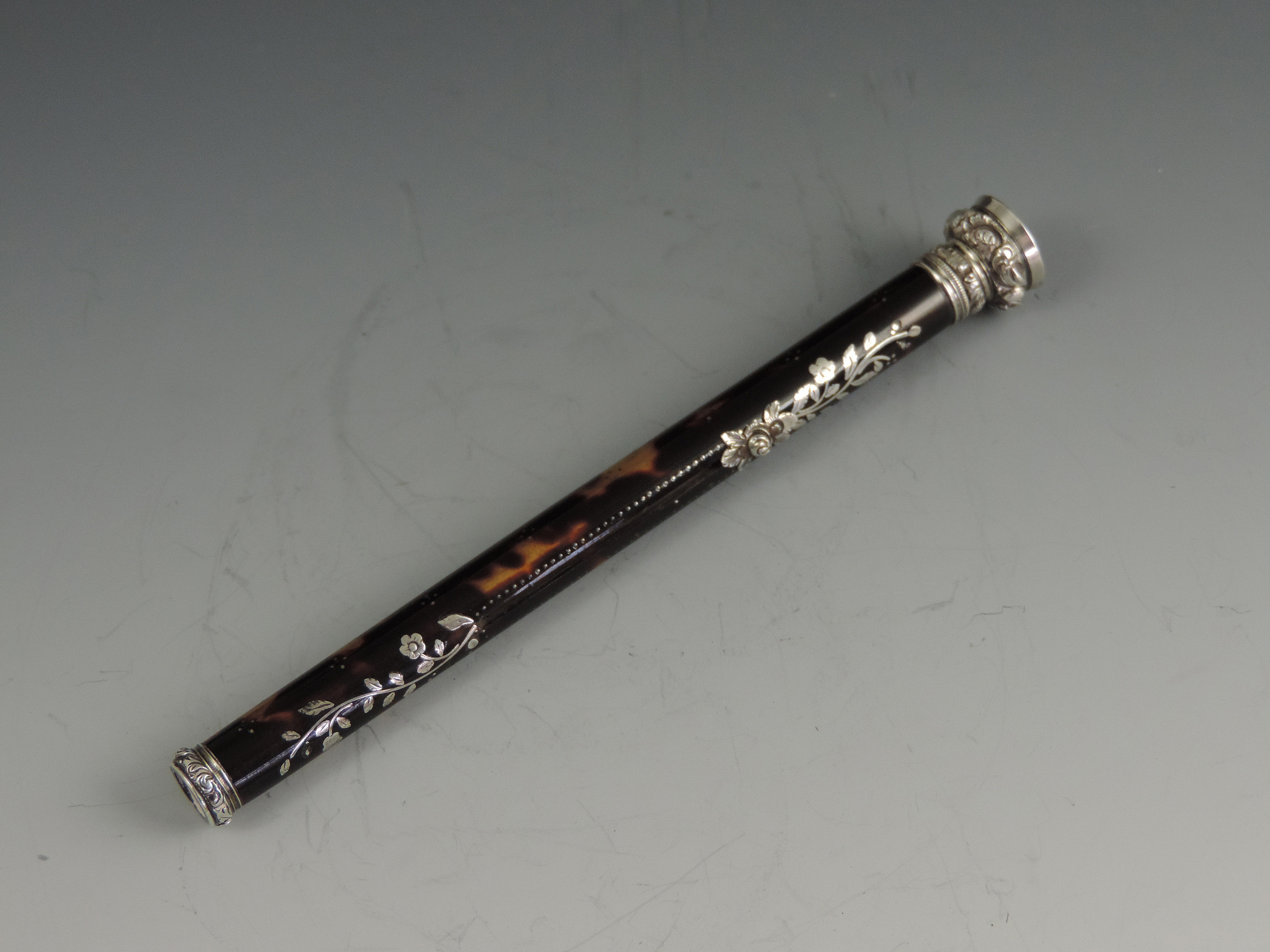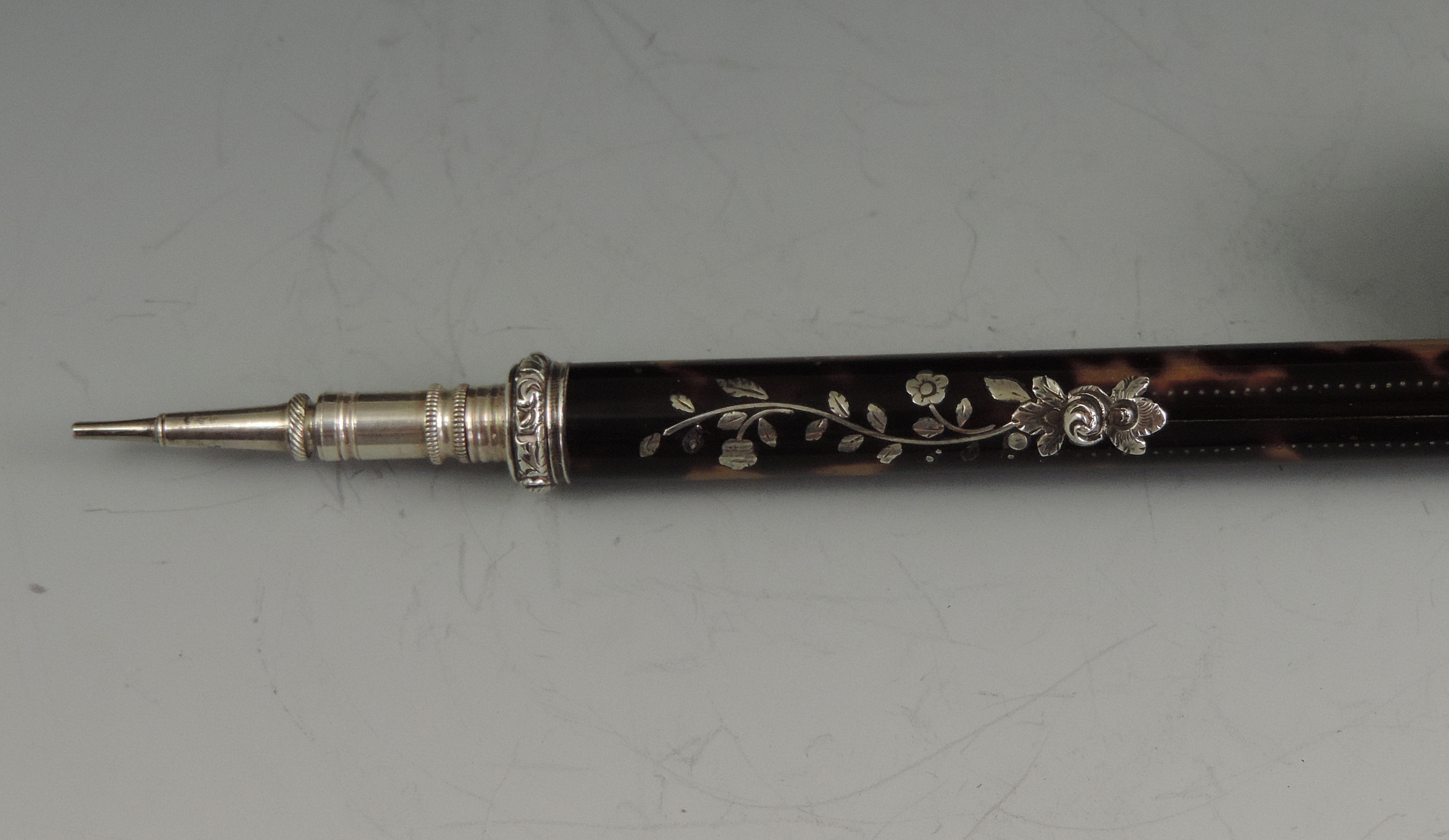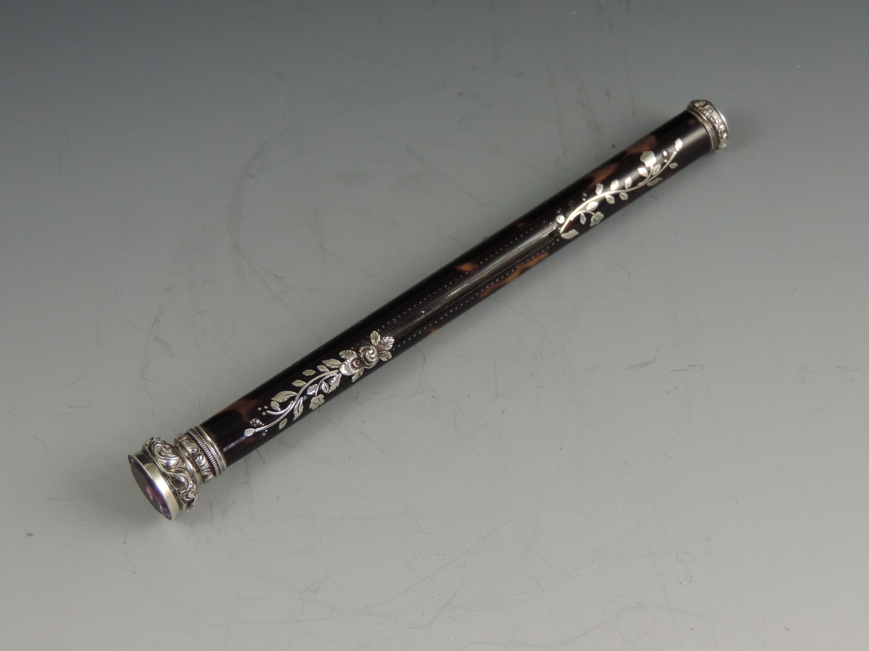 A very fine quality early Victorian silver mounted tortoiseshell Propelling Pencil with inlaid silver pique decoration and silver flower head slider button. The propelling pencil with reinforced nib, the silver finial set with an amethyst coloured stone.