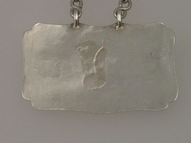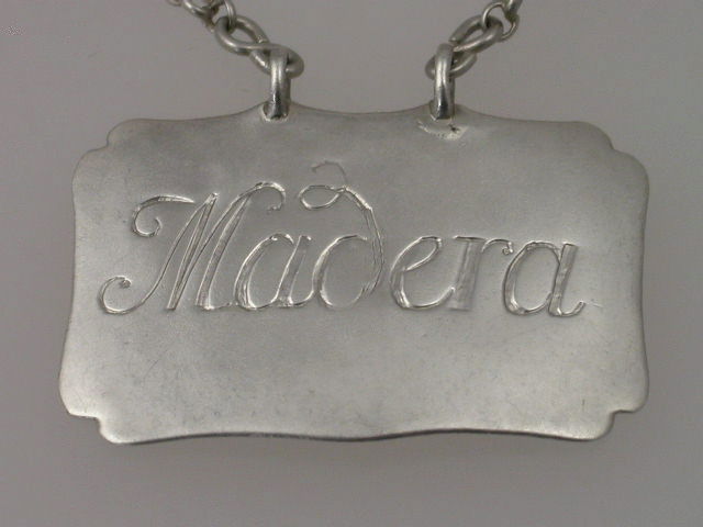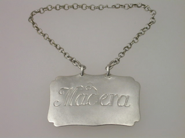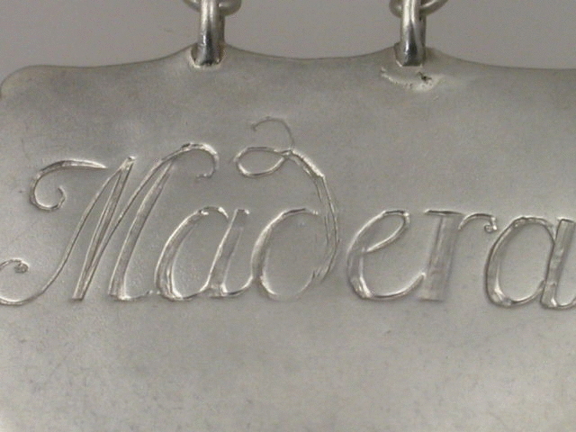 A rare early George II silver Wine Label of plain square escutcheon shape with two attached eyelets to hold the suspension chain, engraved with script lettering for MADERA (A miss spelling of Madeira). The broadly rectangular shape with curved sides and re-entrant corners, similar to furniture of the period, is generally considered to be one of the earliest designs of silver Wine Labels dating from around c1735.