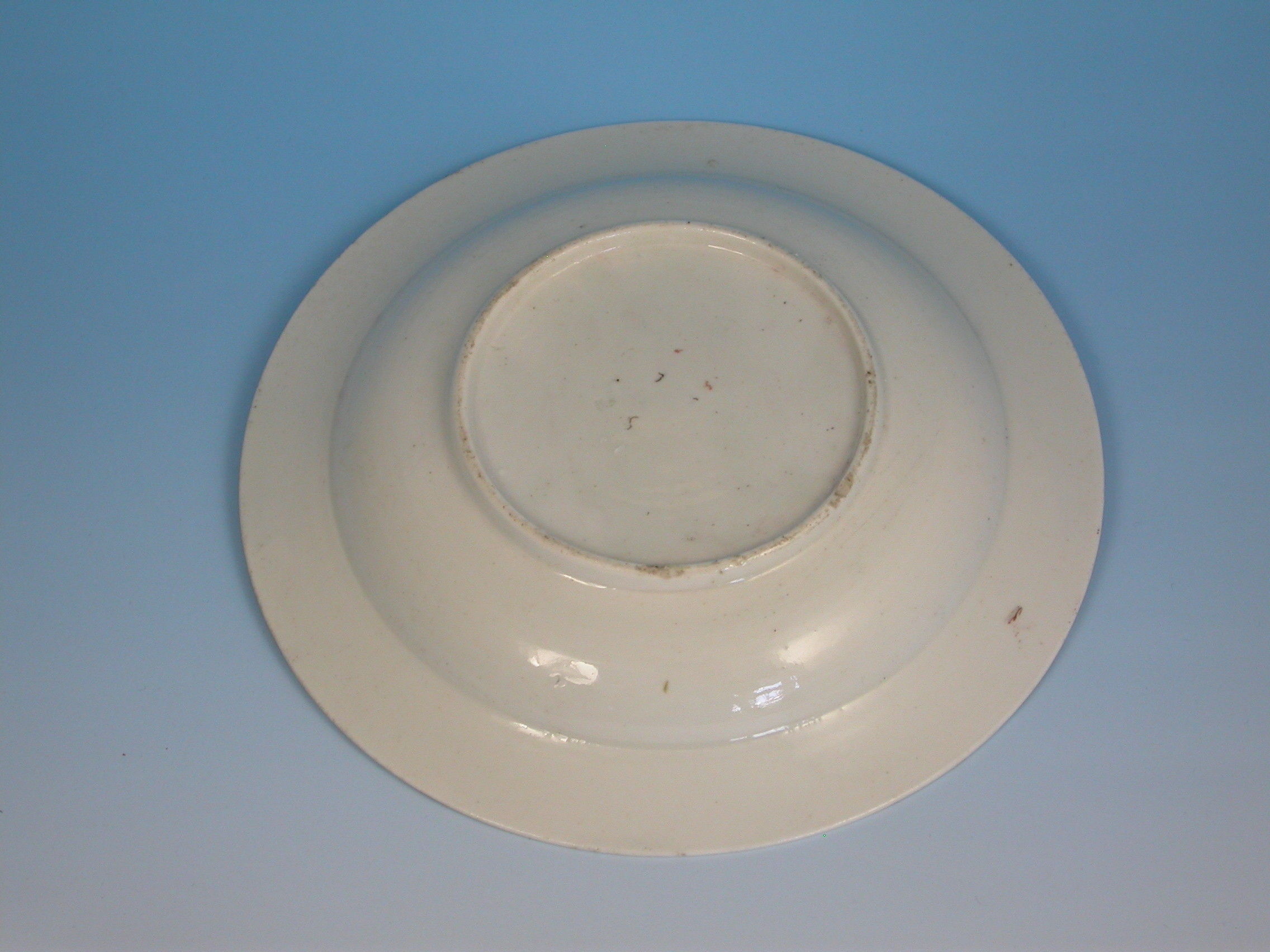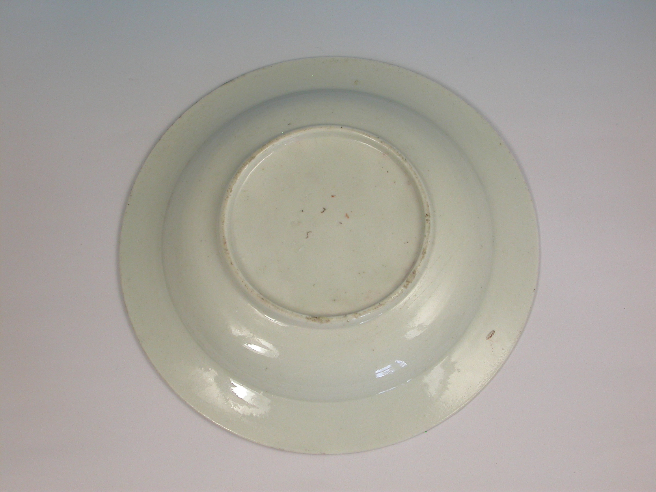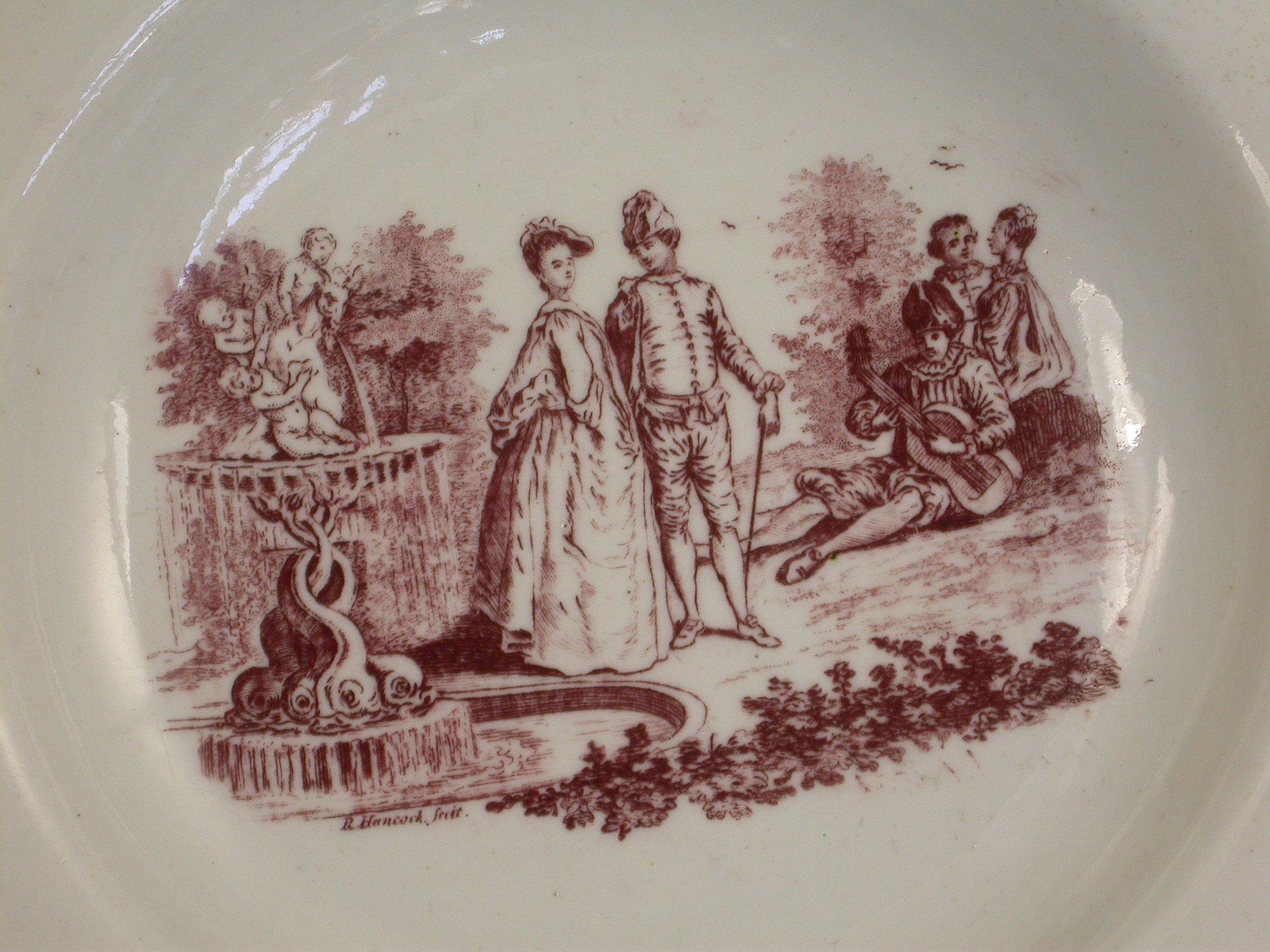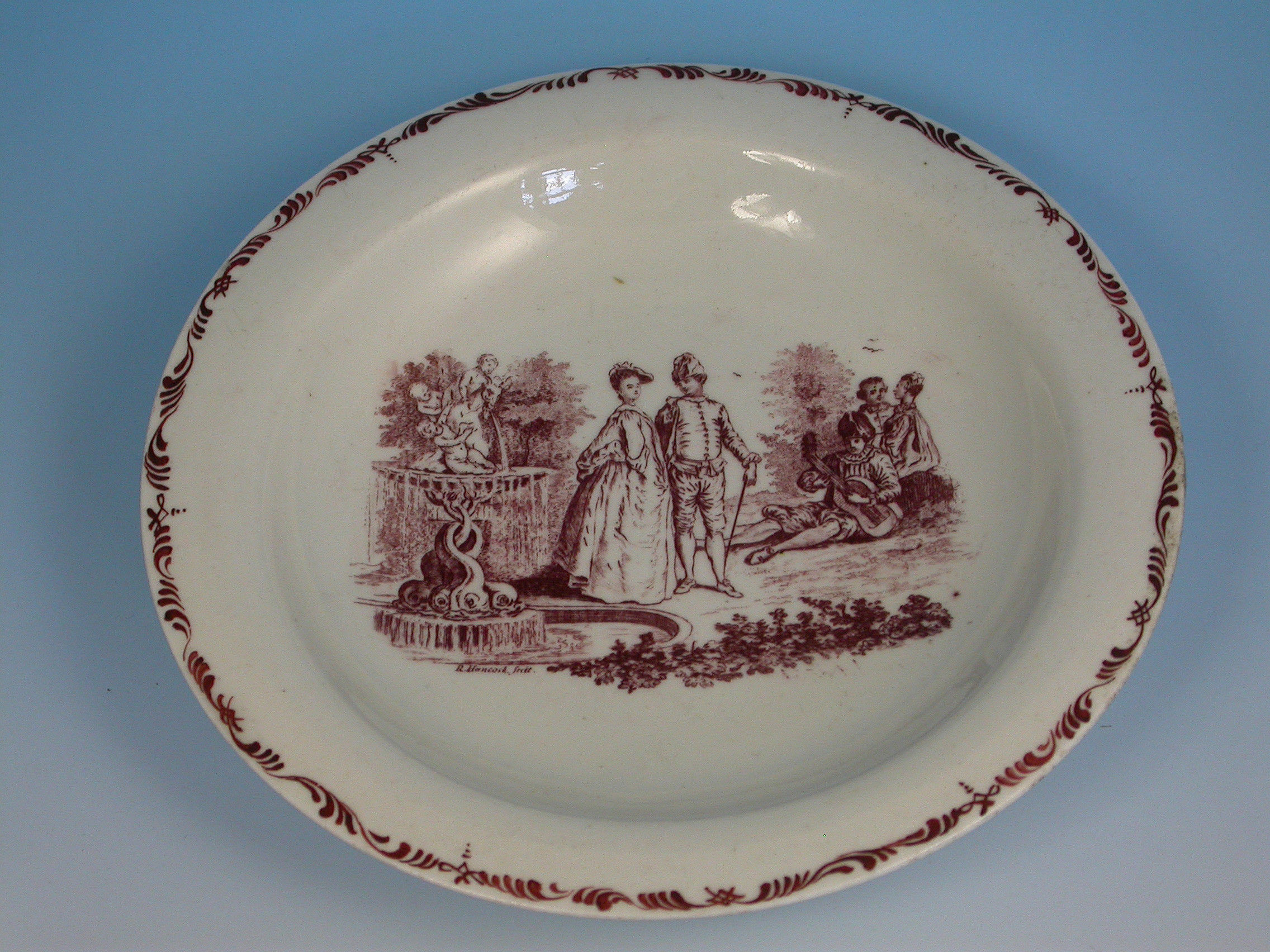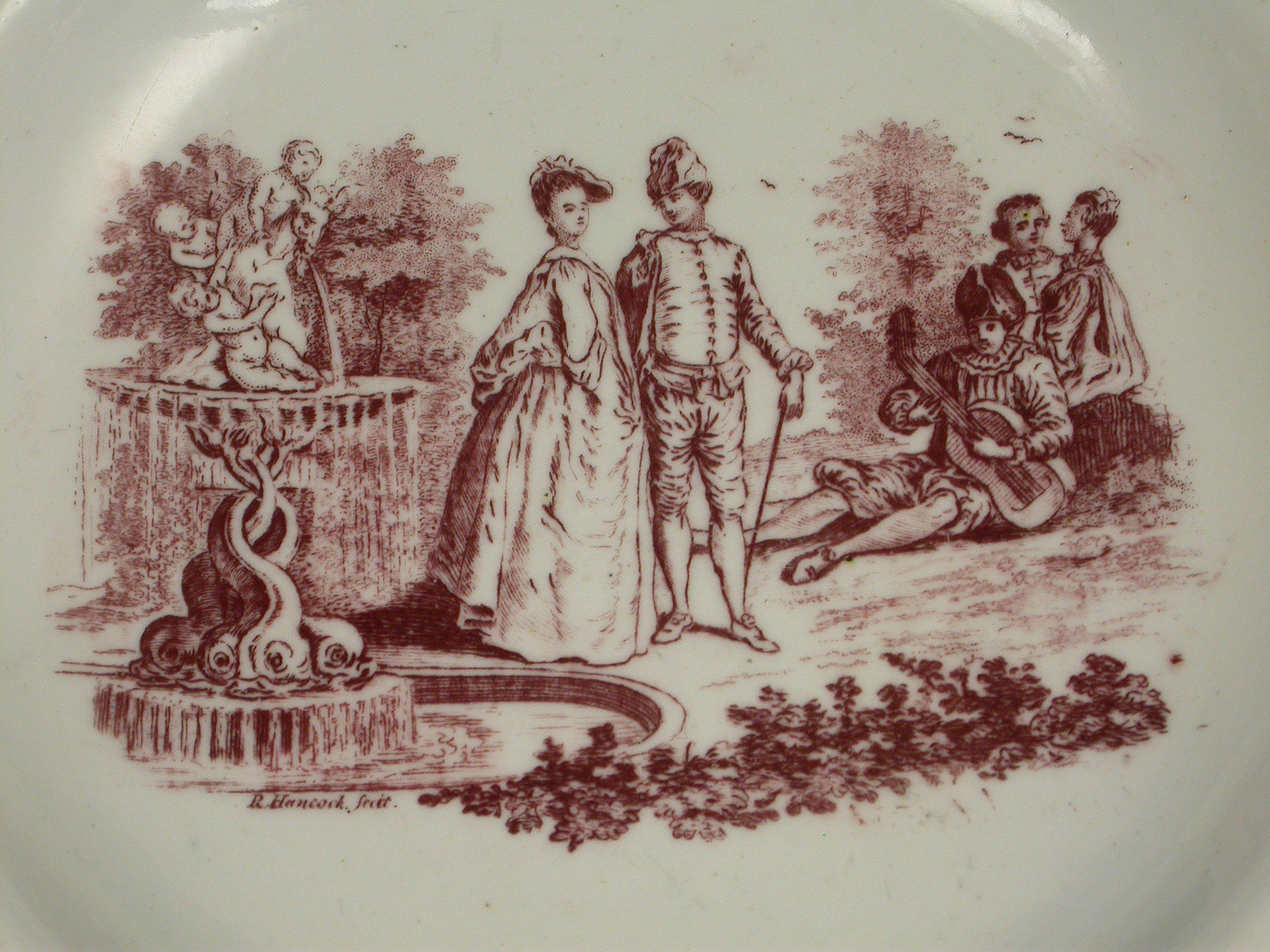 A fine and rare Early Worcester small deep plate, printed in iron red with ""La Cascade"", depicting a gentleman and lady courtier standing by a fish pond with running water font and musicians in the background, all within a trailing scroll border.