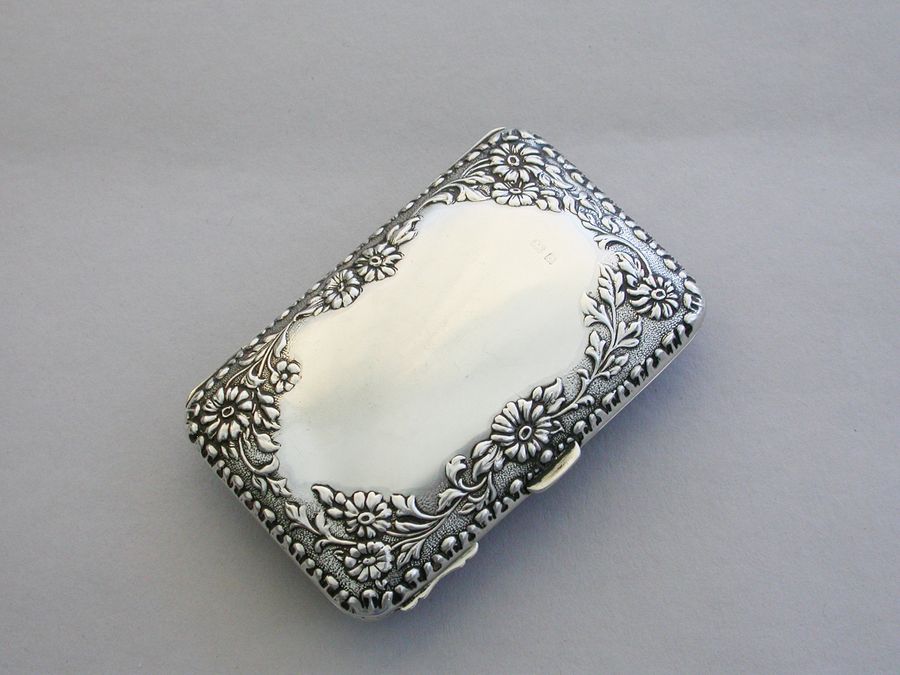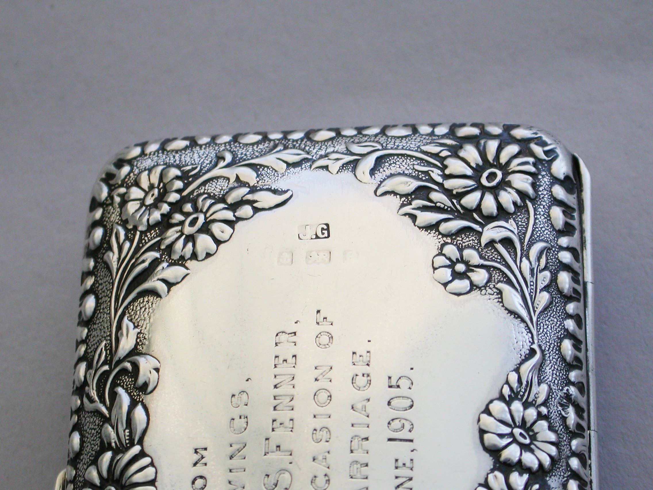 An Edwardian silver Purse of domed rounded rectangular form, the borders embossed with floral decoration, hinging open to a blue silk and velvet lined fitted interior containing a set of four silver Maundy Money Coins dated 1905 and two Edwardian full gold Sovereigns dated 1903 & 1905. The lid engraved with a contemporary presentation inscription.