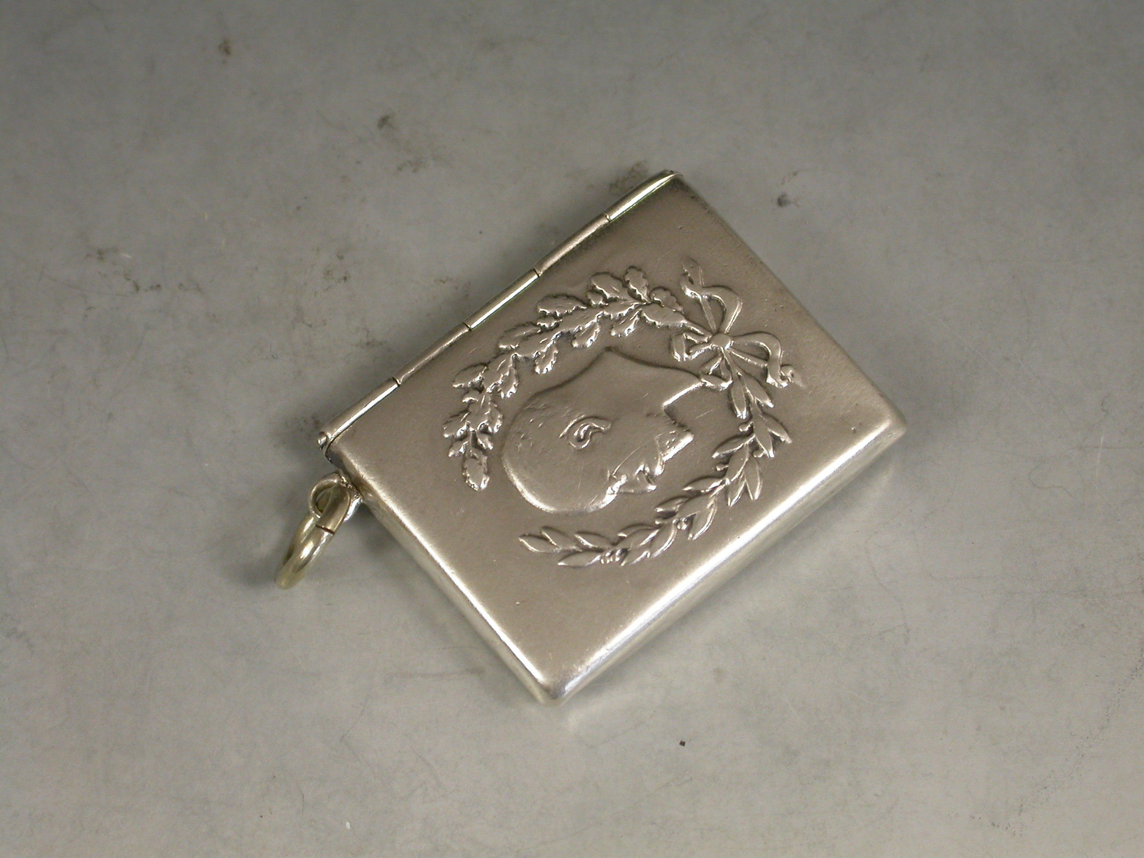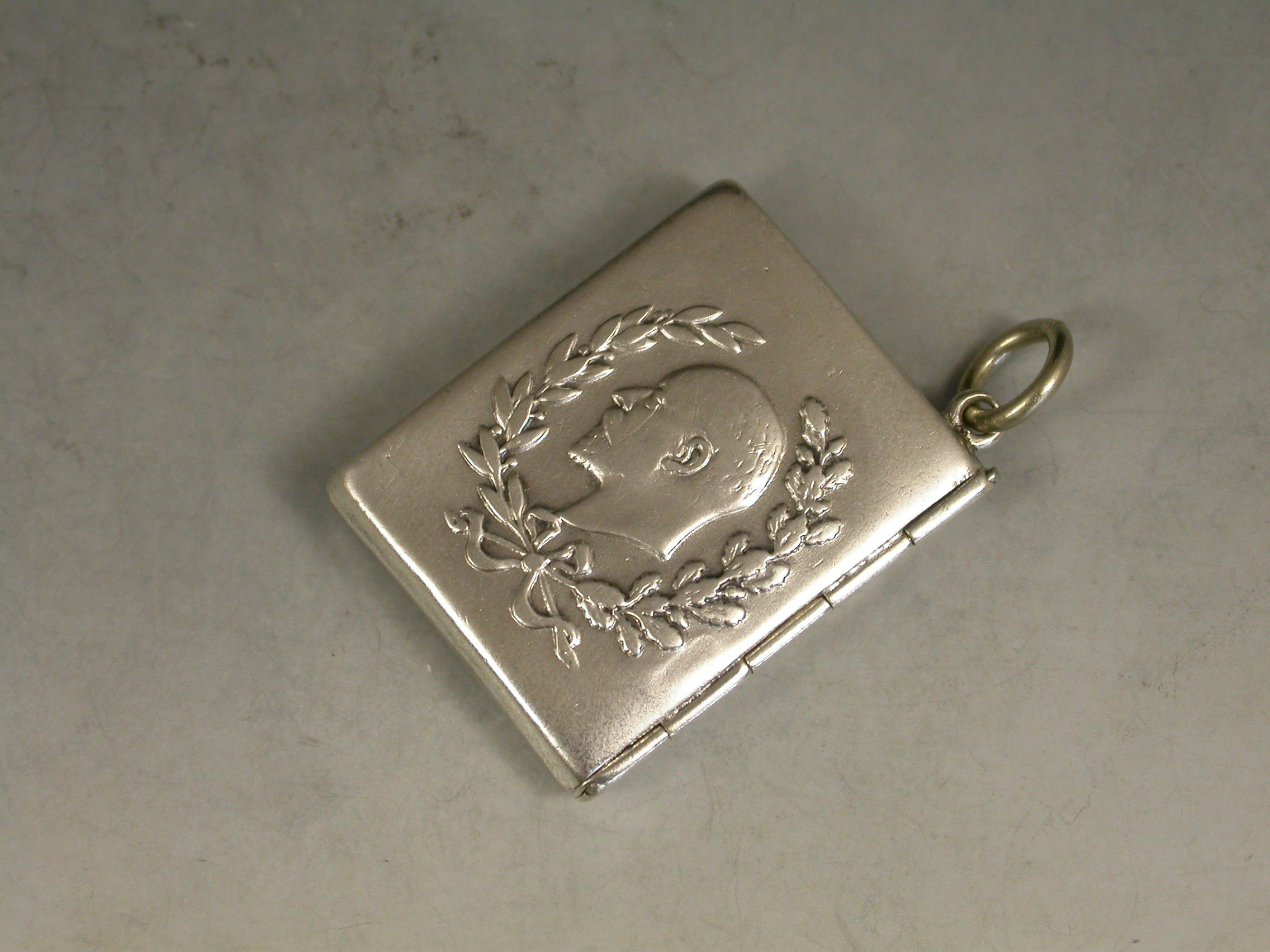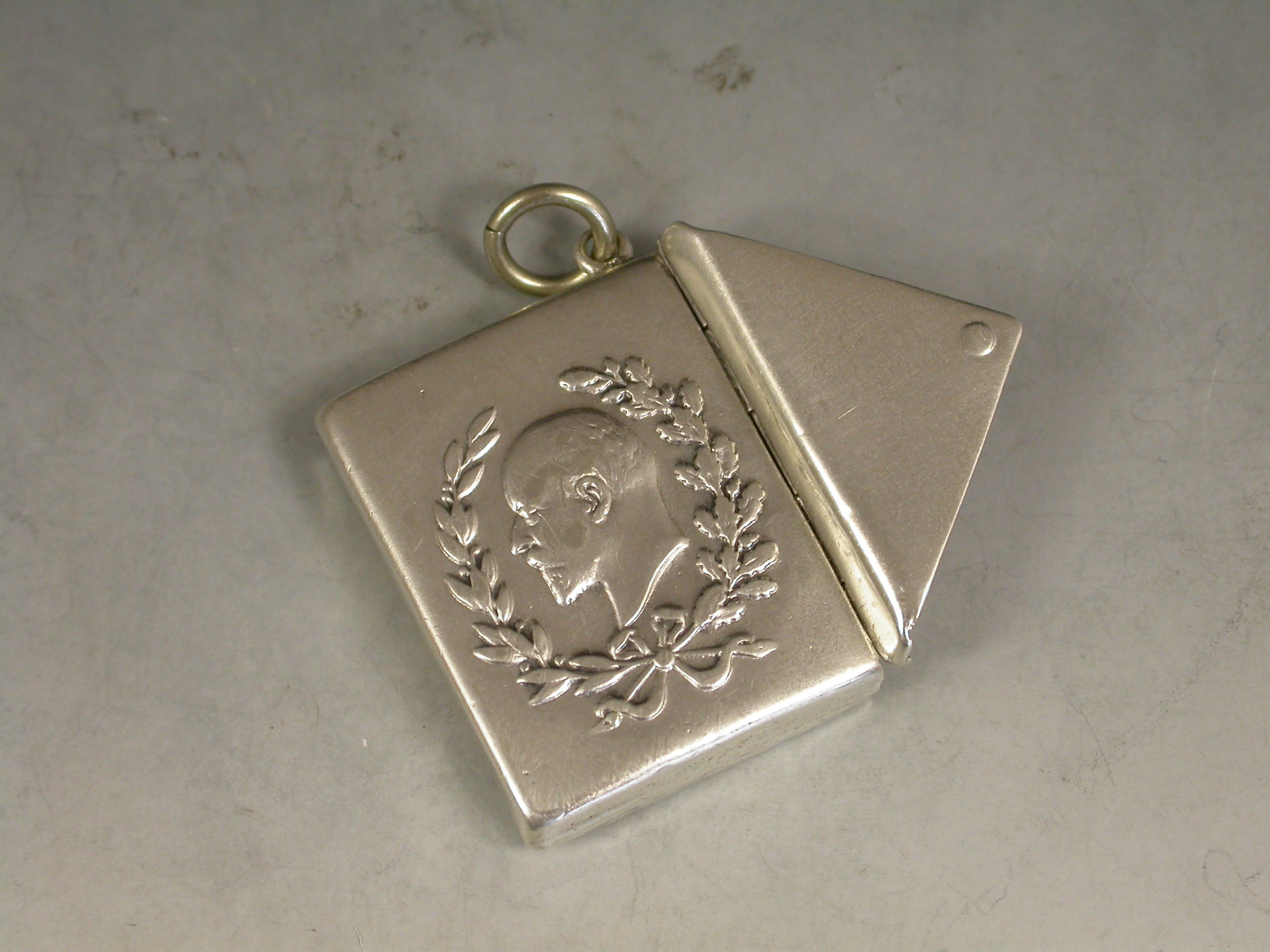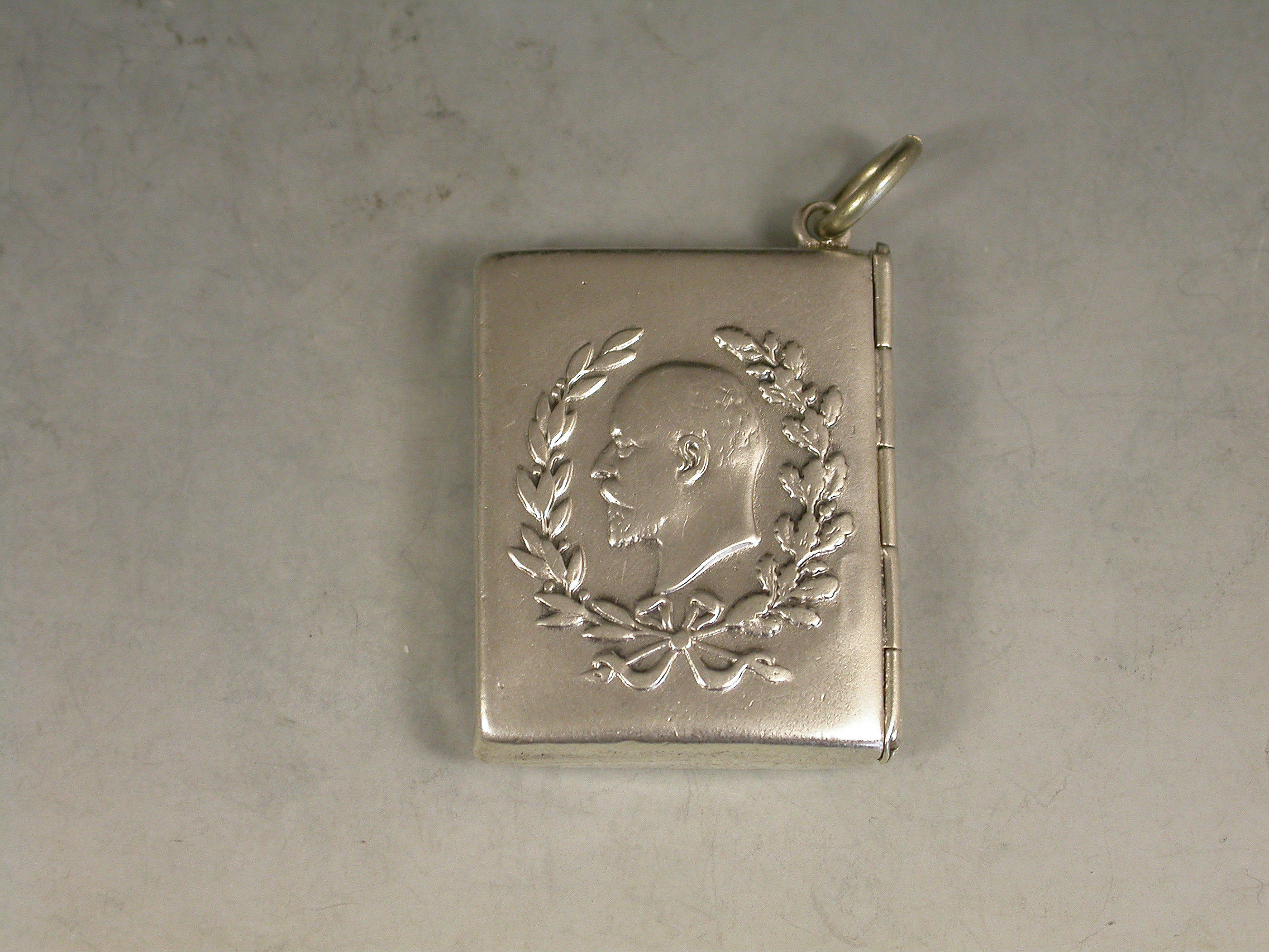 A rare Edward VII commemorative silver Stamp Case of envelope form with attached suspension ring, the cover embossed with a bust of Edward between oak and laurel leaves. Made to commemorate his accession in 1901.