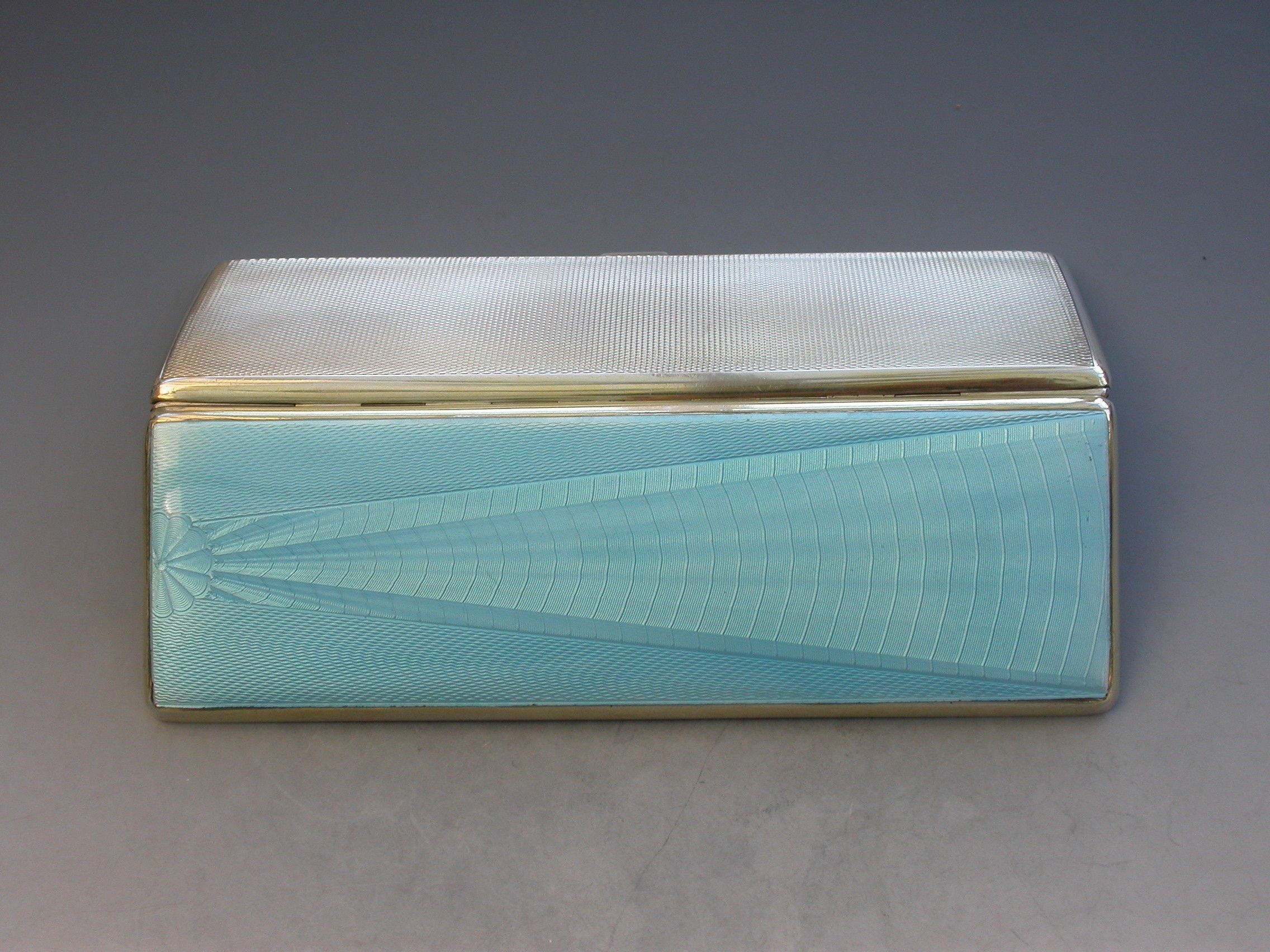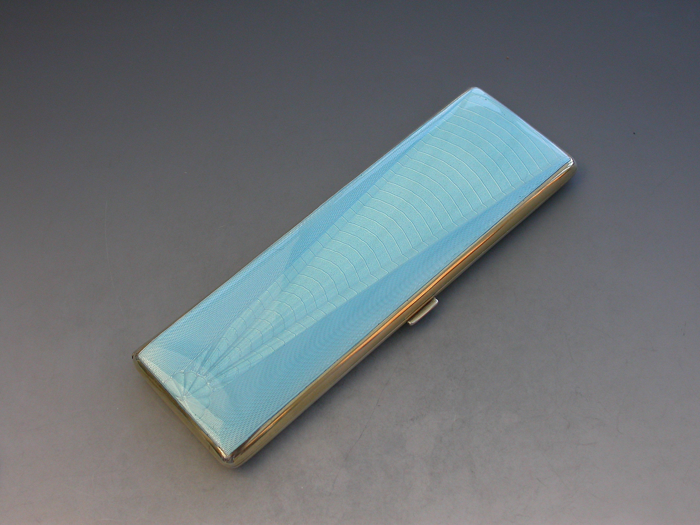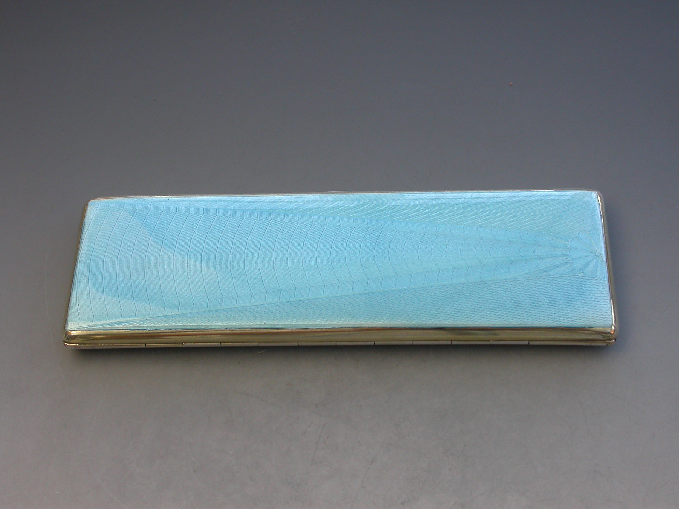 A good quality Edward VIII sky blue guilloche enamel and silver long Cigarette Case with engine turned base and silver gilt interior. Engraved with a presentation inscription.