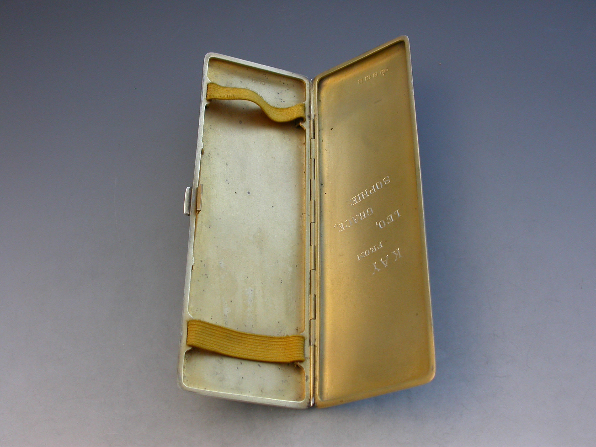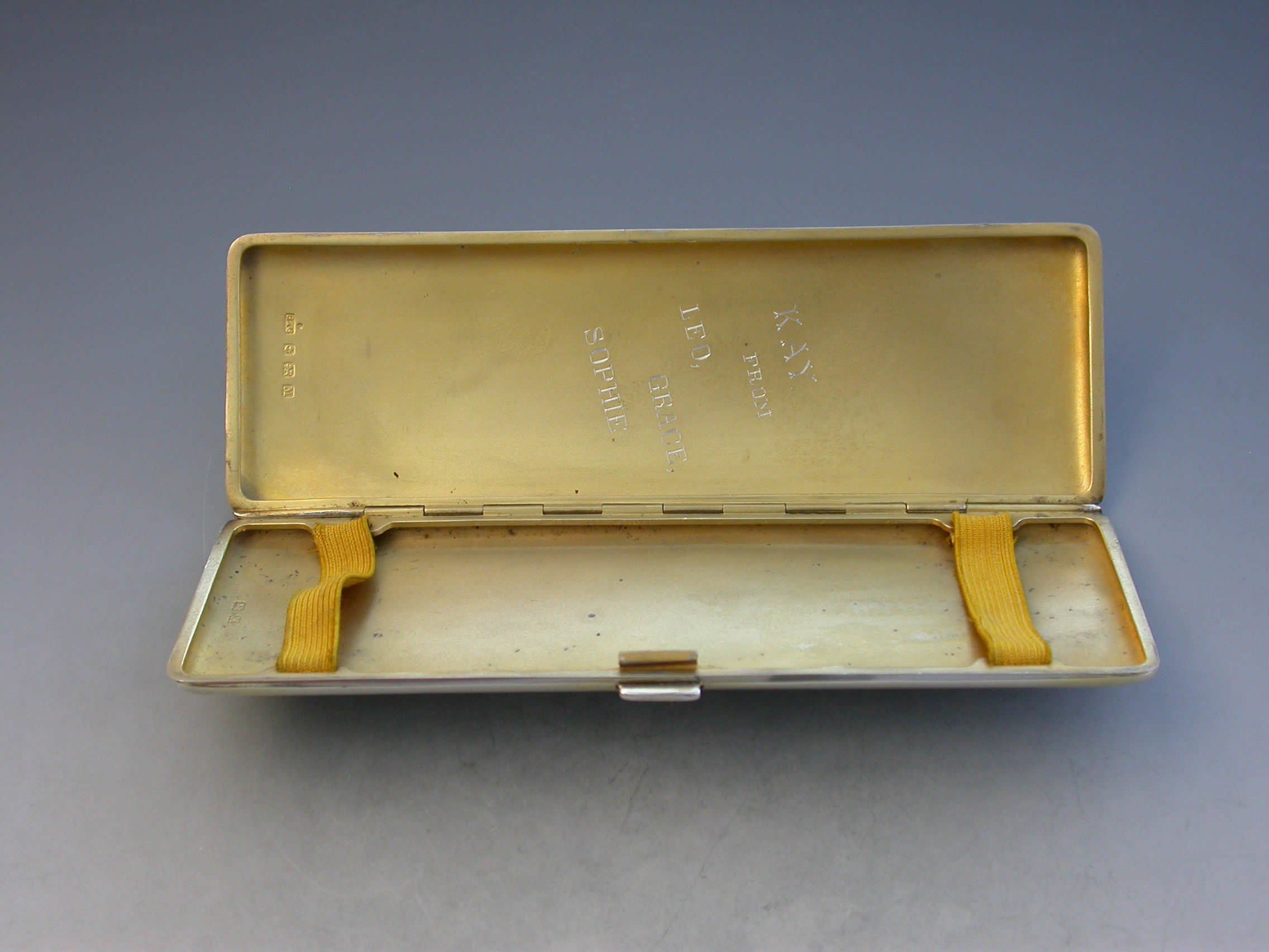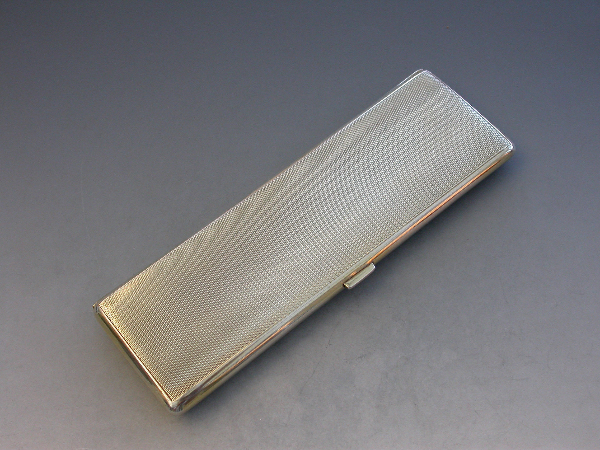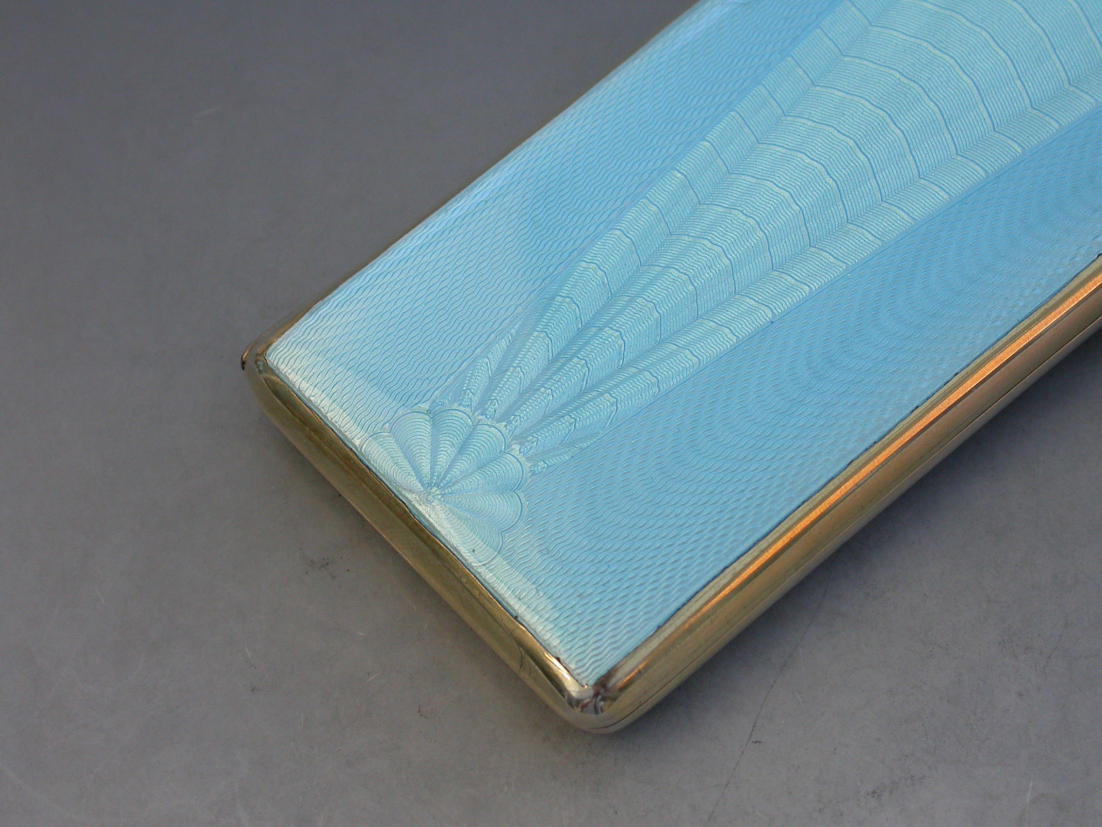 A good quality Edward VIII sky blue guilloche enamel and silver long Cigarette Case with engine turned base and silver gilt interior. Engraved with a presentation inscription.